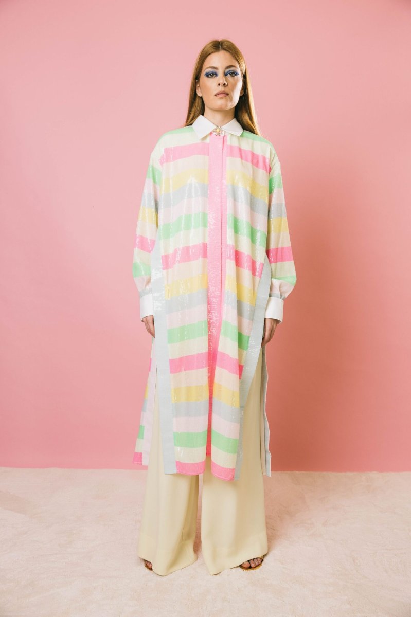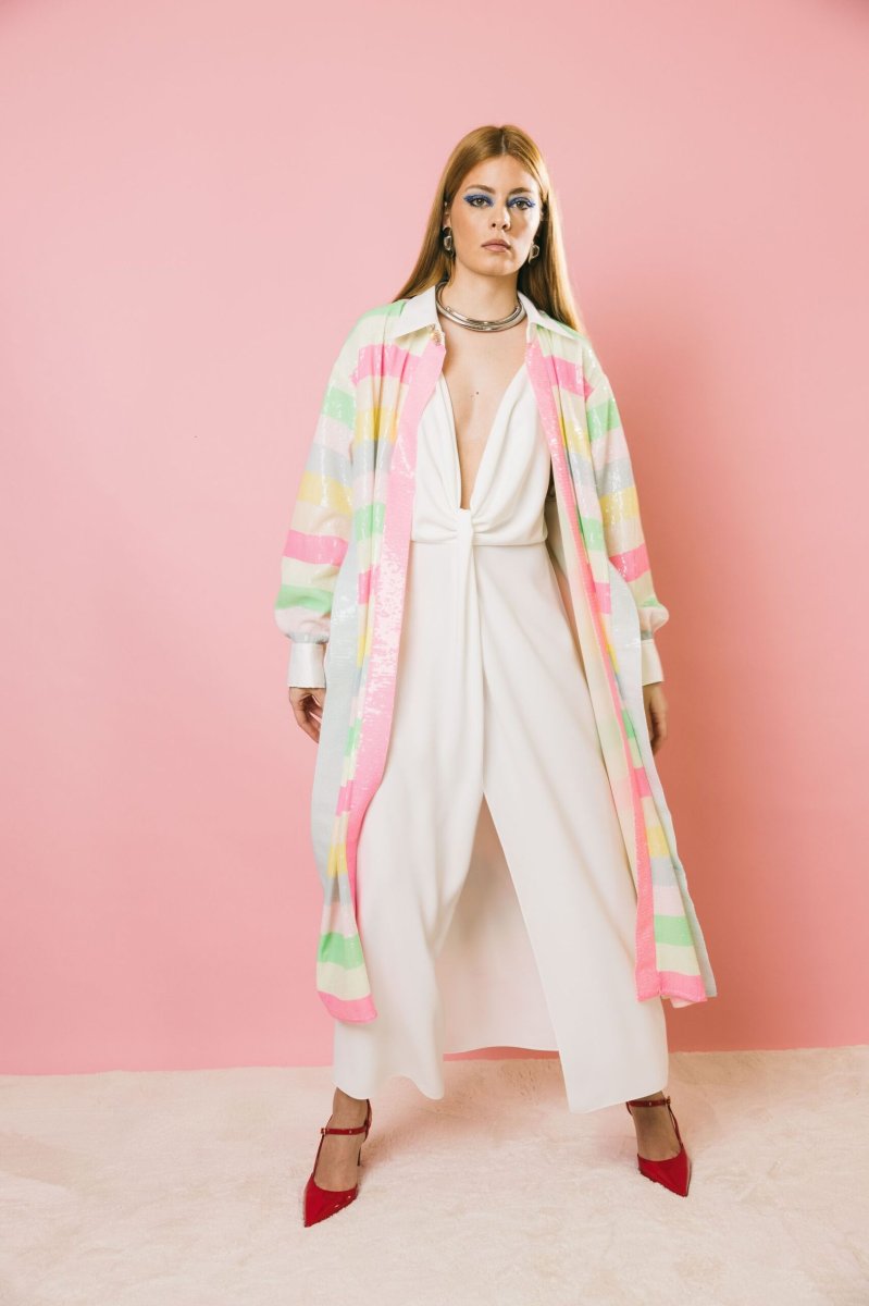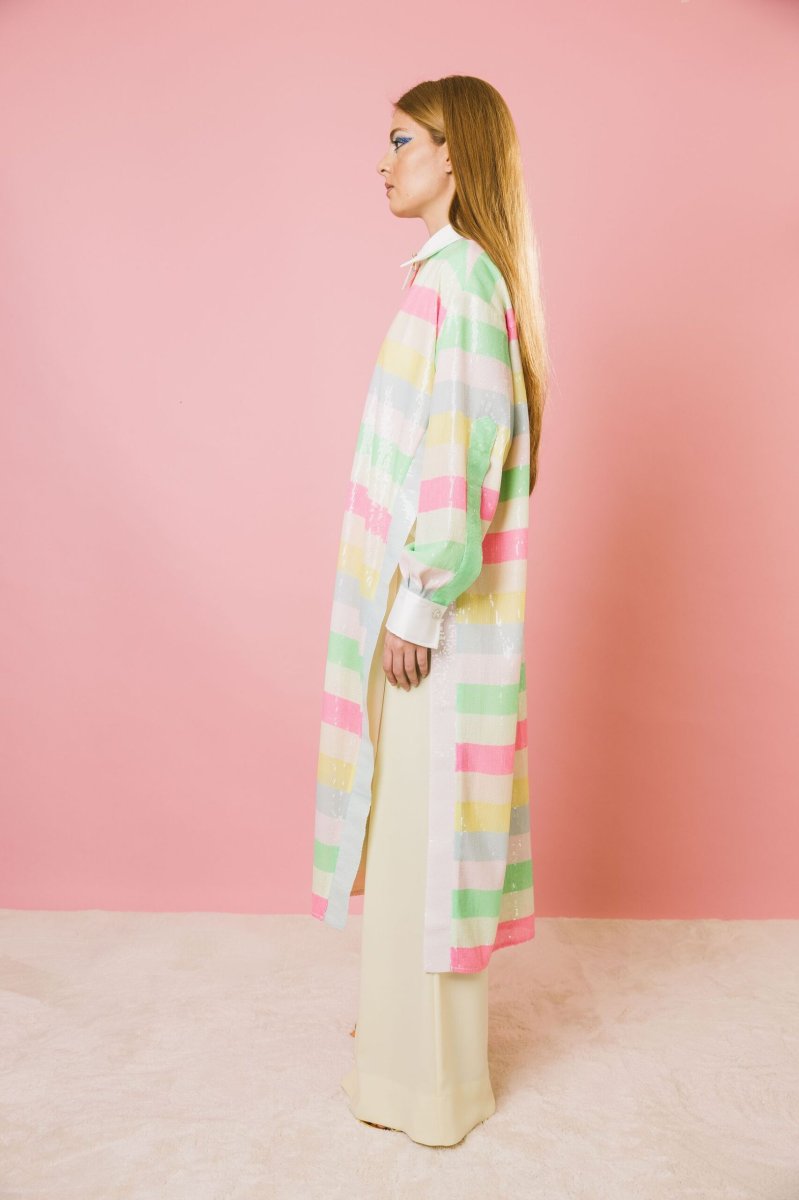 Spolvero lungo dal fascino esclusivo, realizzato in uma preziosa micro paillettes multicolor a righe, dalle tonalità luminose ed eleganti. Il design aperto, sia sul davanti che sui lati, dona leggerezza e movimento, mentre il collo e le maniche in stile camicia aggiungono un tocco di raffinatezza. I bottoni gioiello ne esaltano l’eleganza, rendendolo perfetto per occasioni speciali, ma anche per chi desidera un look ricercato e personale. Splendido abbinato a capi sofisticati, si presta anche a interpretazioni più informali, esaltando con carattere anche un semplice paio di jeans.