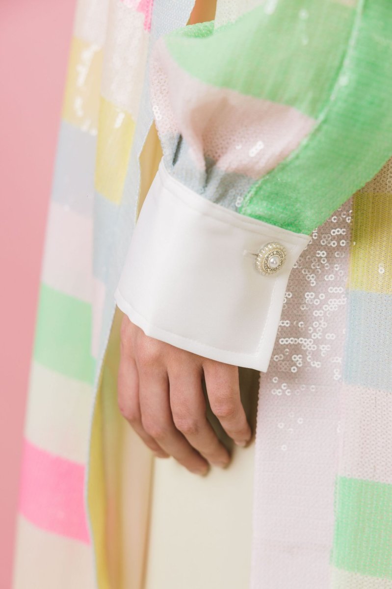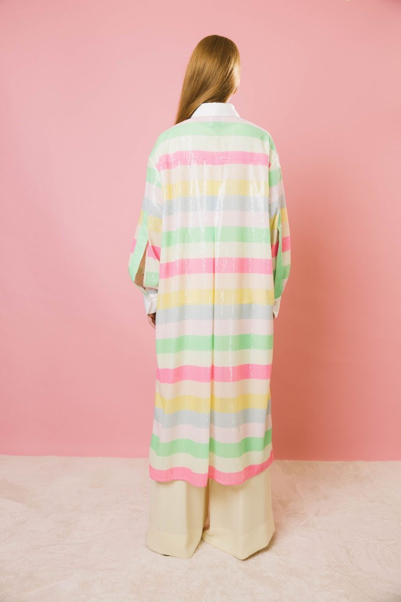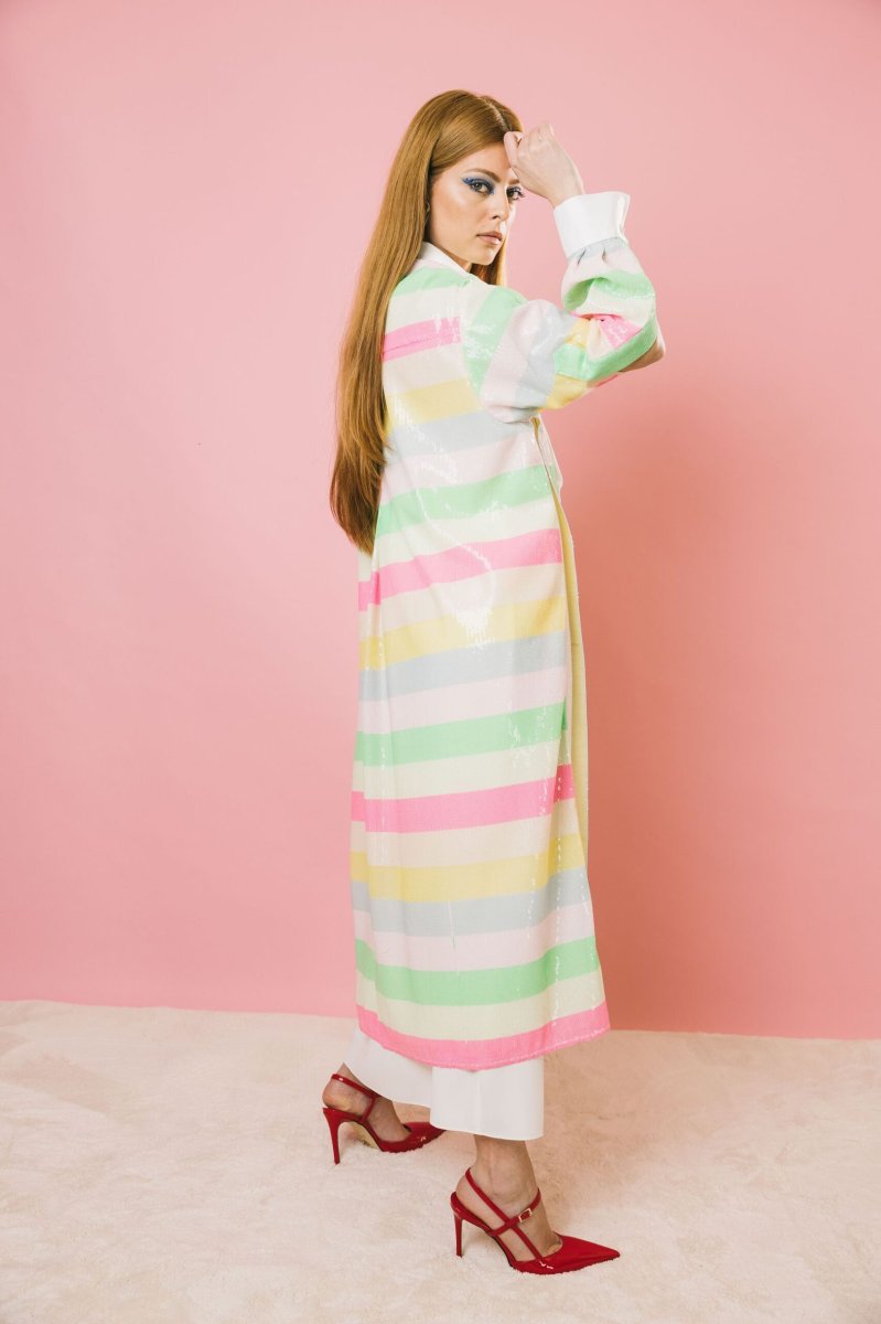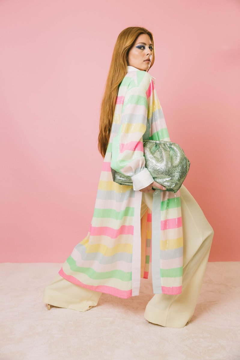 Spolvero lungo dal fascino esclusivo, realizzato in uma preziosa micro paillettes multicolor a righe, dalle tonalità luminose ed eleganti. Il design aperto, sia sul davanti che sui lati, dona leggerezza e movimento, mentre il collo e le maniche in stile camicia aggiungono un tocco di raffinatezza. I bottoni gioiello ne esaltano l’eleganza, rendendolo perfetto per occasioni speciali, ma anche per chi desidera un look ricercato e personale. Splendido abbinato a capi sofisticati, si presta anche a interpretazioni più informali, esaltando con carattere anche un semplice paio di jeans.