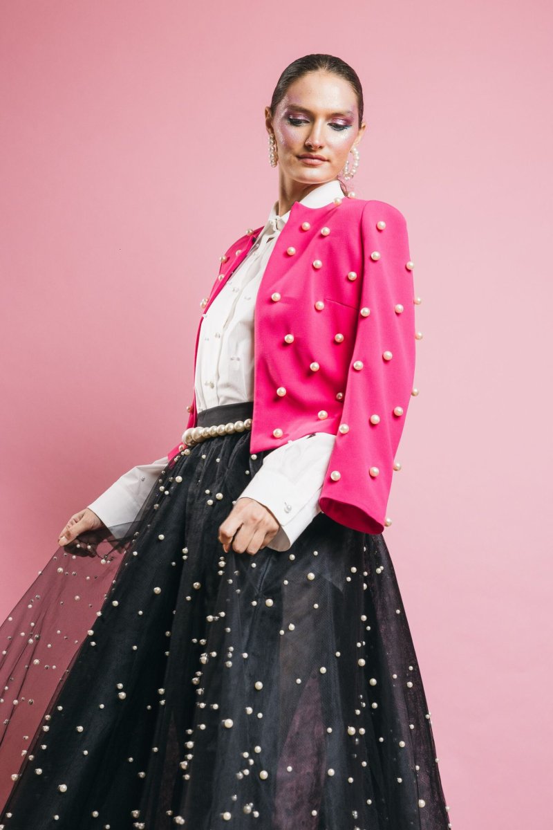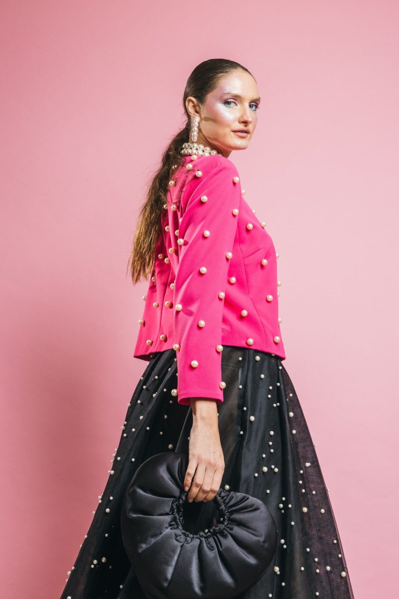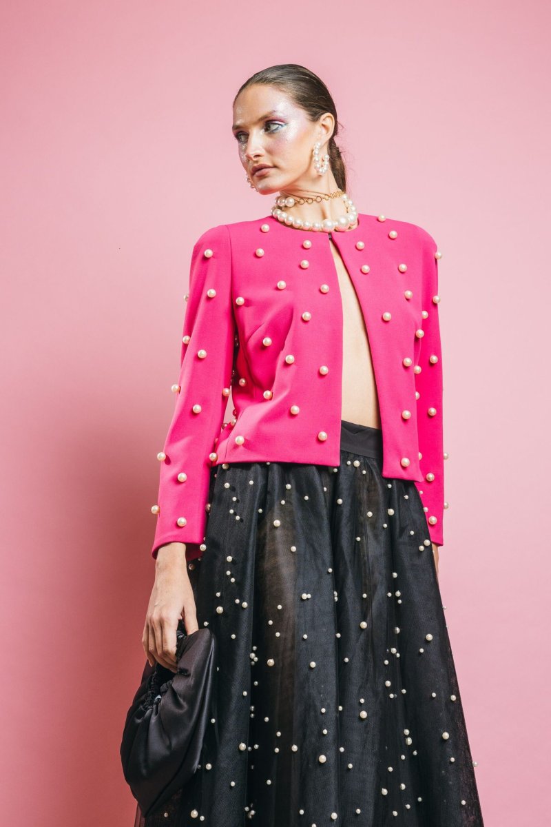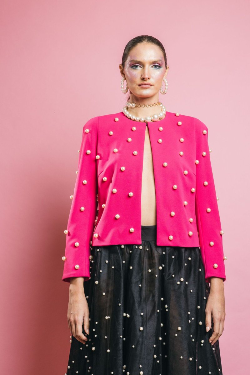 Giacca corta con dettaglio caratterizzato da perle applicate su tutta la superficie, il capo perfetto per completare con classe ed eleganza i vostri outfit importanti, ma perfetta per aggiungere stile e carattare anche ad un paio di jeans e t-shirt bianca. Insomma un capo capace di rendere speciale qualsiasi outfit.