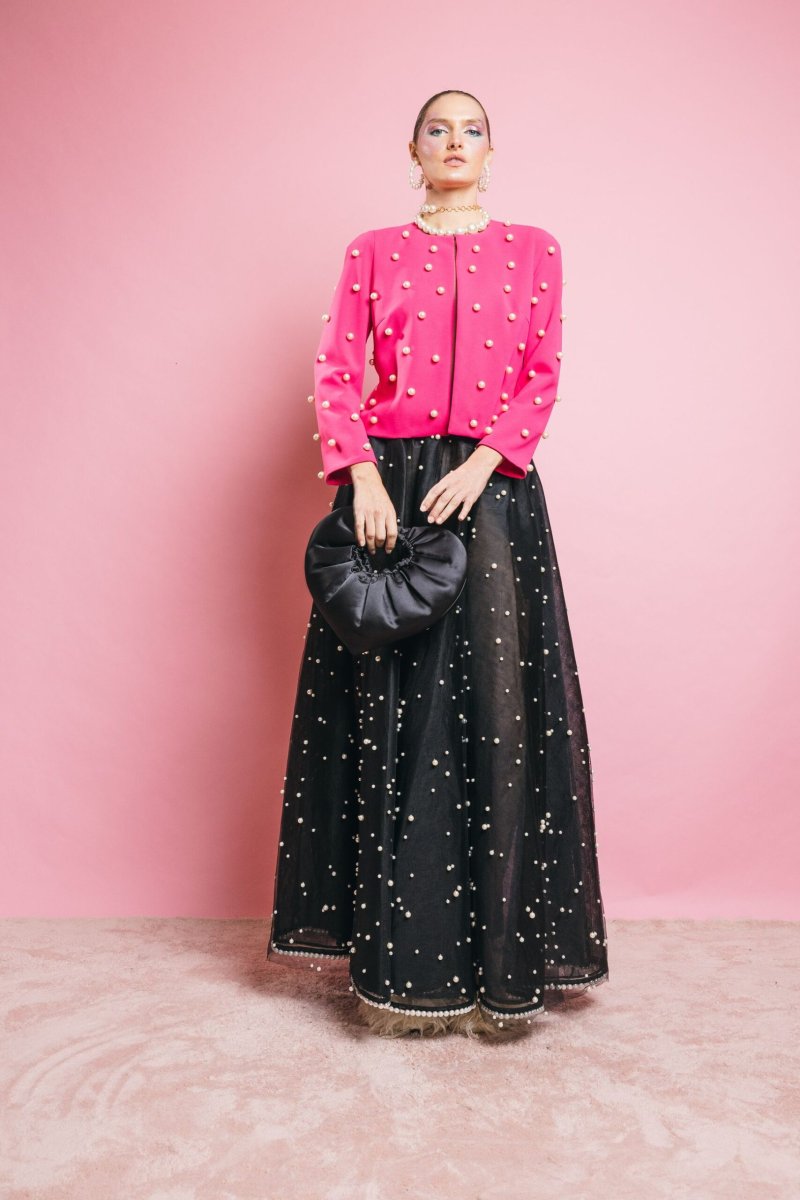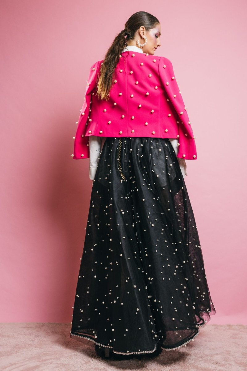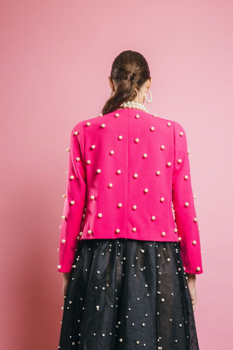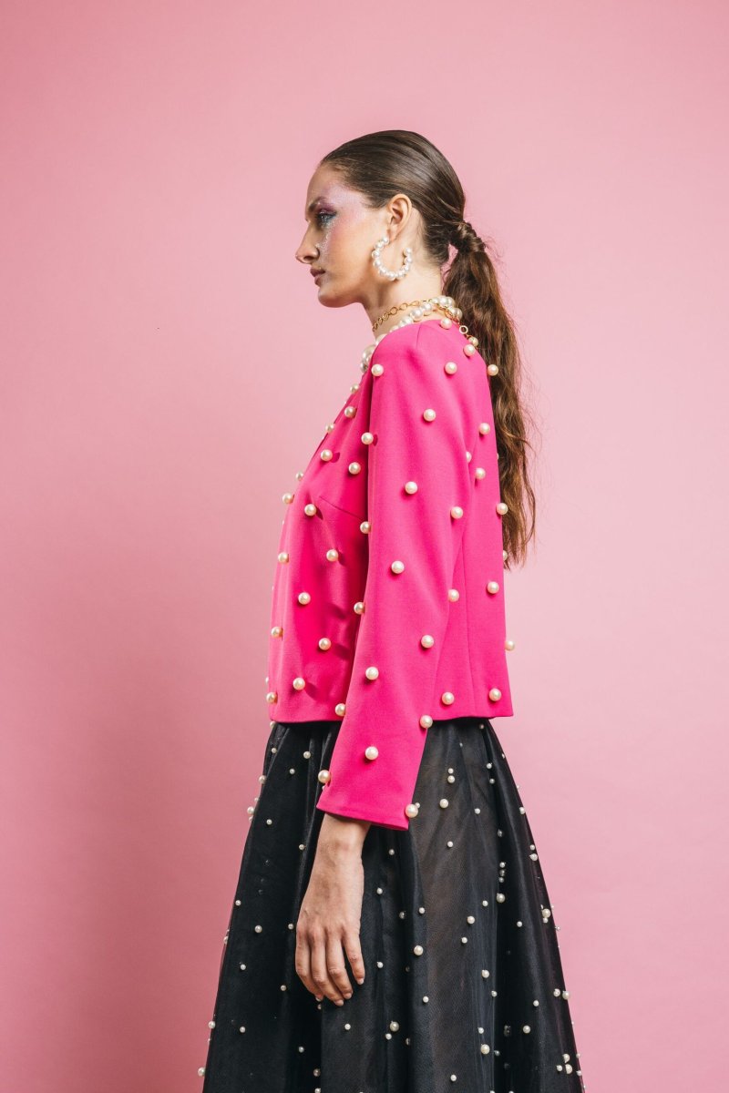 Giacca corta con dettaglio caratterizzato da perle applicate su tutta la superficie, il capo perfetto per completare con classe ed eleganza i vostri outfit importanti, ma perfetta per aggiungere stile e carattare anche ad un paio di jeans e t-shirt bianca. Insomma un capo capace di rendere speciale qualsiasi outfit.