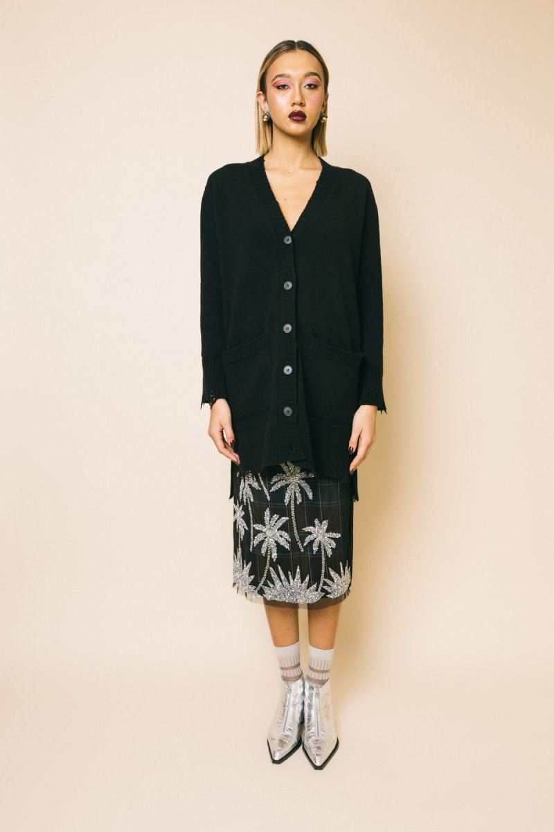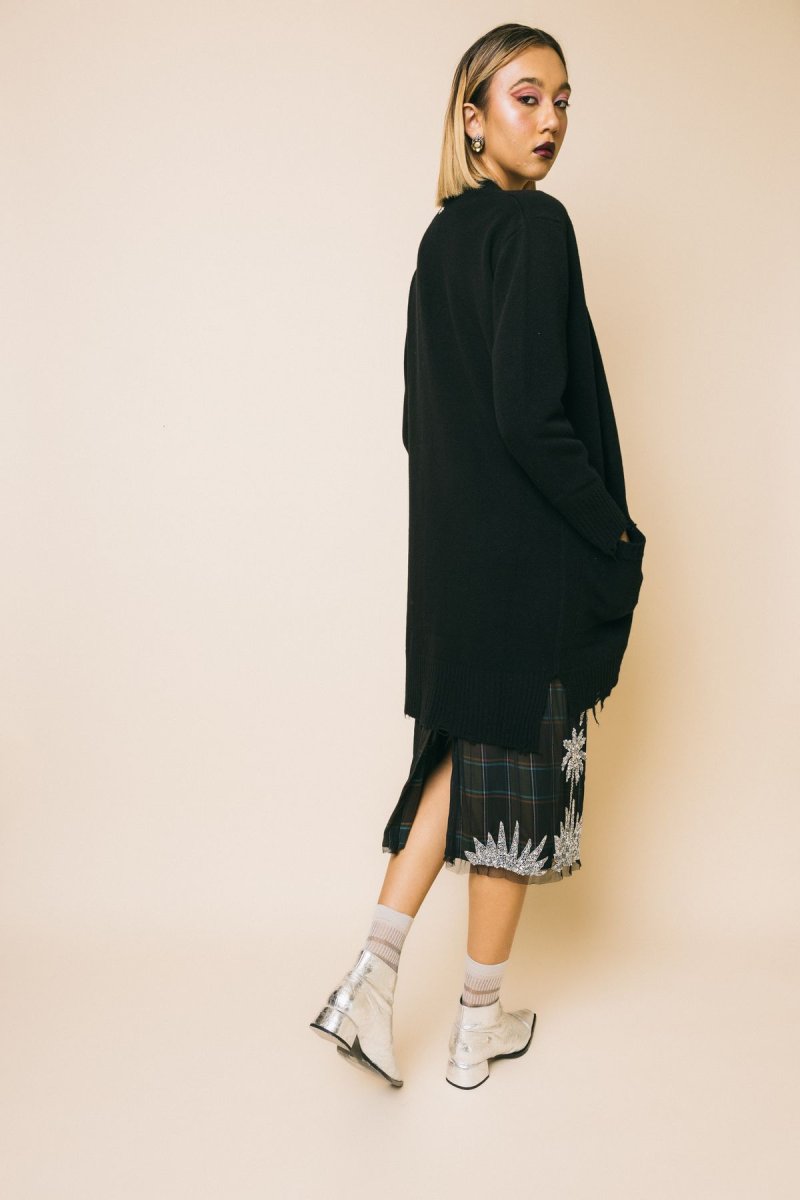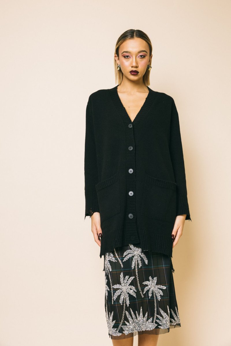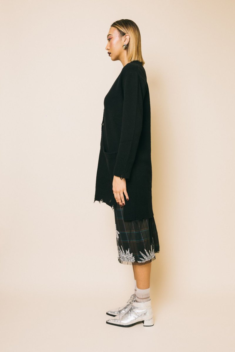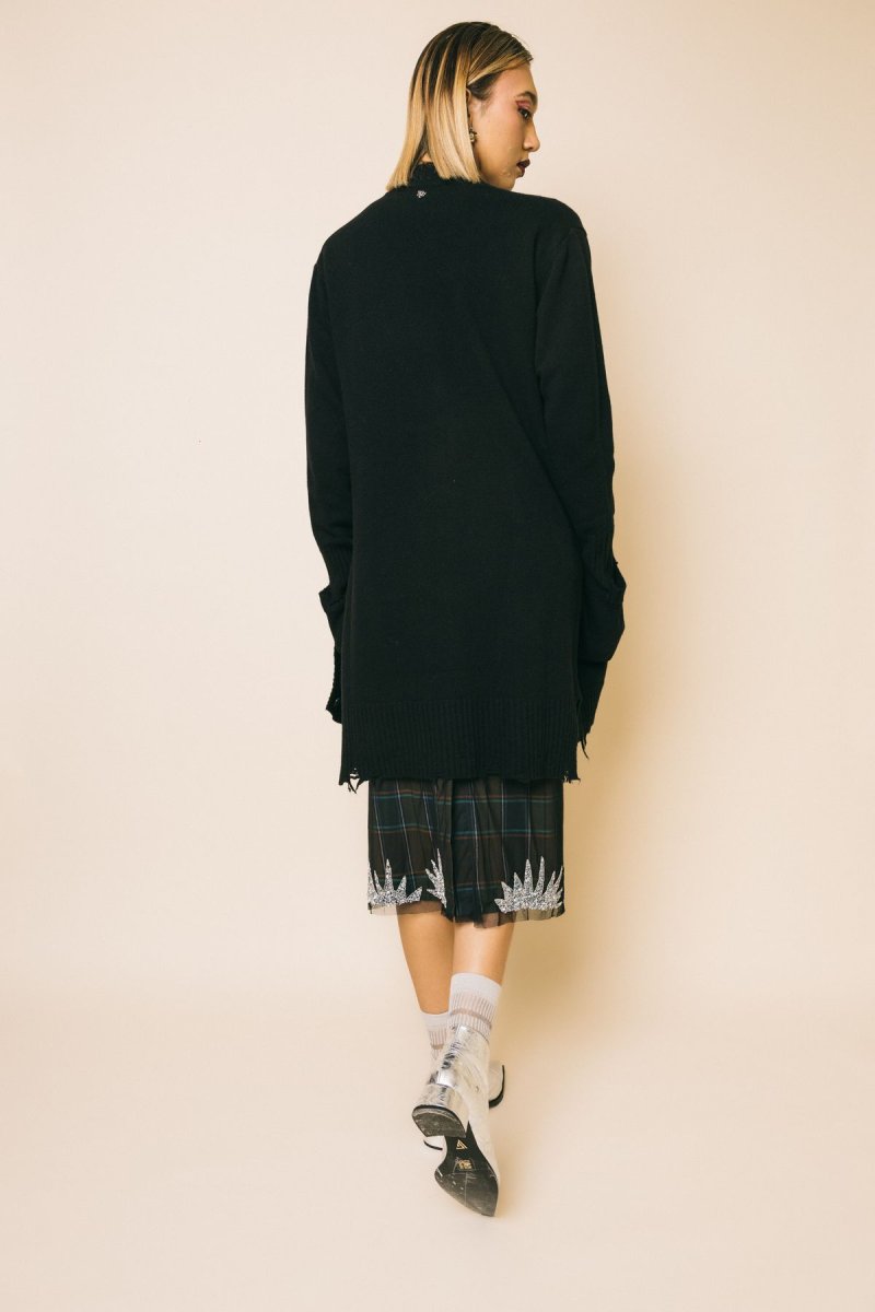 Cardigan over lungo in soffice lana vergine Modello ampio con rotture, che esprime un animo rock e irriverente. I bottoni di chiusura e le tasche applicate nella parte anteriore, aggiungono funzionalità e praticità, mentre il design leggermente asimmetrico, con fondo più lungo nel retro, dona al capo un look dinamico e moderno. La modella nella foto è alta 181 cm e indossa la taglia S Composizione: Capo: 100% Lana Vergine Altezza modella: 1.77 cm Taglia indossata: XS Composizione: 100% lana vergine Lavabile in lavatrice 30′