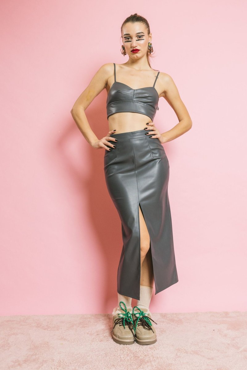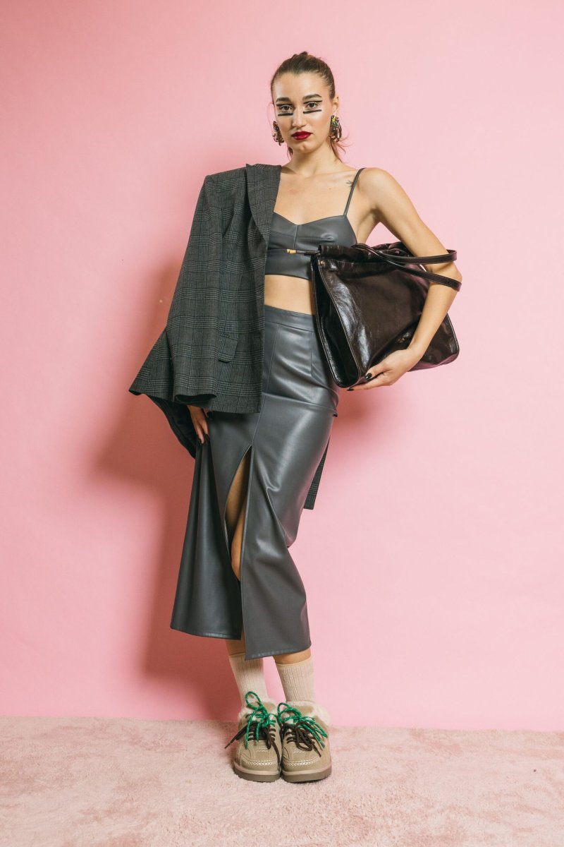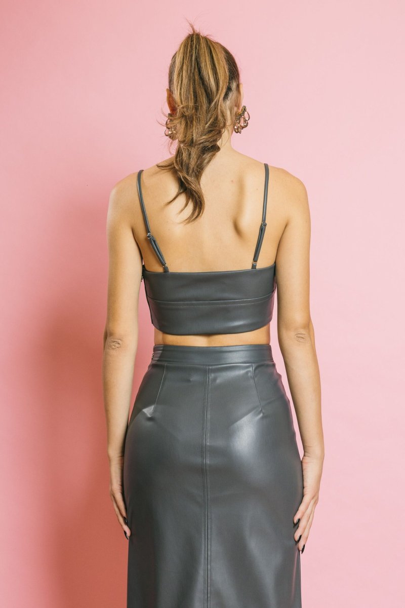 Minimal e sensuale, Carly reinventa il top bralette in chiave bold. Realizzato in tessuto spalmato effetto seconda pelle, scolpisce il décolleté con lo scollo a cuore, le cuciture strutturanti e le spalline regolabili. Da indossare da solo ma anche per completare un outfit con blazer o maxi cardigan.