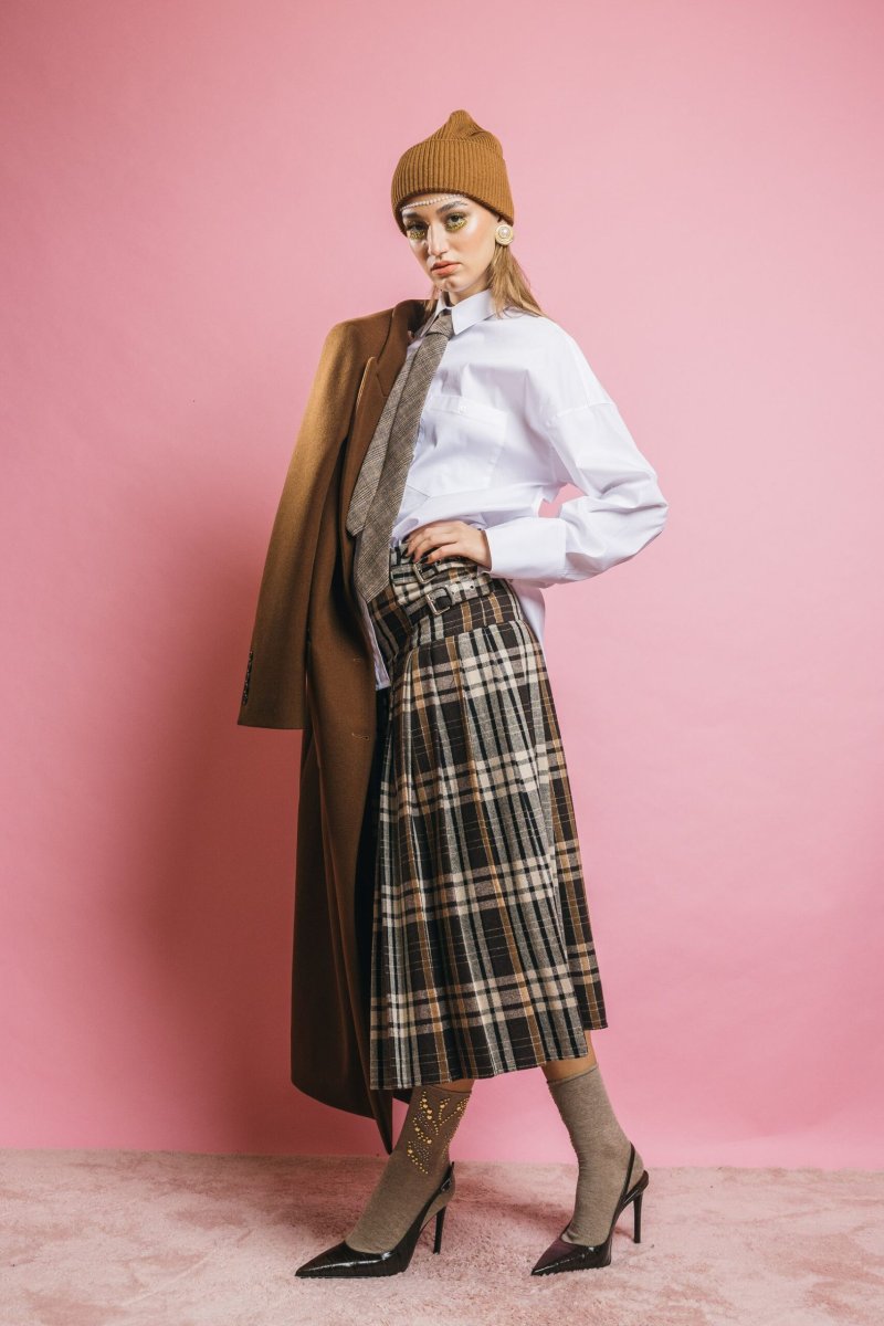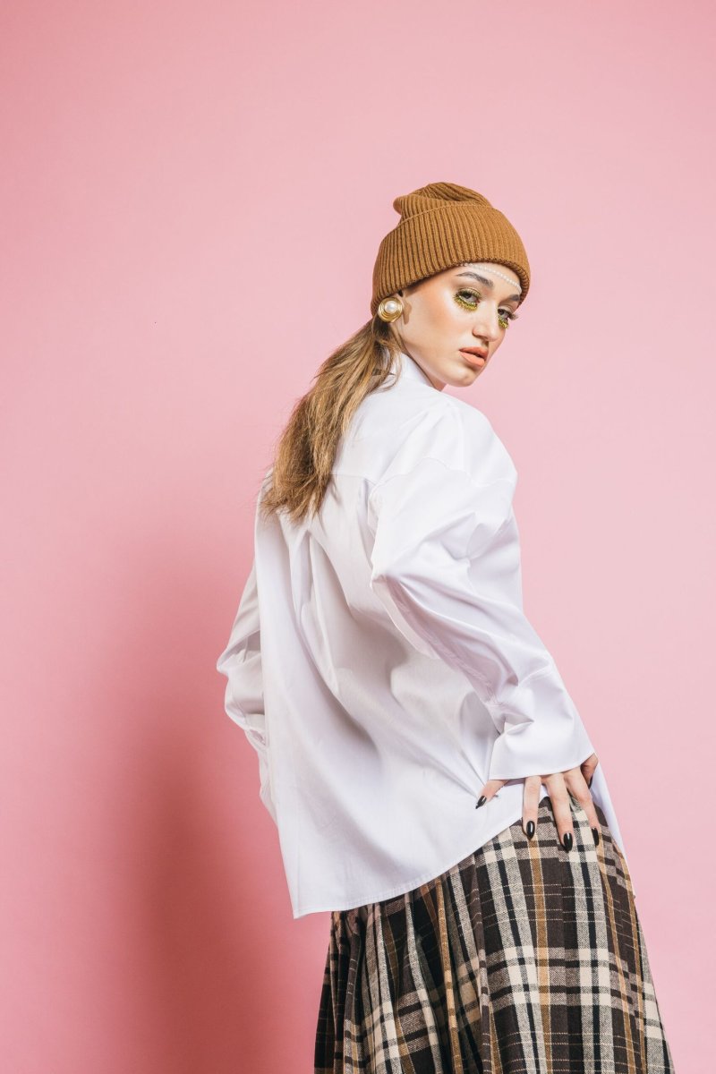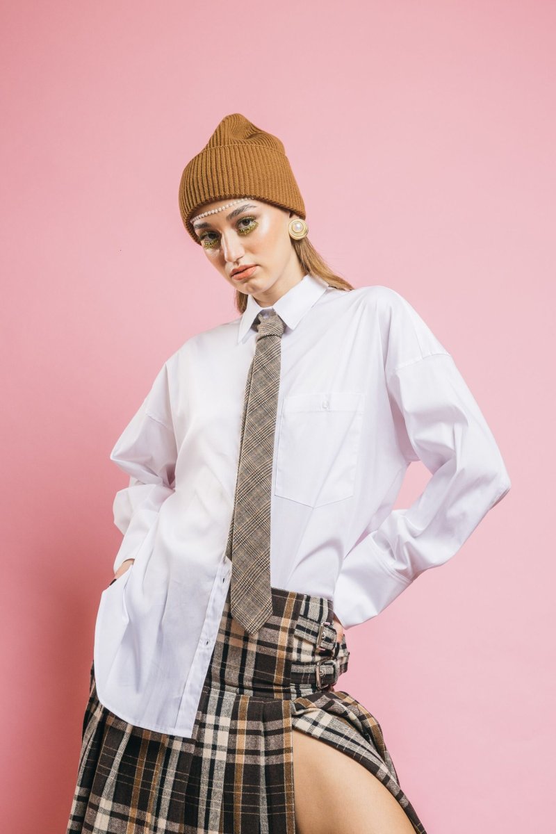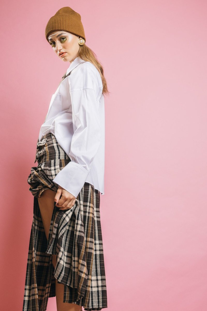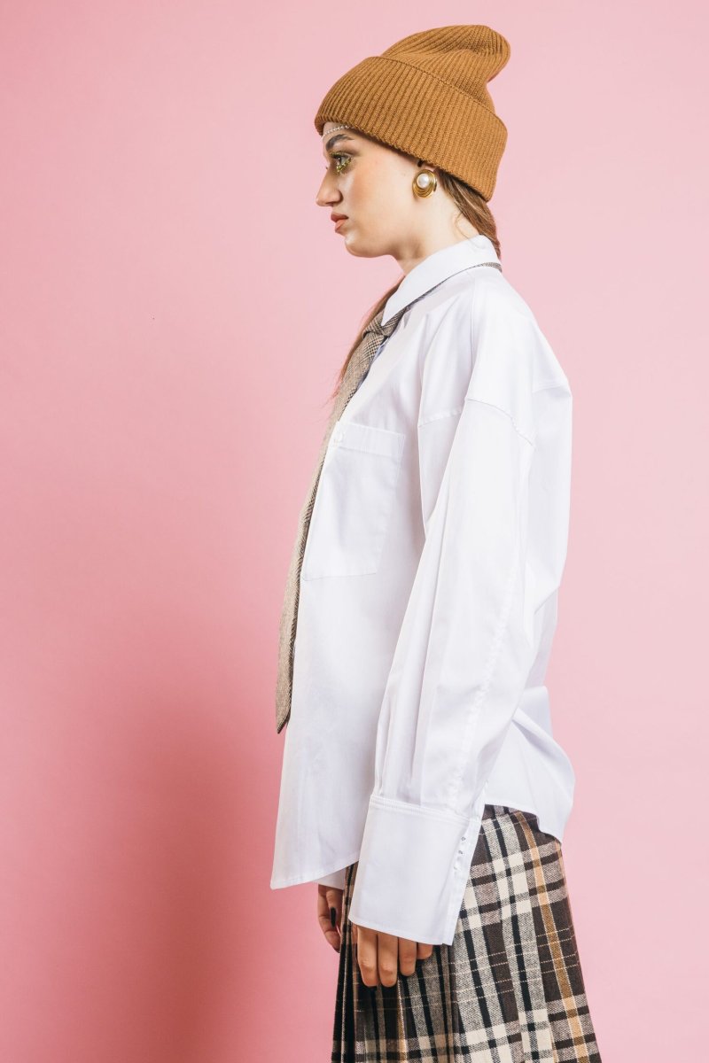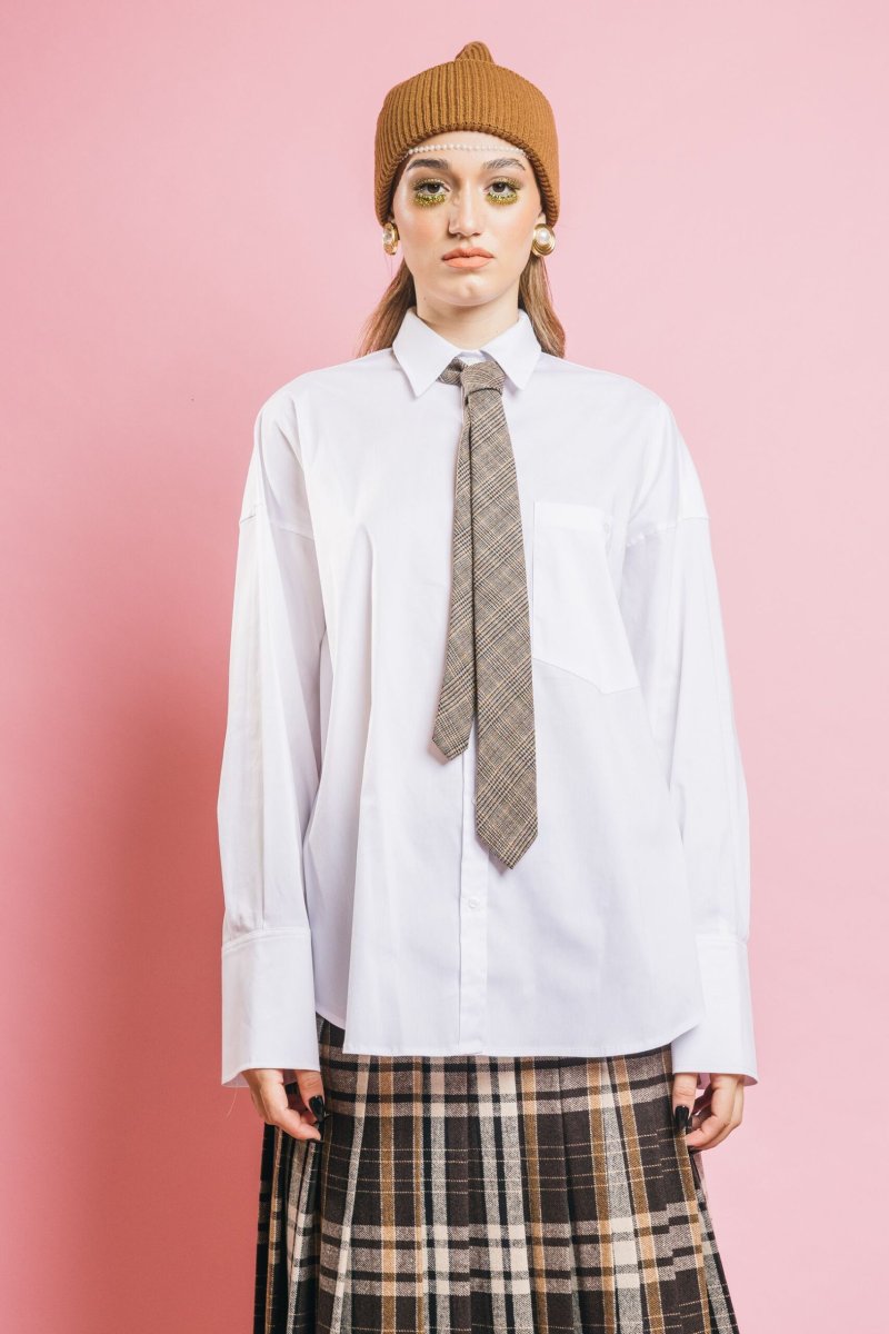Ispirazione boyish, spirito ultra moderno. La camicia Moon si arricchisce di un dettaglio inedito: la cravatta in tessuto Principe di Galles, che stravolge il classico con un tocco sofisticato. Il colletto strutturato, i polsi con bottoni e la vestibilità over completano il look con stile ed eleganza contemporanea.