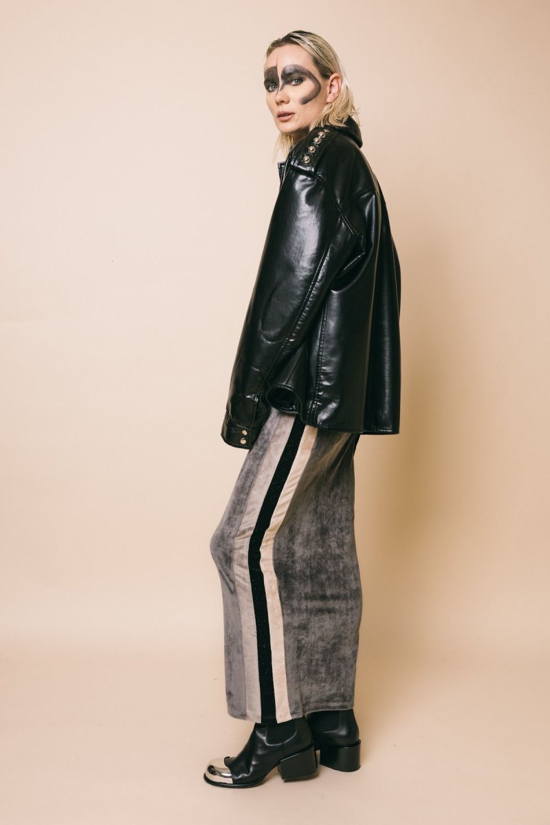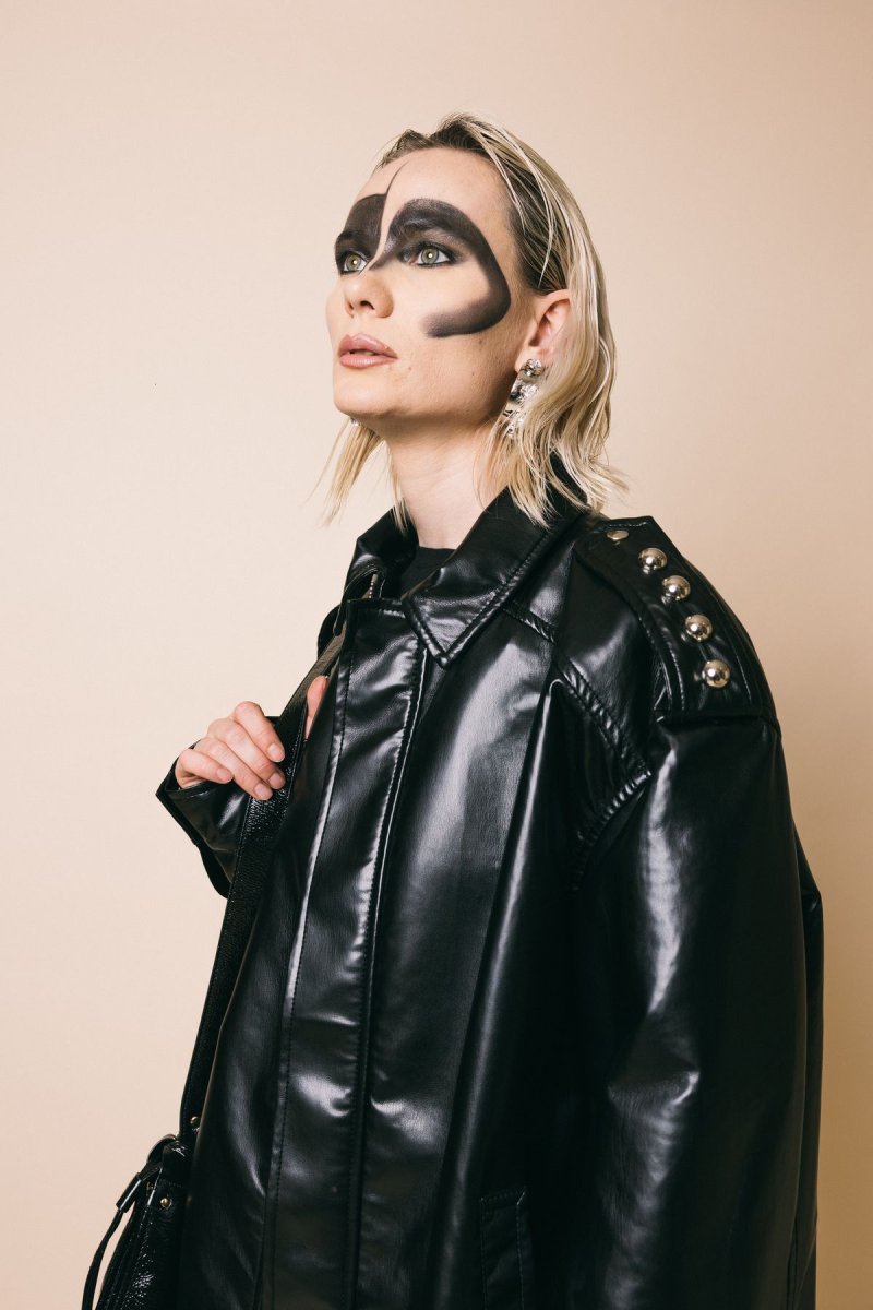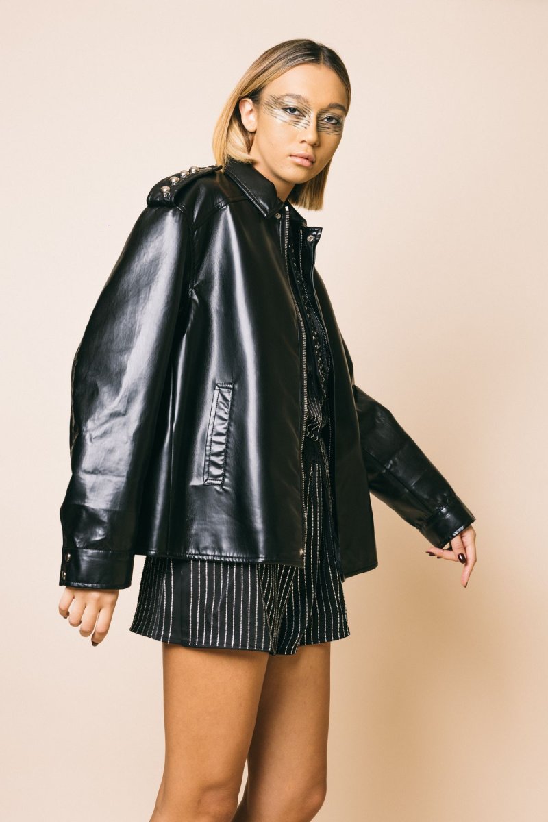 con alamari sulle spalle , decorati con macro borchie metalliche che conferiscono al capo un ulteriore tocco rock