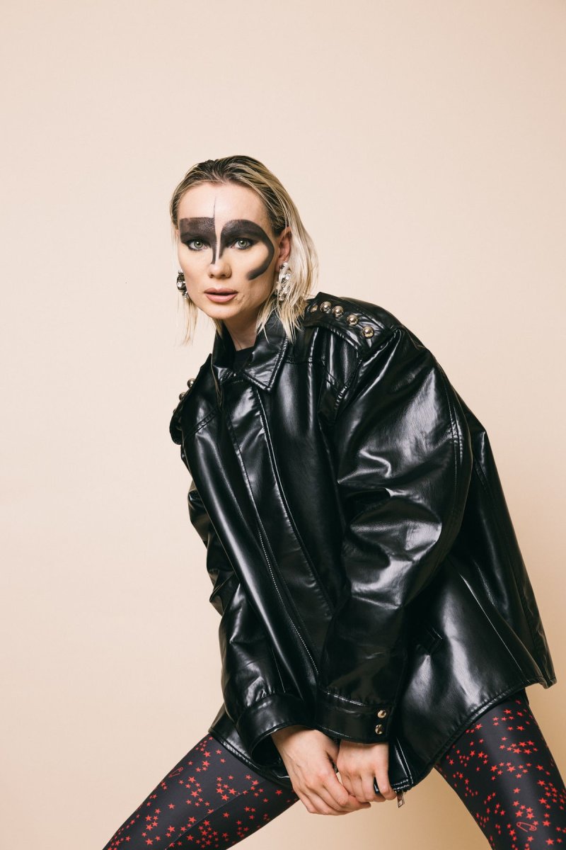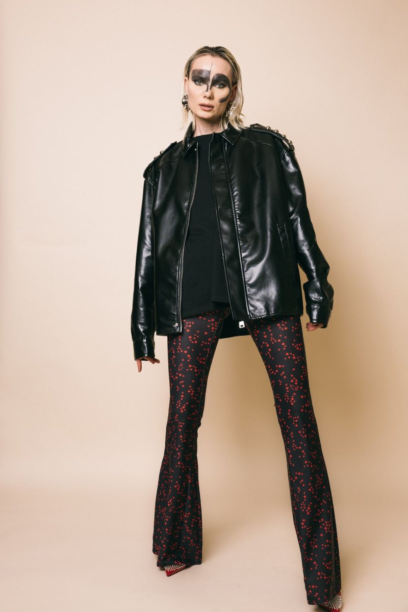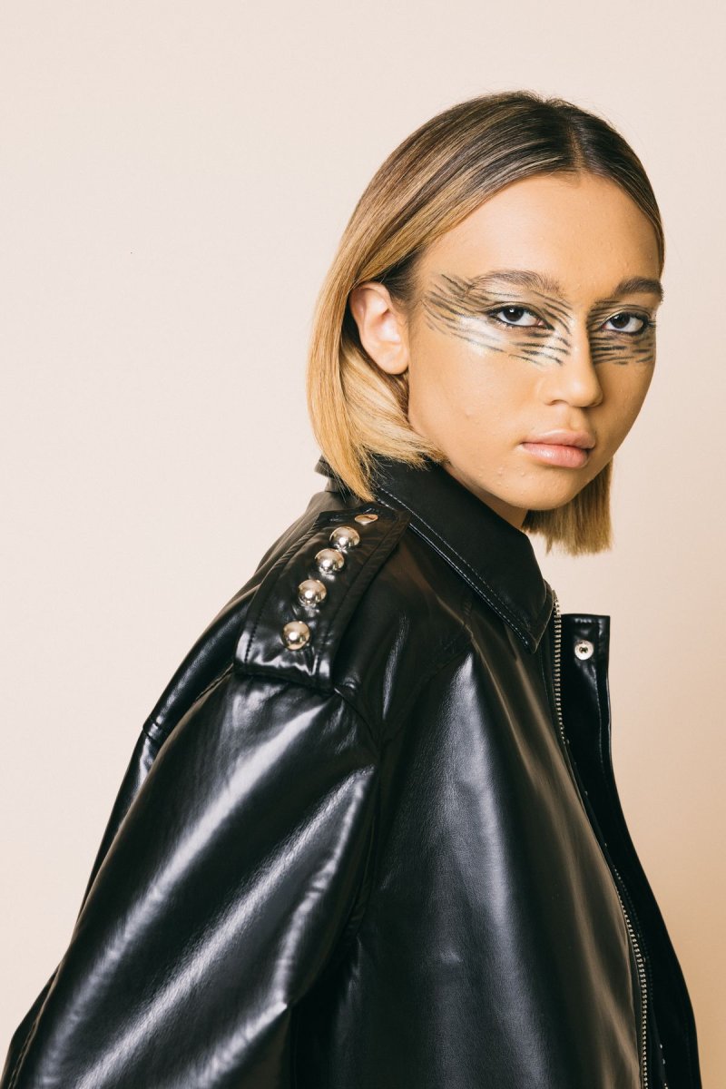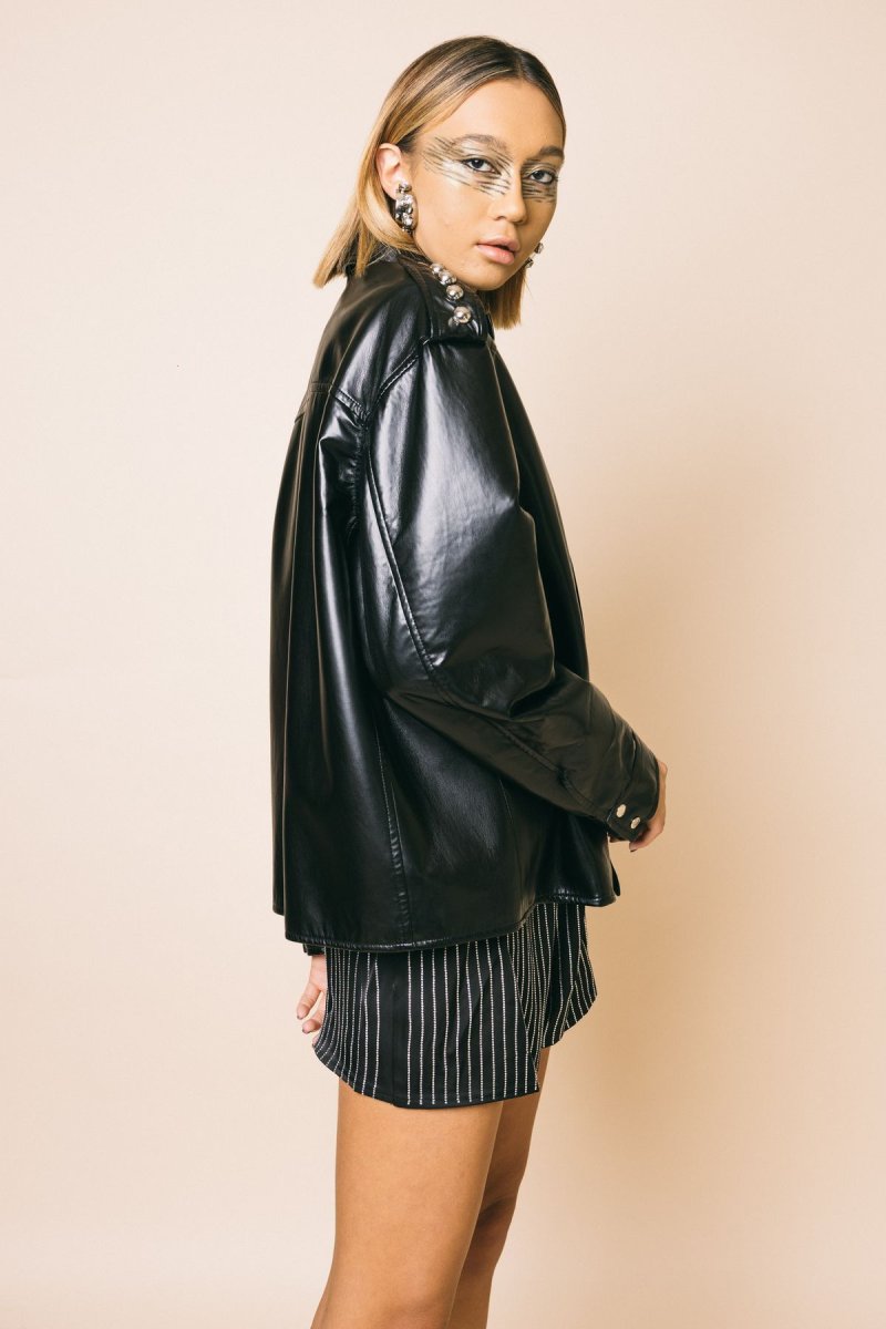 Bomber over in pelle con fascione elastico sul fondo con alamari sulle spalle , decorati con macro borchie metalliche che conferiscono al capo un ulteriore tocco rock Modello con tasche anteriori e chiusura frontale con zip Taglia indossata in foto: M Altezza modella: 1.77 cm Composizione: 100% poliestere
