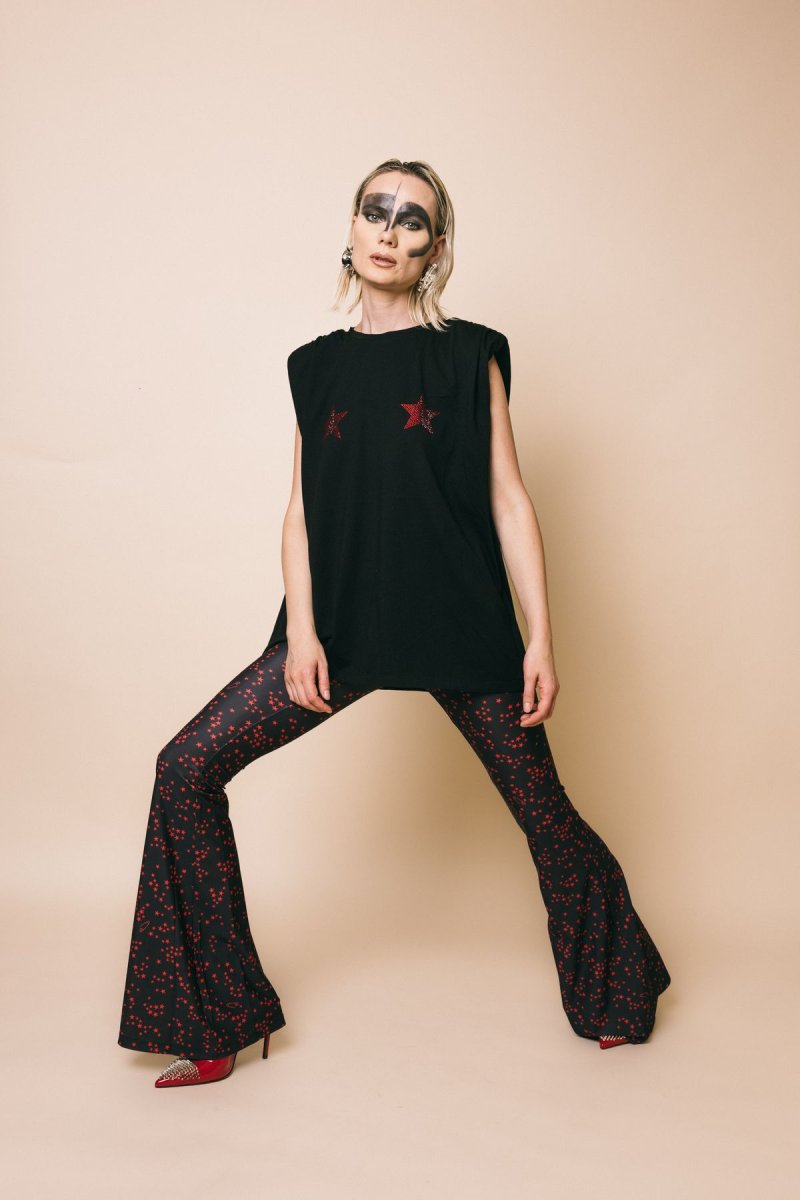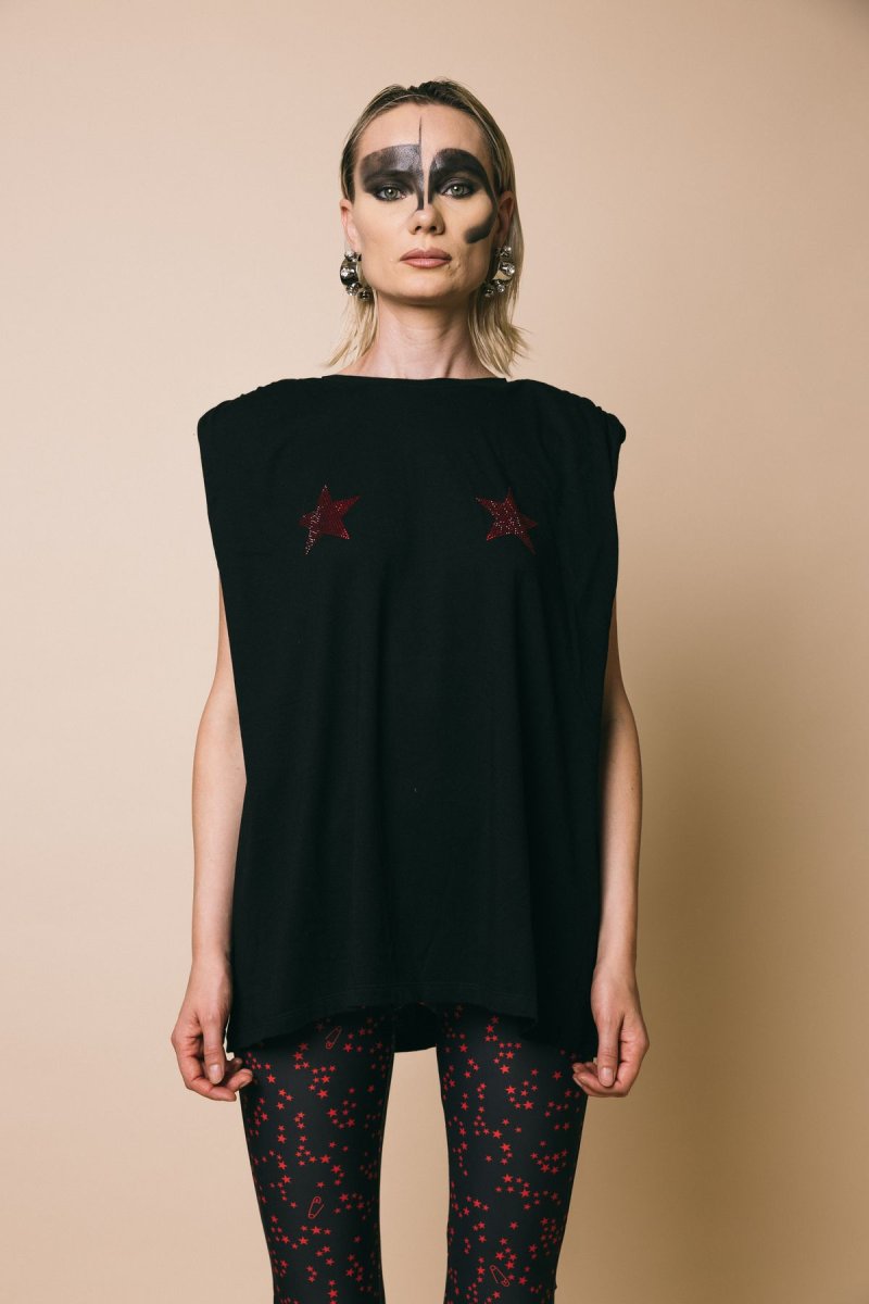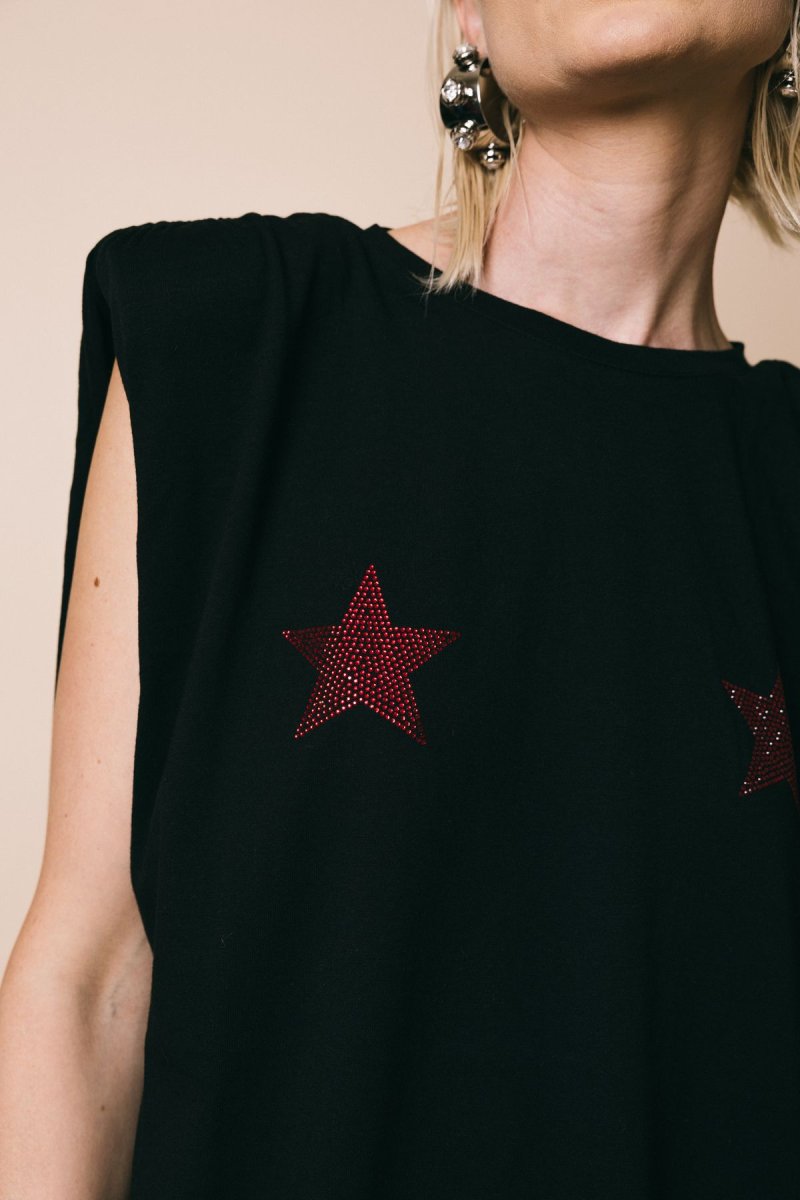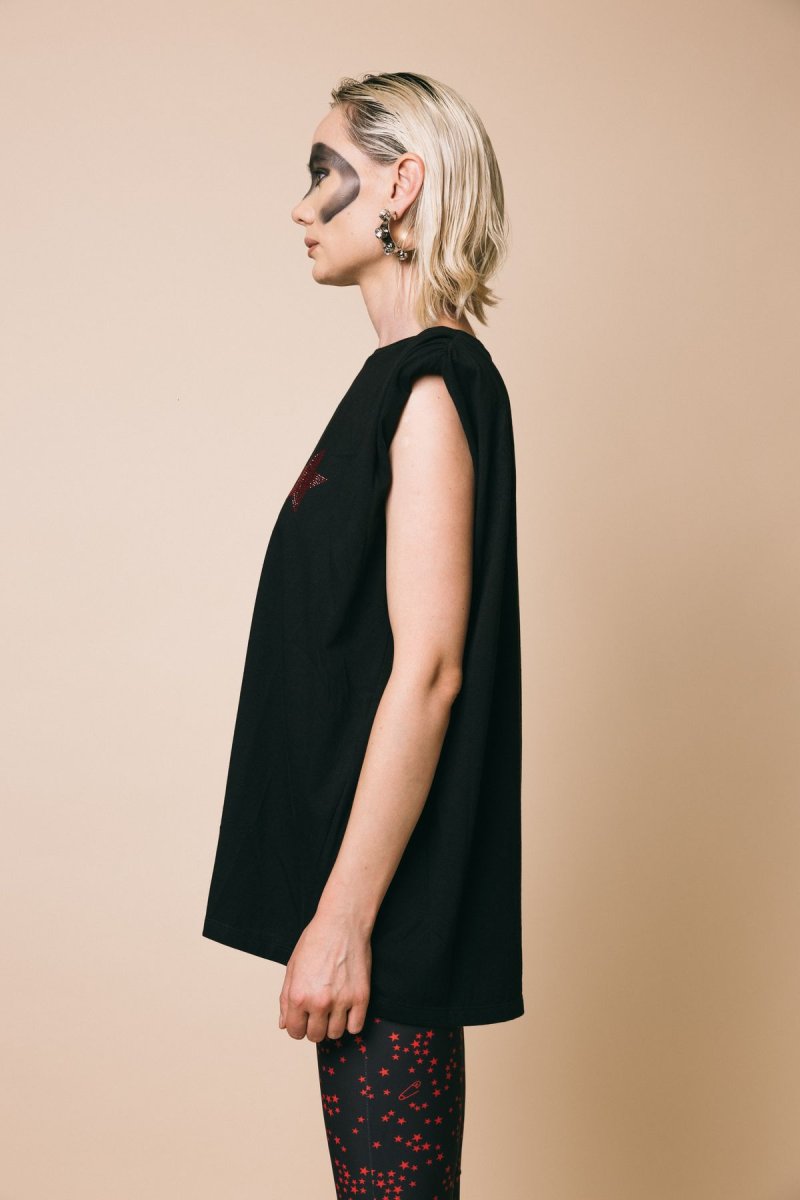 T-shirt smanicata, modello over in jersey senza maniche, con spalline e arriccio sulle spalle che aggiungono originalità e glamour al design del capo, dettaglio stelle strass red sul davanti, logo strass sulla schiena