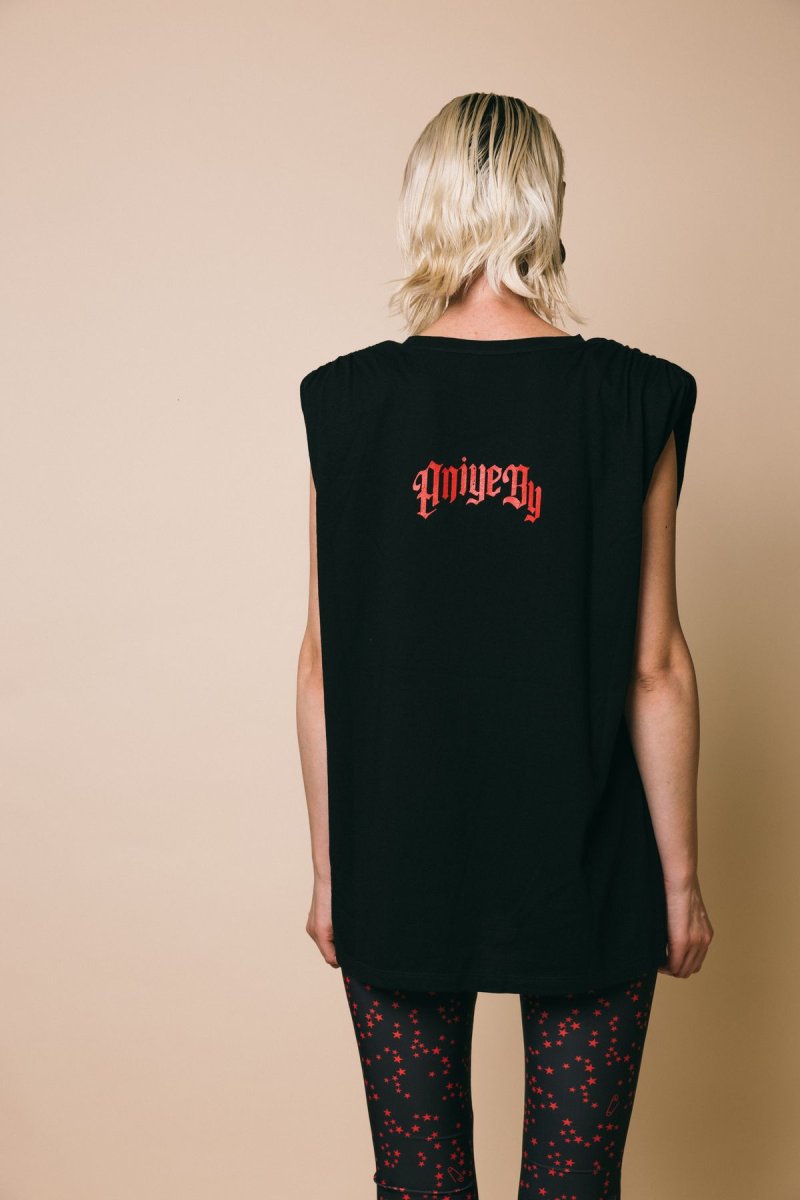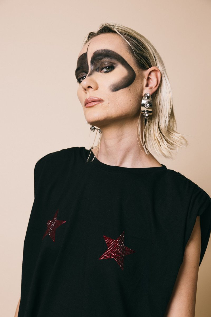 T-shirt smanicata, modello over in jersey senza maniche, con spalline e arriccio sulle spalle che aggiungono originalità e glamour al design del capo, dettaglio stelle strass red sul davanti, logo strass sulla schiena Altezza modella: 1.75 cm Taglia indossata: M Composizione: 100% cotone