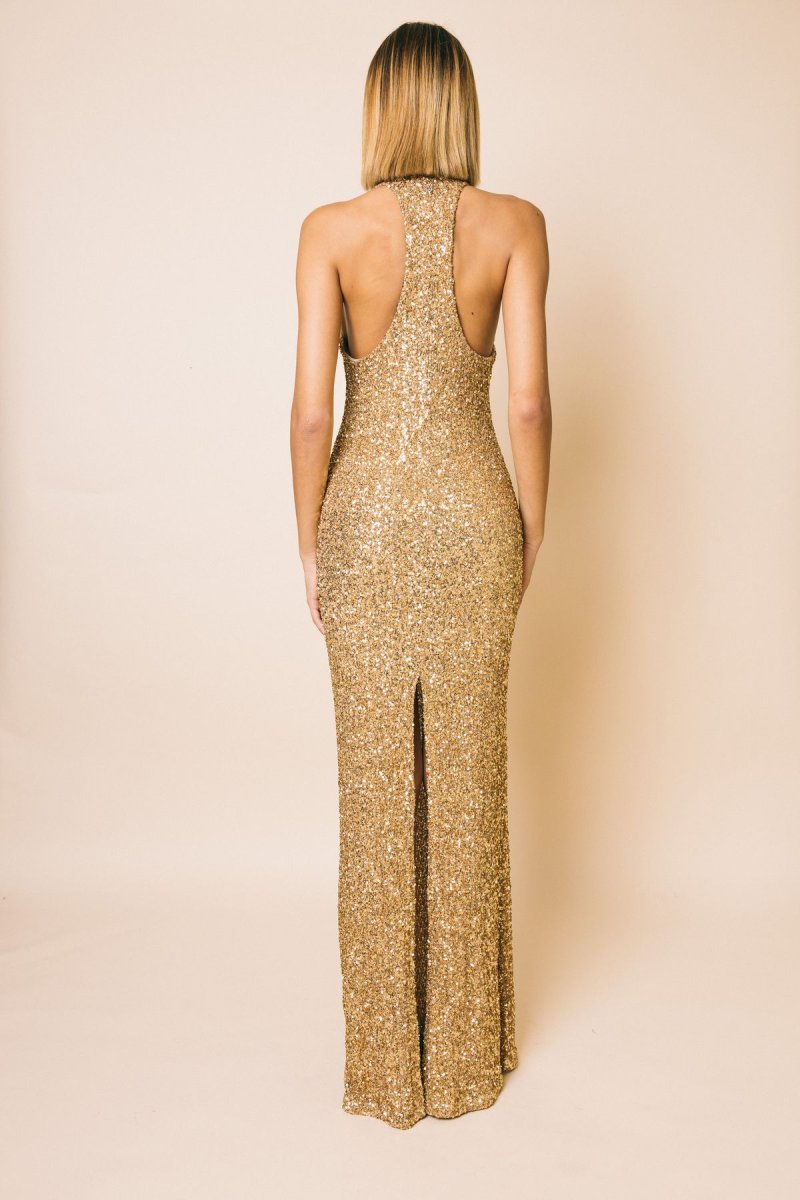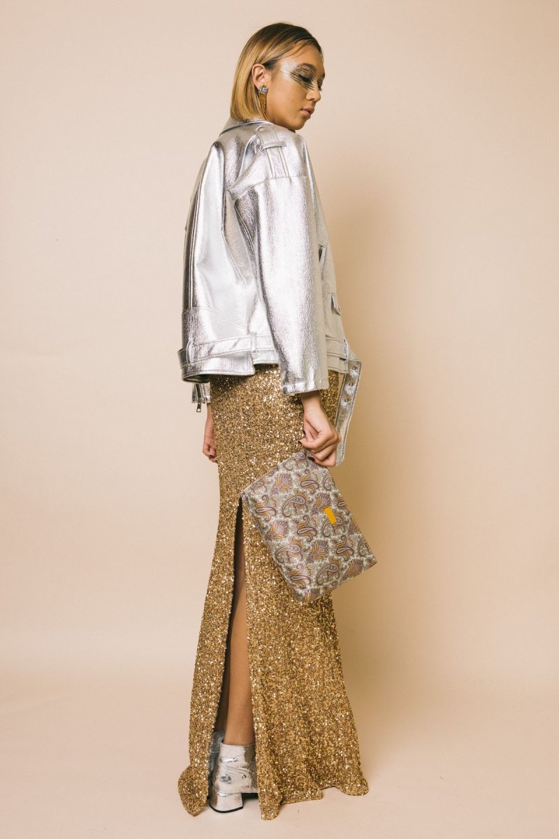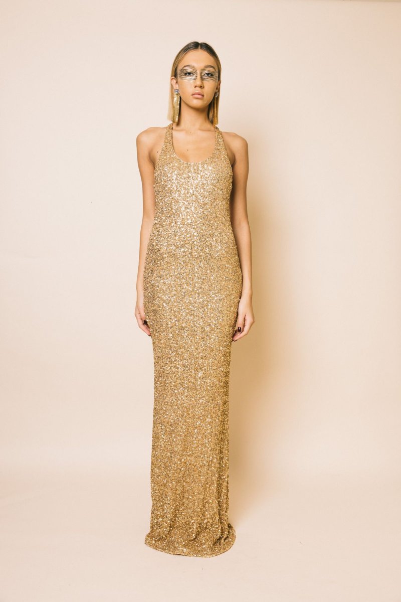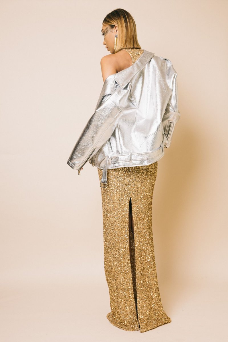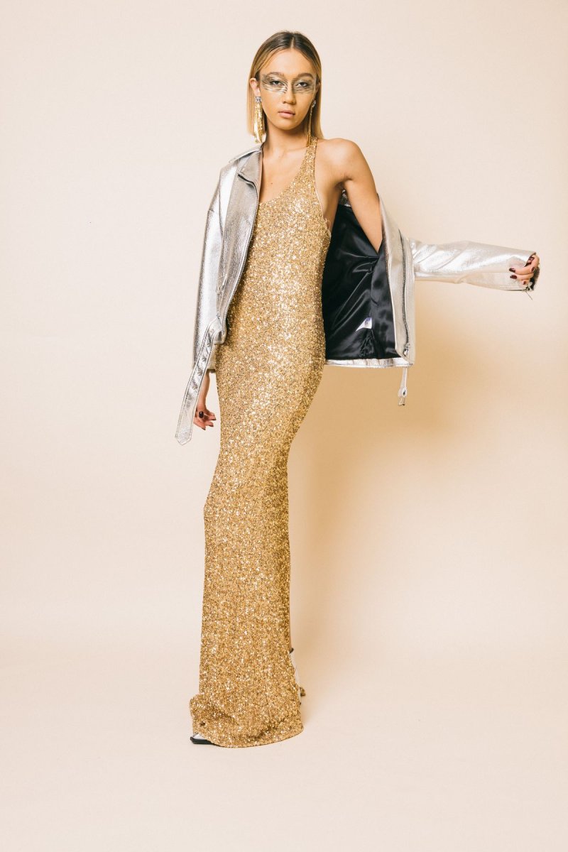 Abito lungo in paillettes con scollo all’americana, capo dalla silhouette avvolgente e ricoperto da una cascata di paillettes luminose in grado di creare un effetto glamour irresistibile.