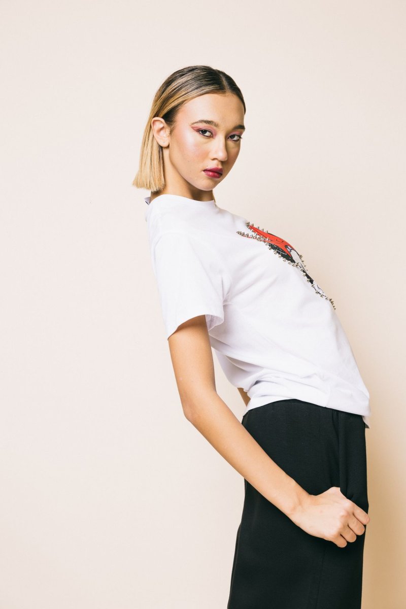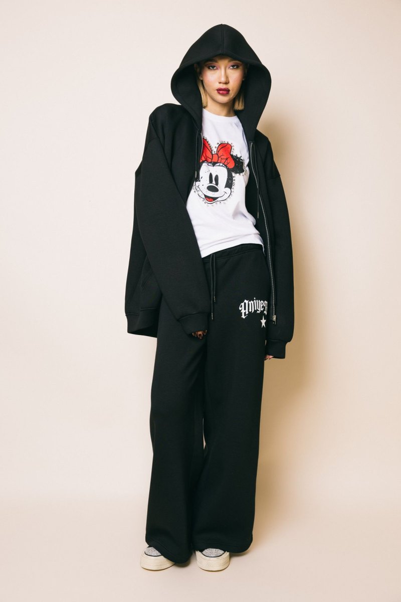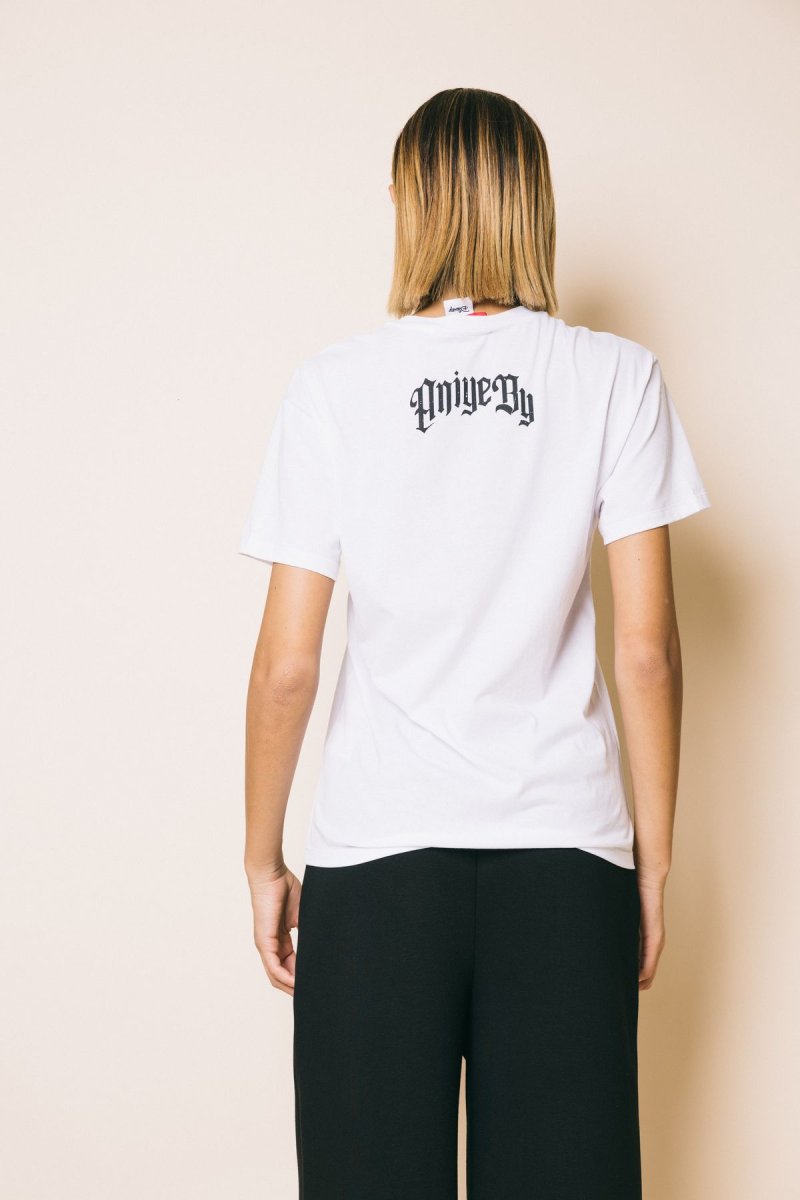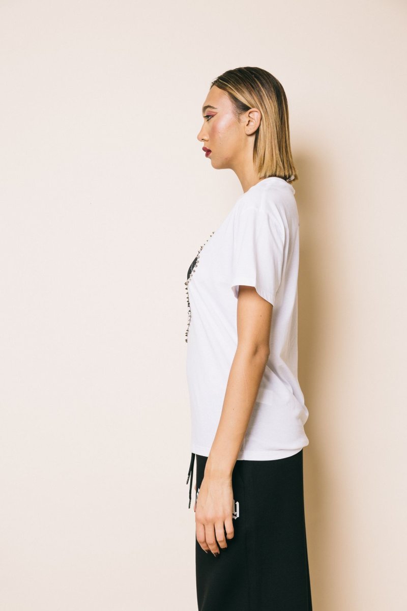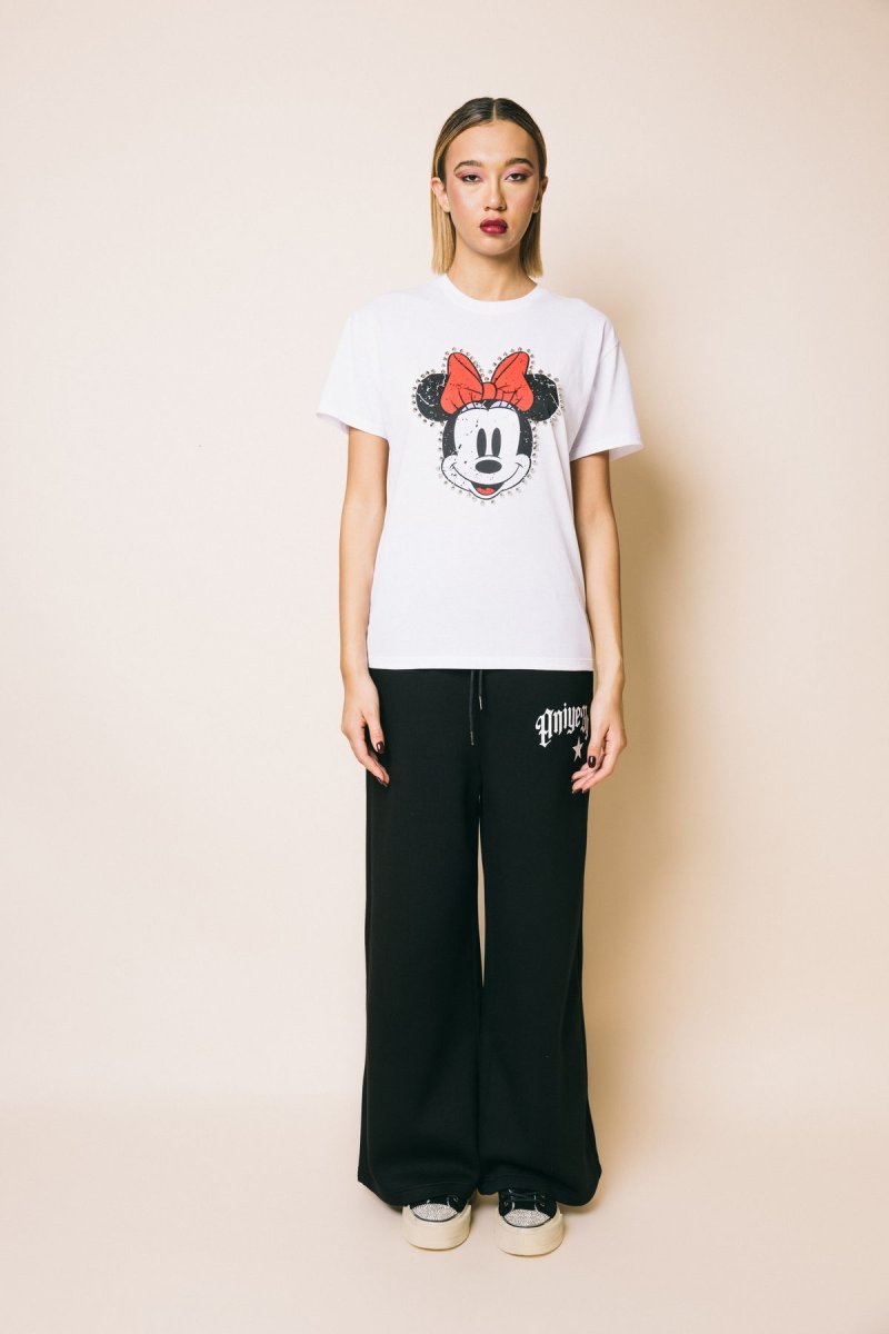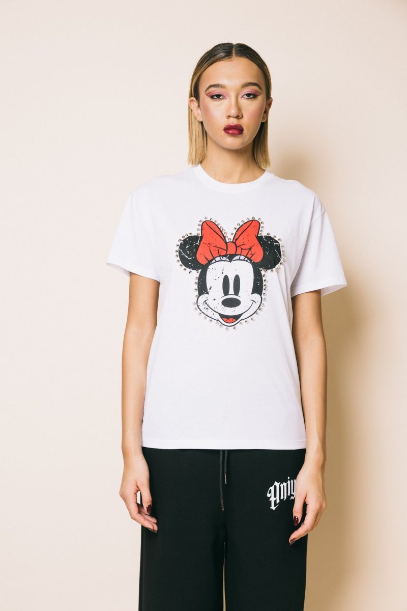 T-shirt Mickey, modello girocollo in jersey di cotone arricchita dalla stampa frontale del volto Minnie, ritratta con il suo iconico fiocco rosso. l0immagine Cartoon è arricchita da borchie che aggiungono un tocco rocco al capo. Sul retro stampa Aniye By in carattere gotico.