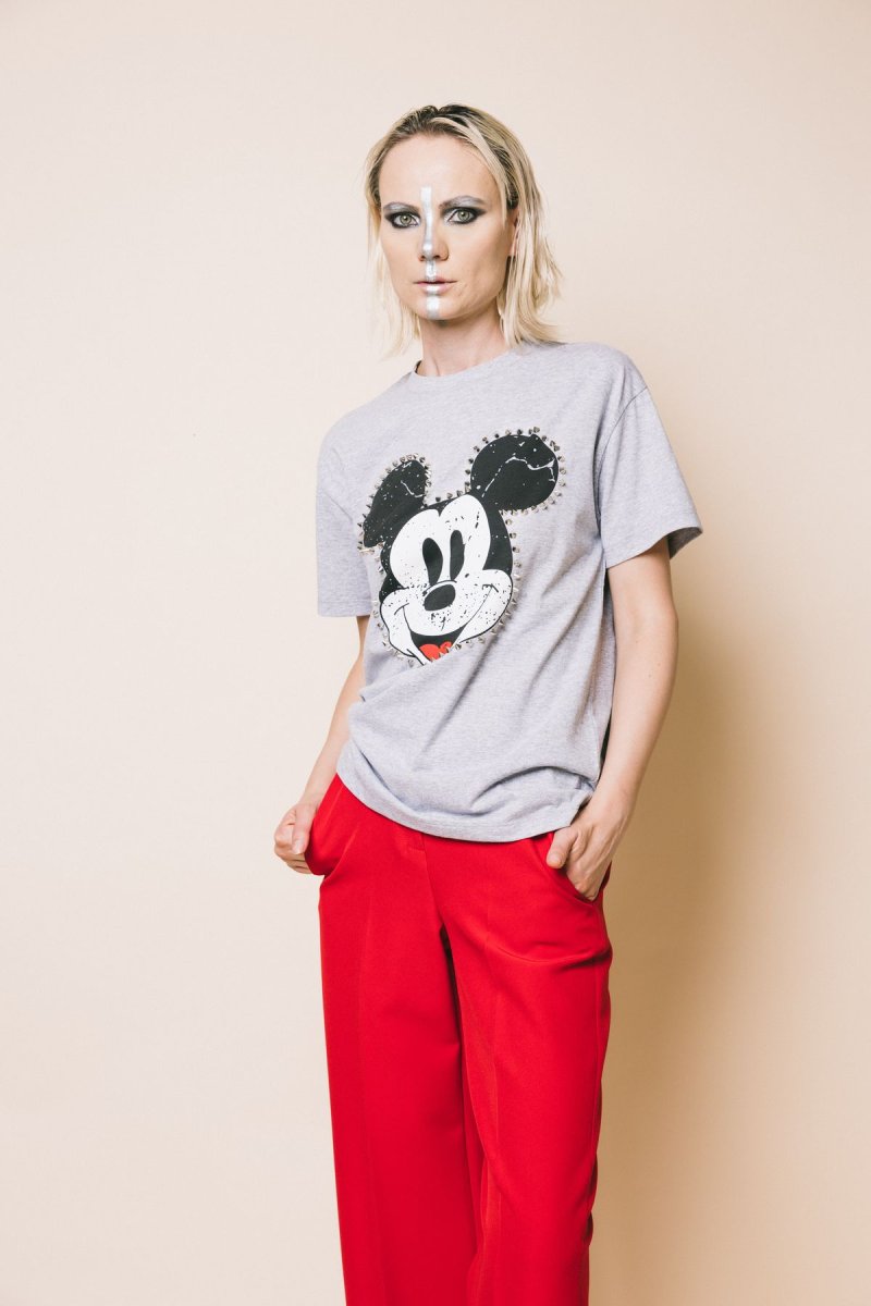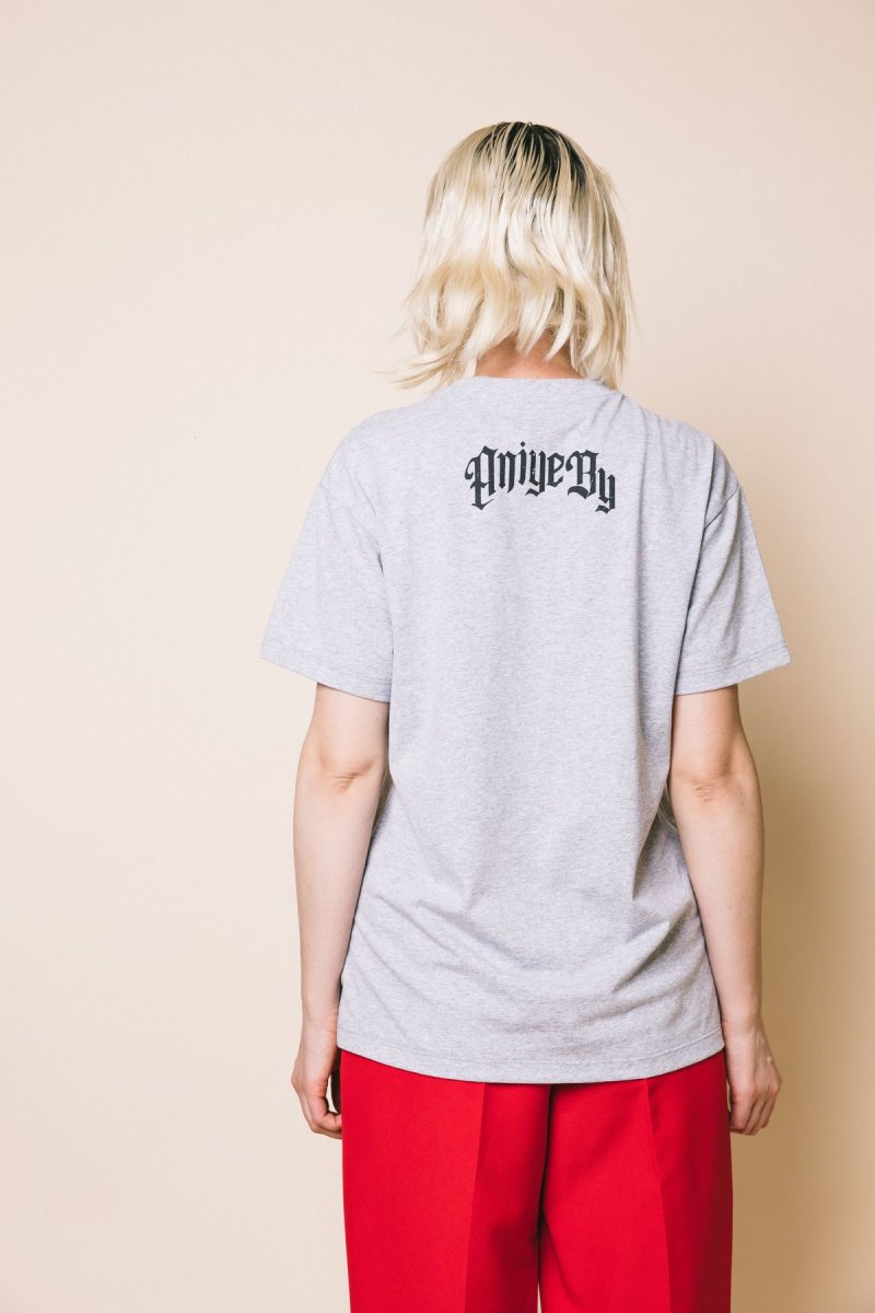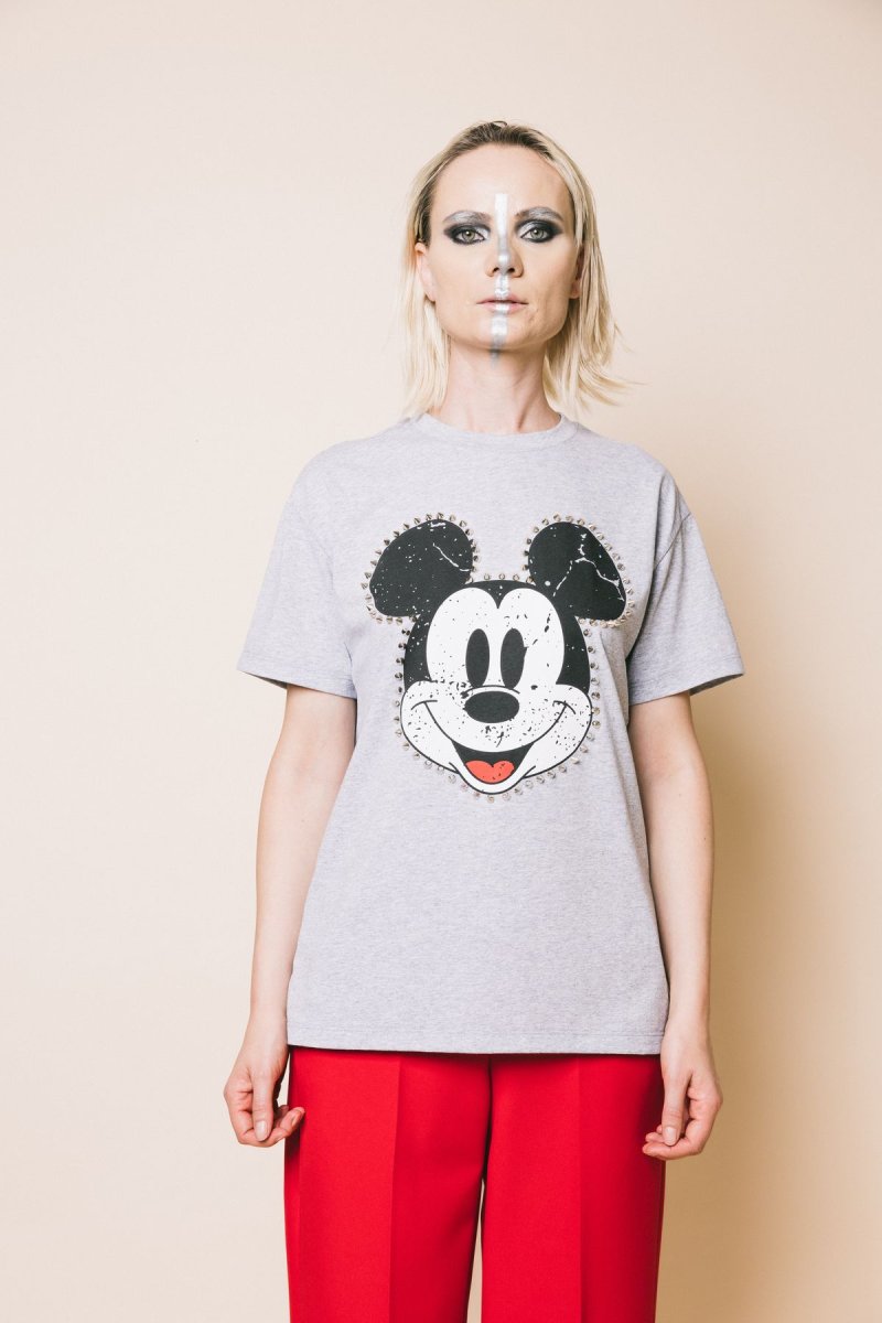 T-shirt Mickey, modello girocollo in jersey di cotone arricchita dalla stampa frontale del volto Minnie, ritratta con il suo iconico fiocco rosso. l0immagine Cartoon è arricchita da borchie che aggiungono un tocco rocco al capo. Sul retro stampa Aniye By in carattere gotico.