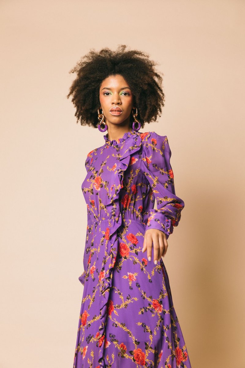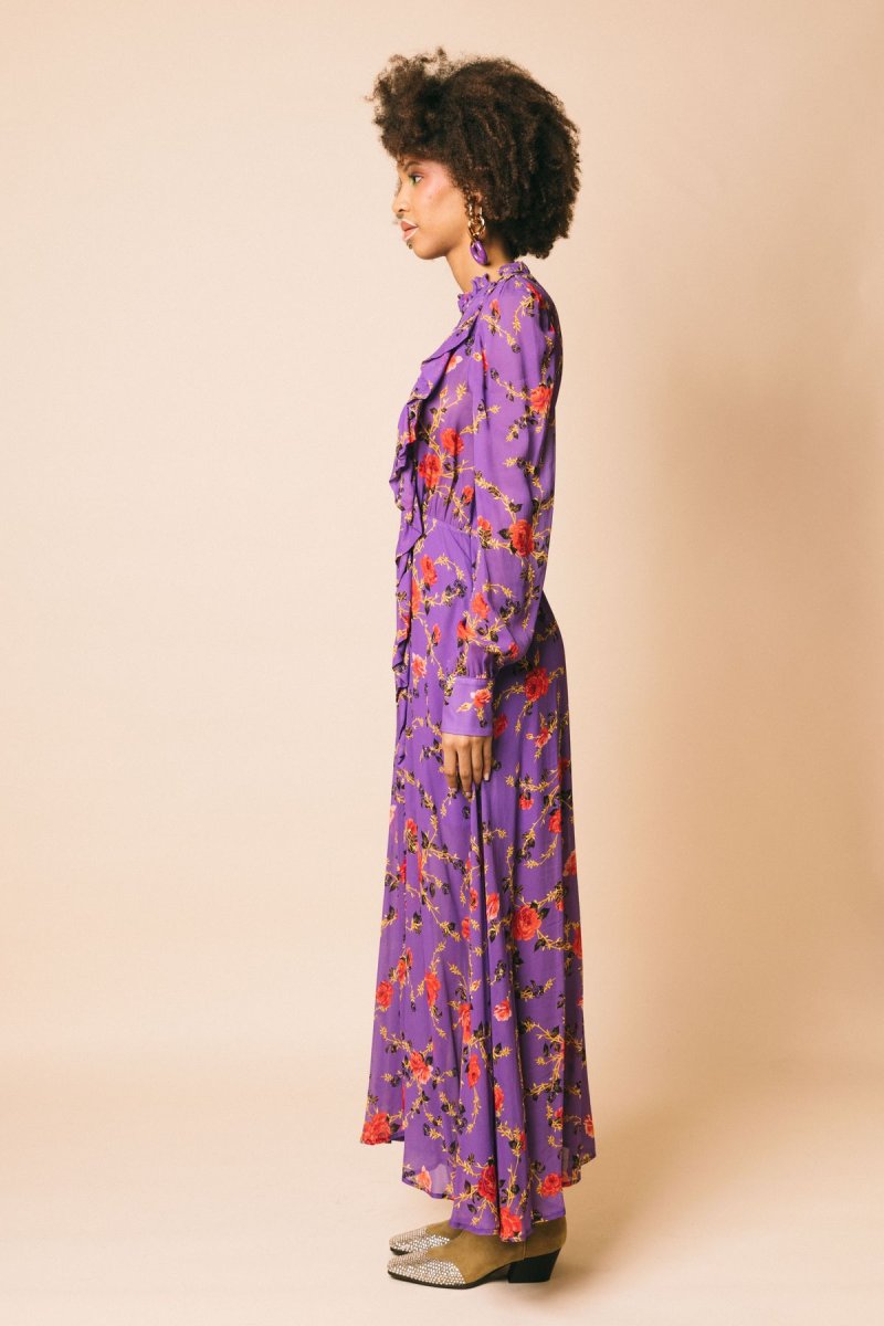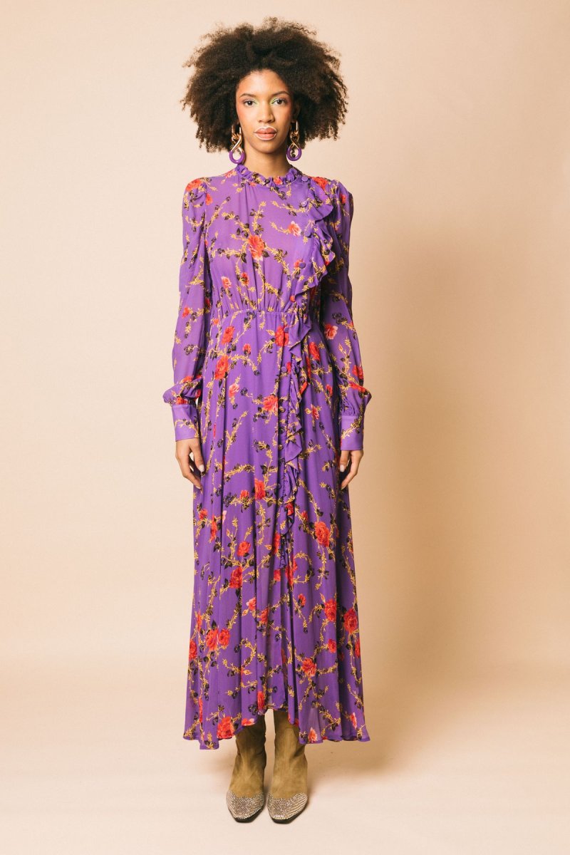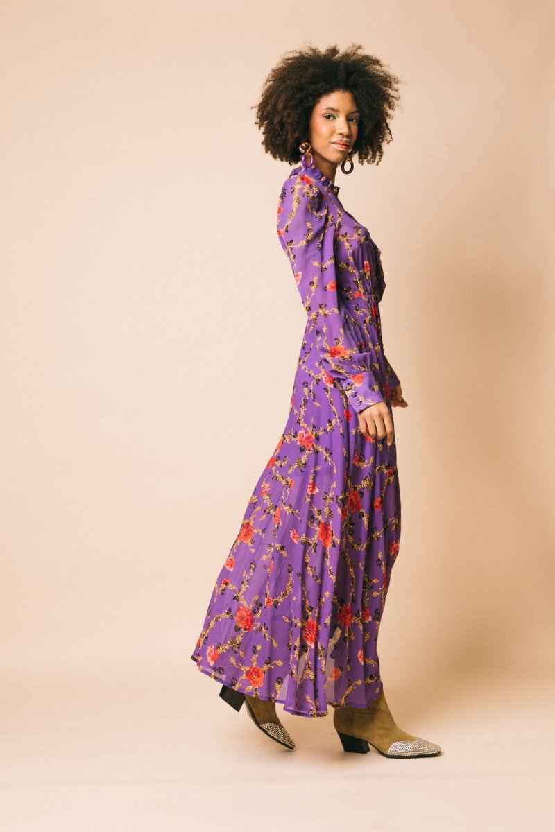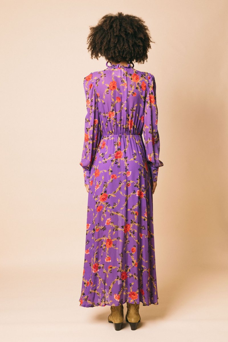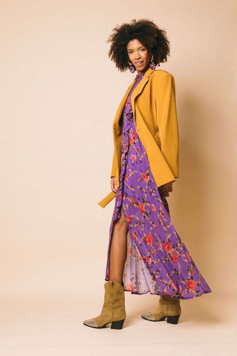 Abito scamiciato lungo in georgette stampa floreale, con gonna morbida e rouches sull’allacciatura