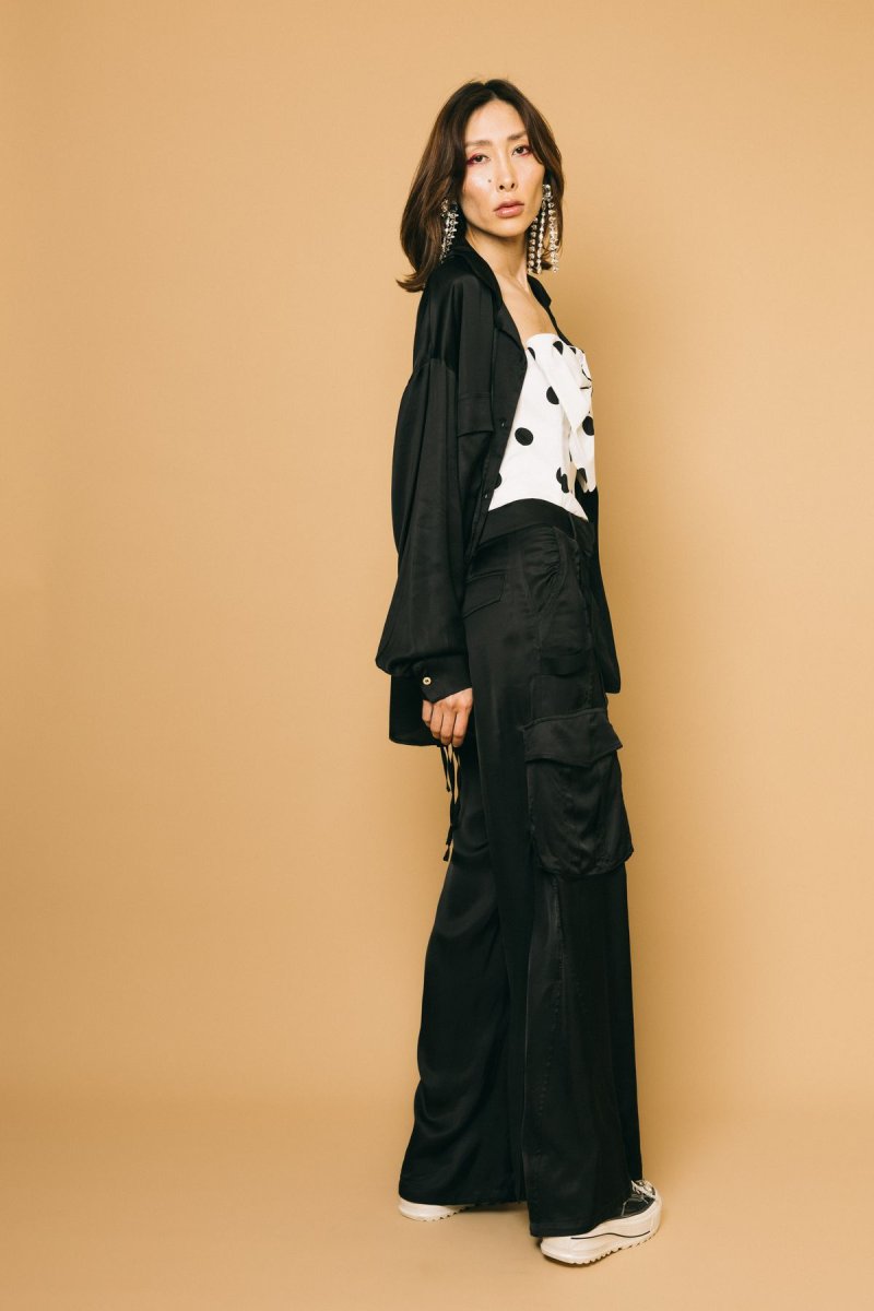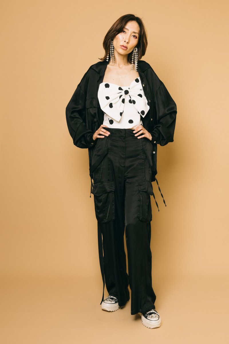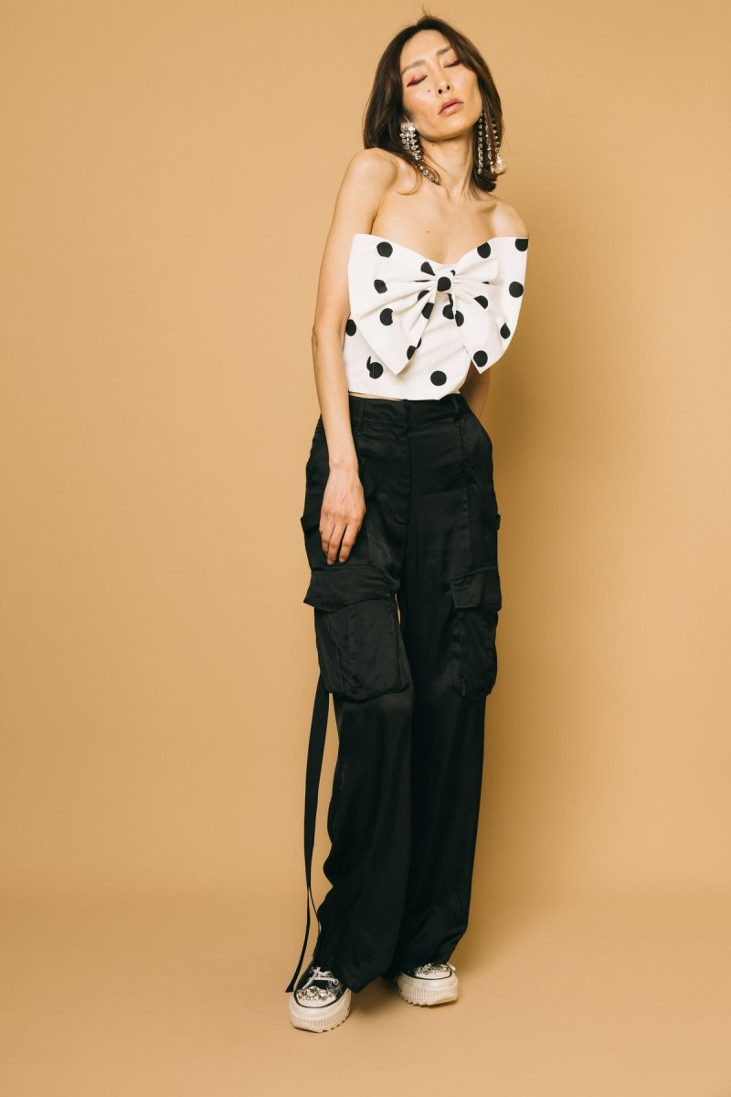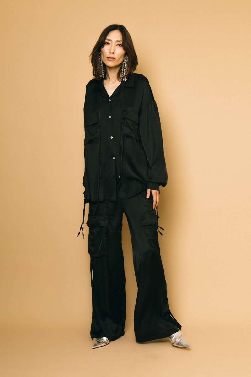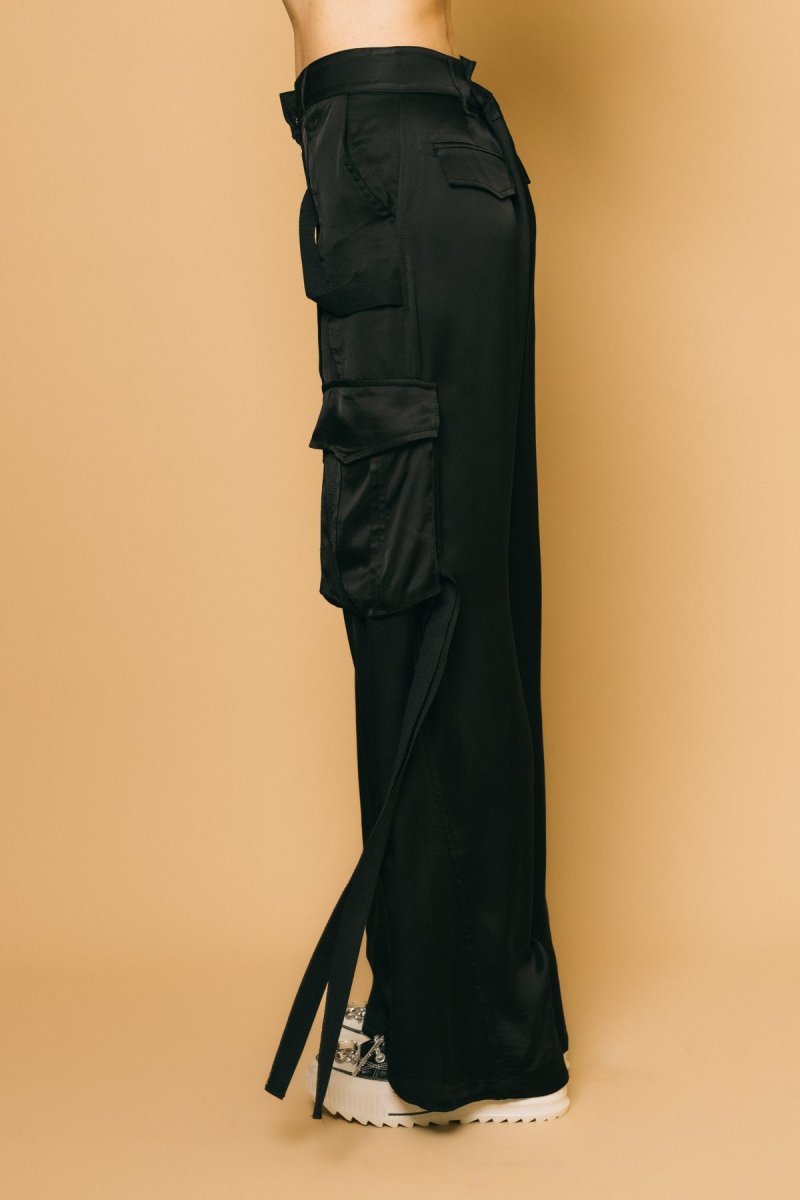 Pantalone cargo in raso fluido, tasche frontali ad altezza ginocchio e nastri lunghi laterali