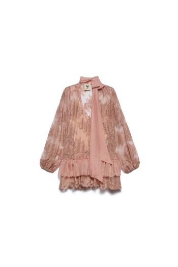 Le maniche lunghe terminano con elastico ai polsi per un effetto morbido e femminile, e il nastro in chiffon al collo aggiunge un dettaglio raffinato che completa la silhouette con eleganza.