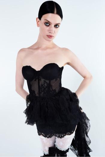 Abito bustier in pizzo con lunghi volant, caratterizzato da una linea femminile e da una costruzione che valorizza il dรฉcolletรฉ con eleganza.