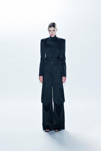 Le pinces modellano la linea sul punto vita, mentre le pieghe decorative allโaltezza delle ginocchia aggiungono carattere e movimento, definendo una struttura ed uno stile non convenzionale. Le tasche alla francese mantengono la pulizia del capo, i passanti in vita permettono di completarlo con una cintura importante, e le tasche posteriori a filetto sottolineano lโispirazione tailoring. La chiusura anteriore รจ essenziale e funzionale, impreziosita dal charm logato applicato nella parte frontale: un dettaglio distintivo che firma il capo con discrezione.Un pantalone che rilegge il gessato in chiave contemporanea, mantenendo una costruzione precisa e una vestibilitร confortevole, pensato per chi desidera unโeleganza dinamica, mai rigida.