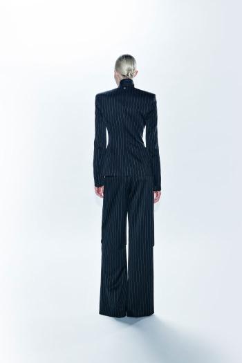 Pantalone baggy gessato con pinces, caratterizzato da volumi morbidi e costruzione sartoriale che si incontrano in questo modello dal disegno gessato, deciso ma raffinato.