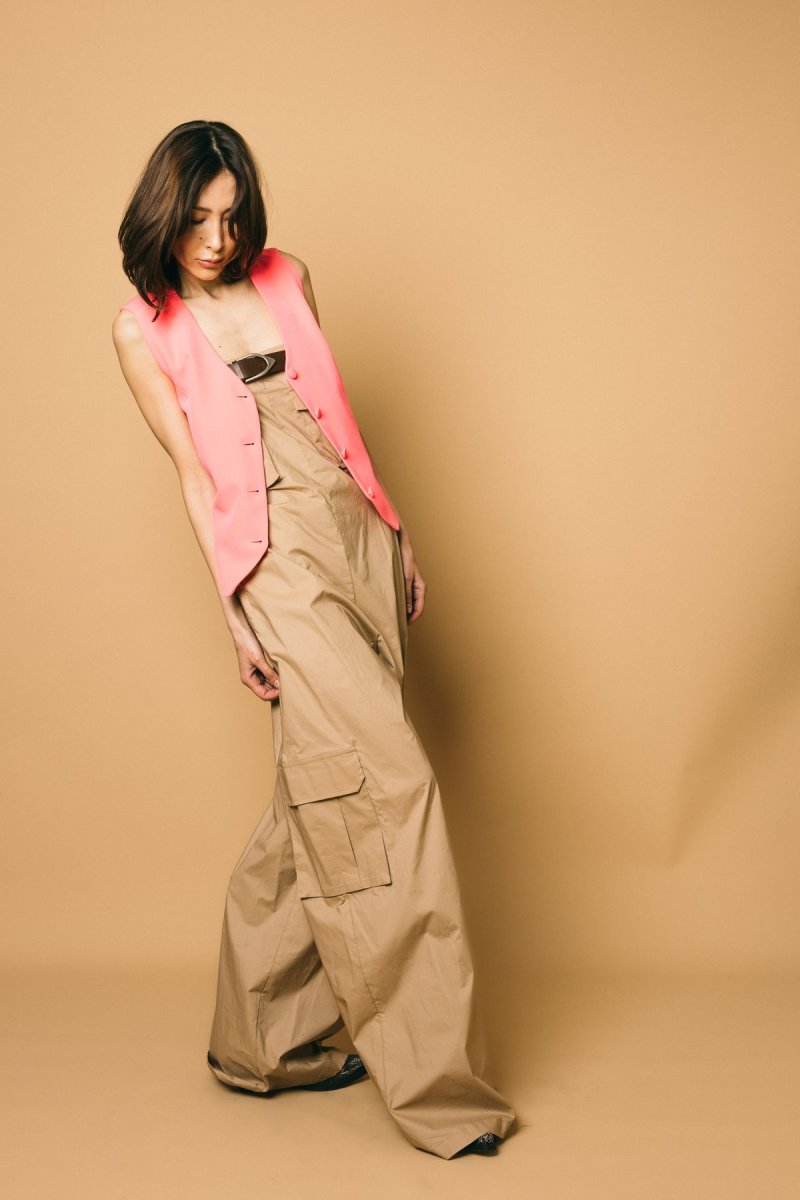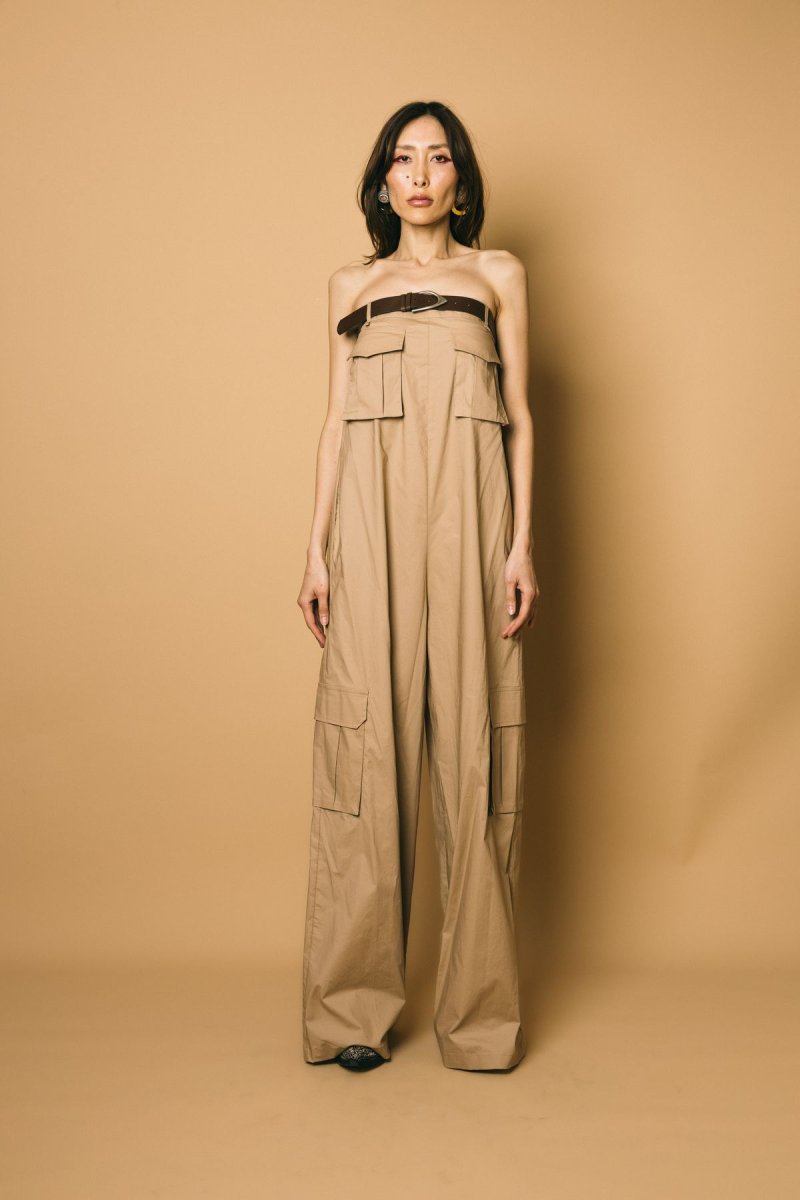 Tuta lunga e ampia in popeline di cotone con tasche e cintura inclusa sul petto. modello over con spalle scoperte Capo: 95% Cotone 5% Elastan Cintura: 64% Pelle Bovino, 36% PRR Particolari cintura: 100% Metallo/Fibra metallica/Metallizzata Composizione: 100% viscosa