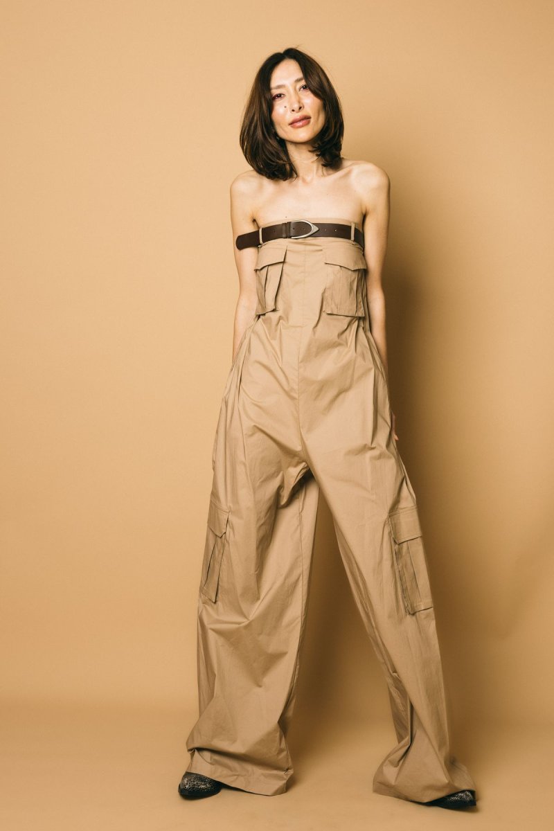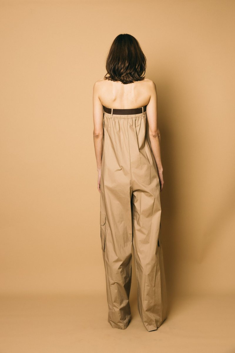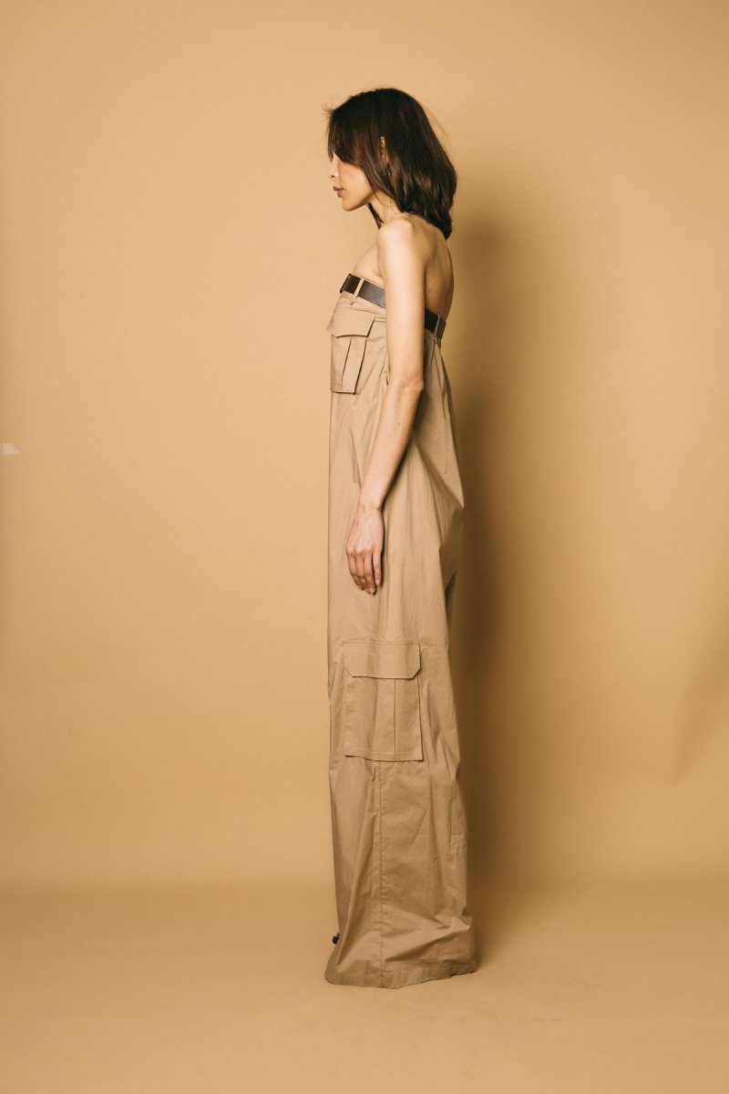 Tuta lunga e ampia in popeline di cotone con tasche e cintura inclusa sul petto. modello over con spalle scoperte
