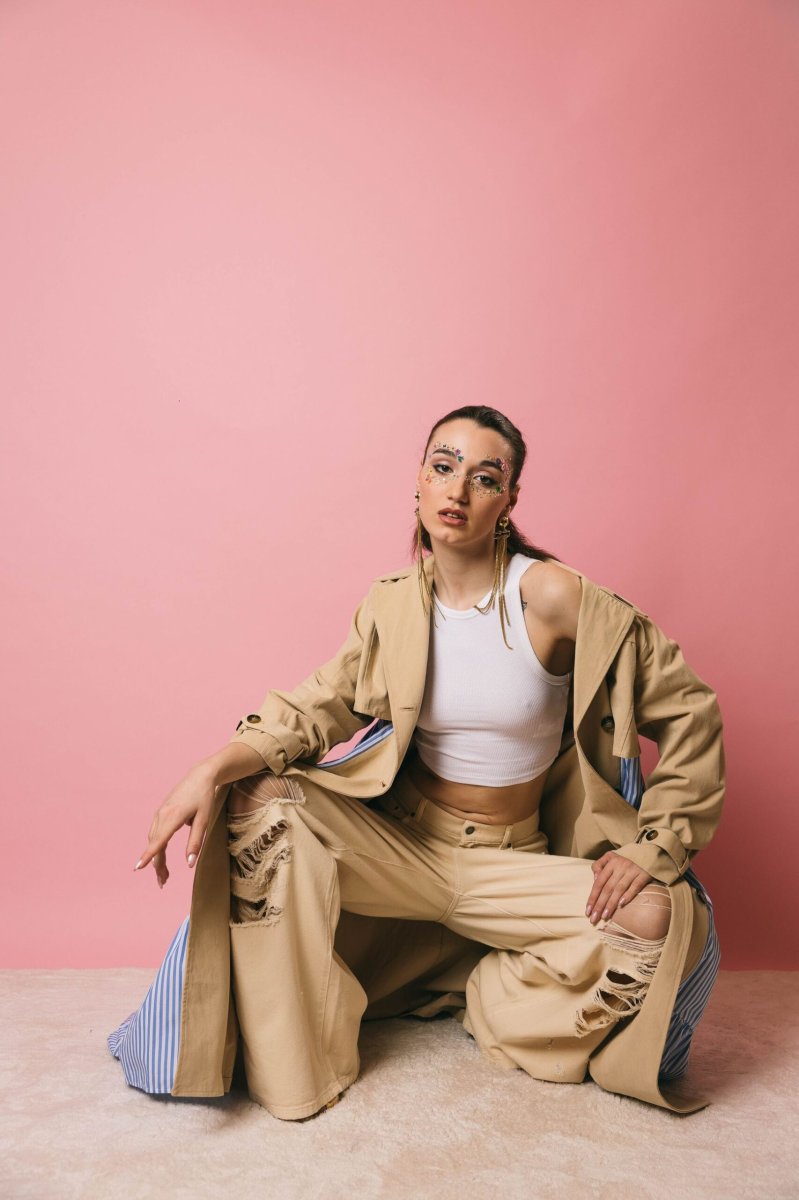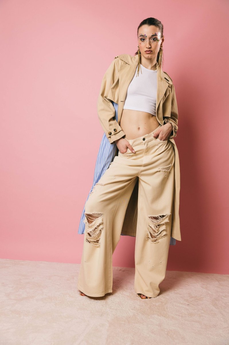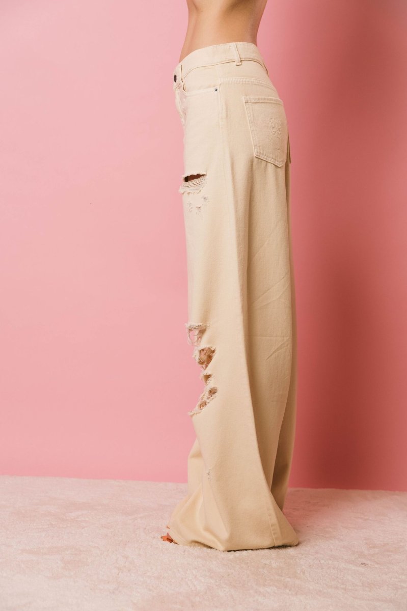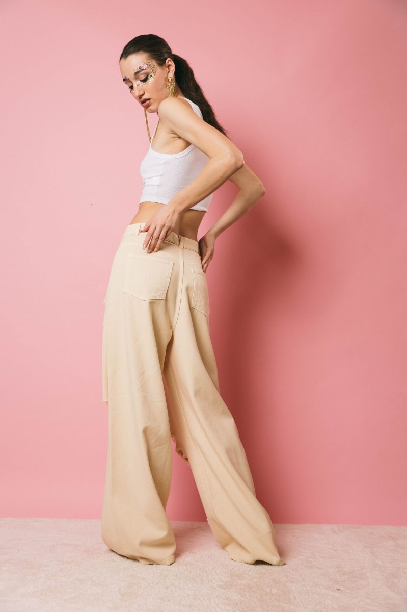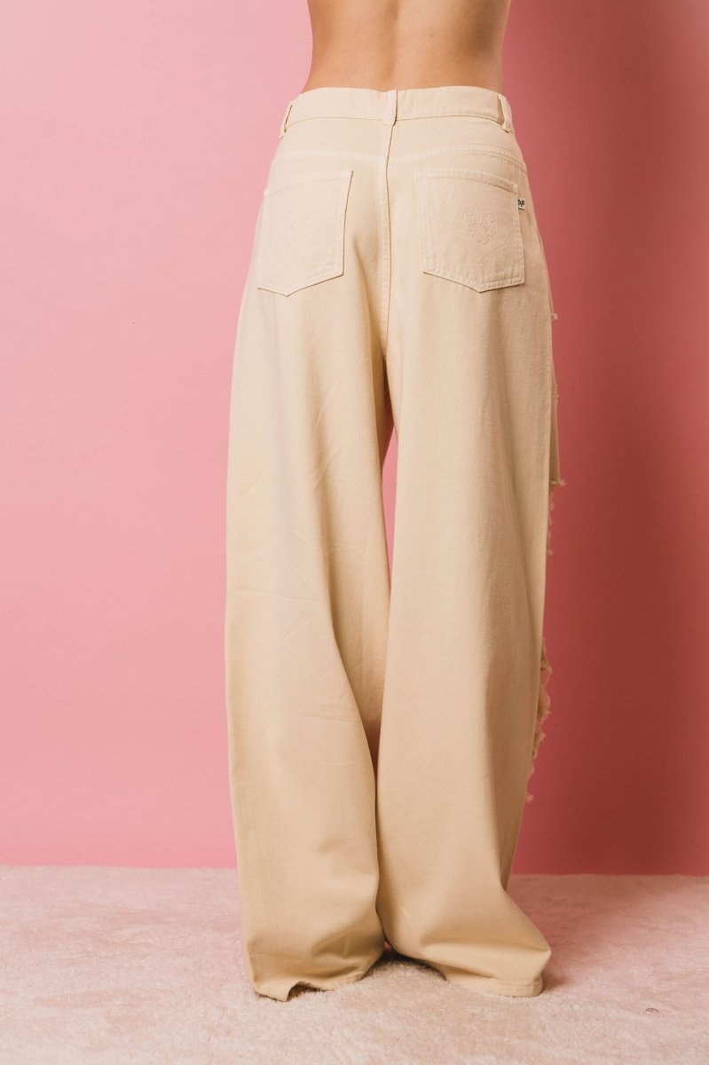 Pantalone denim in cotone vegetale 100% naturale, dettaglio rotture, gamba larga.