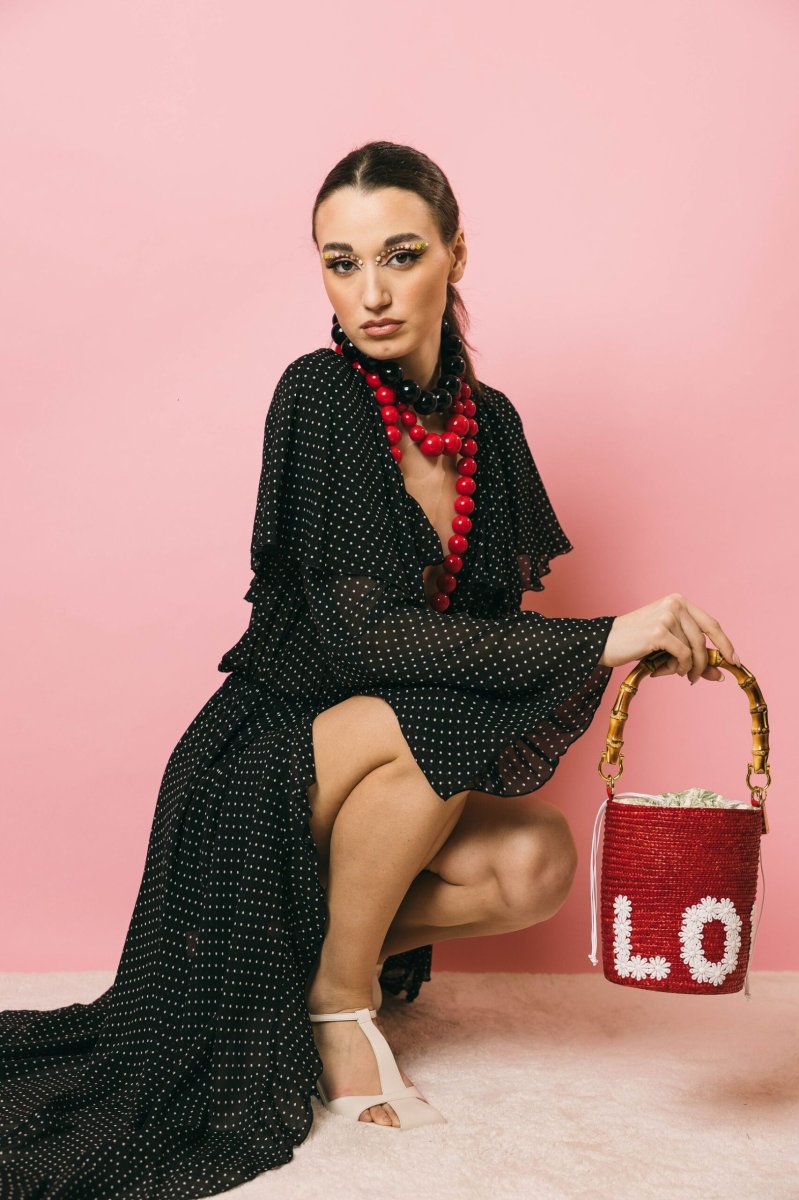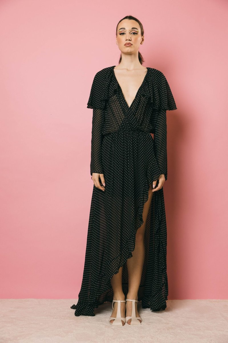 Lily è l’abito lungo che ruba la scena con il suo design contemporaneo e ricco di personalità. Le maniche a campana e i volant che incorniciano le spalle donando un tocco boho chic, mentre lo spacco con rouches dichiara audacia senza compromessi.