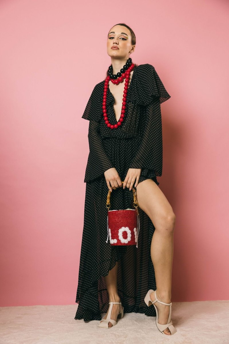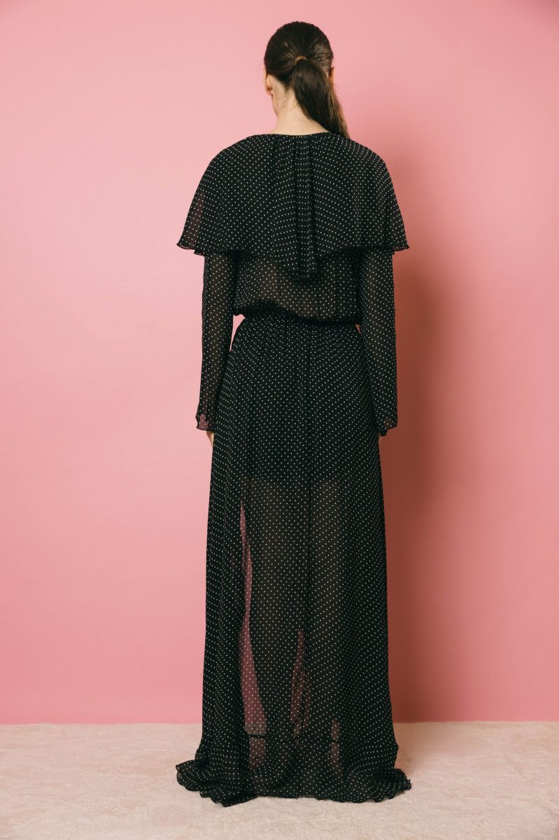 Abito lungo stampa pois fondo nero, spacco laterale, dettaglio rouge.