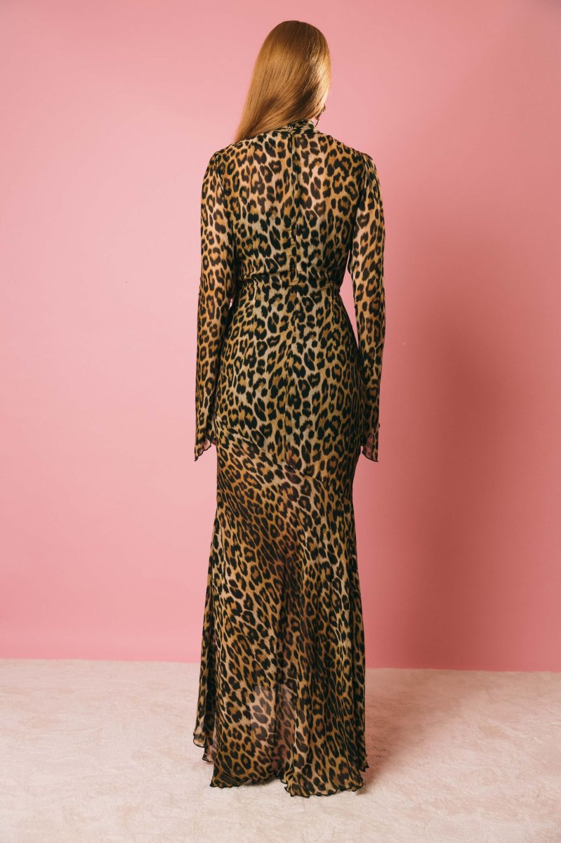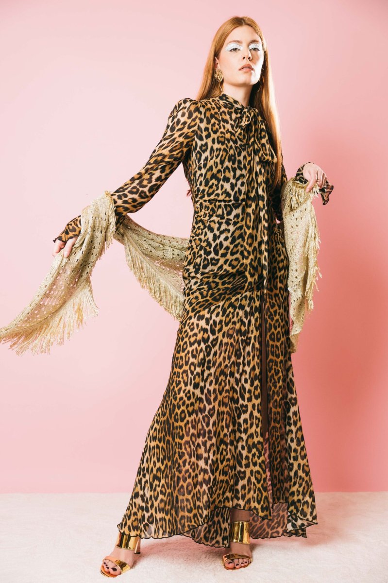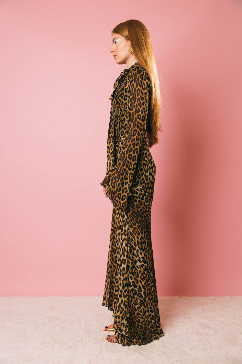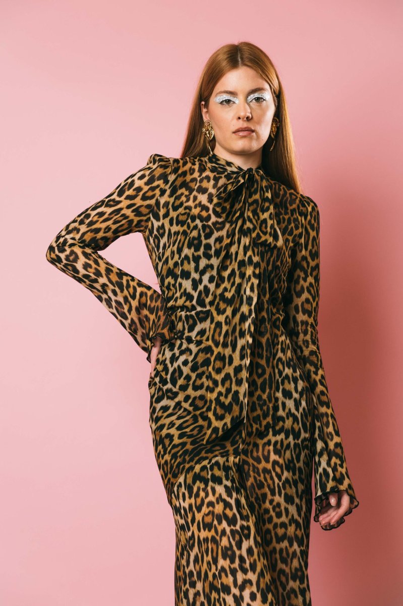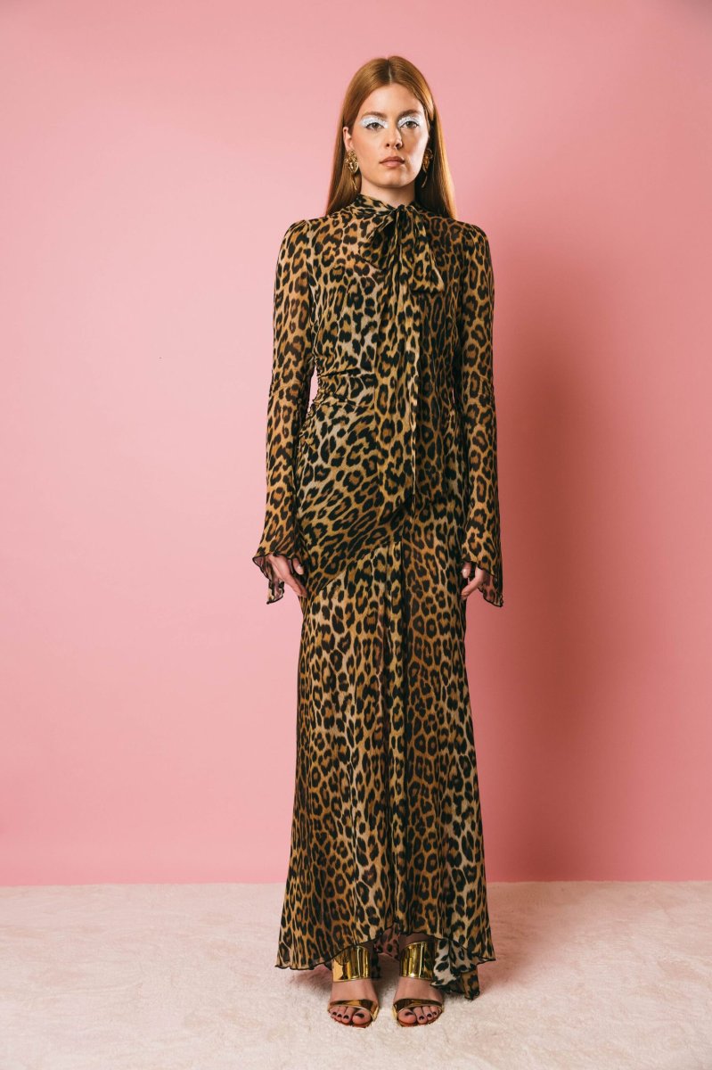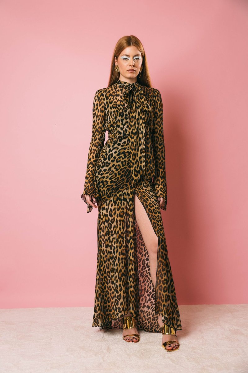 Abito lungo stampa animalier, collo con fiocco da annodare, spacco laterale, chiusura con zip posteriore.