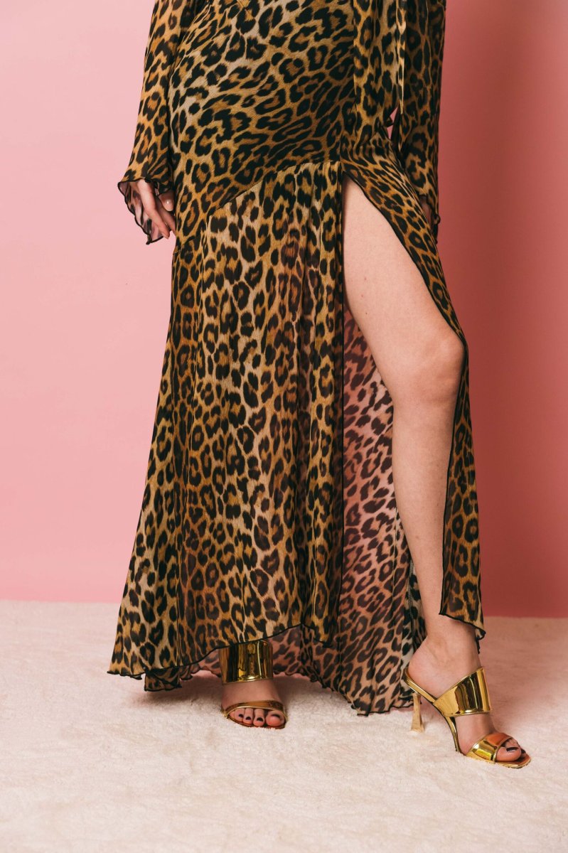 Lily è l’abito lungo con stampa animalier che conquista la scena. Realizzato in viscosa fluida, è rifinito con tagli asimmetrici, il drappeggio sul fianco e il collo a foulard per giocare con lo styling. Il maxi spacco sul lato esprime fascino a ogni passo.