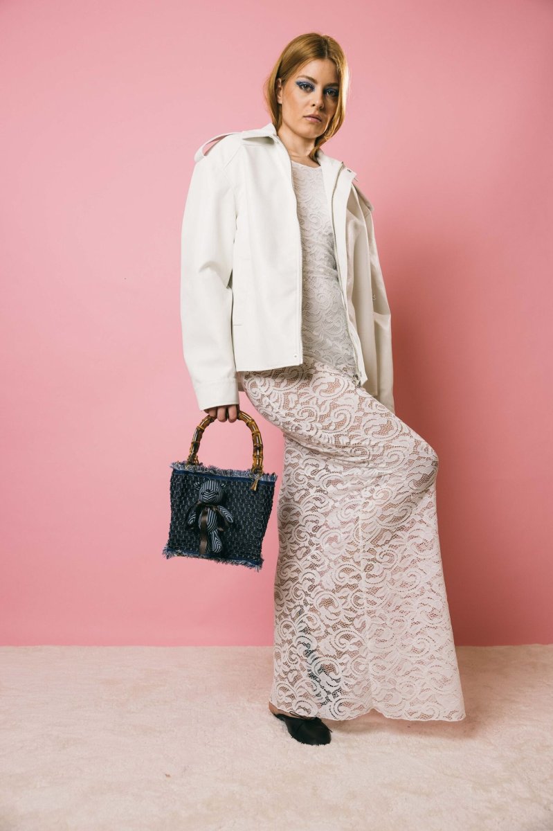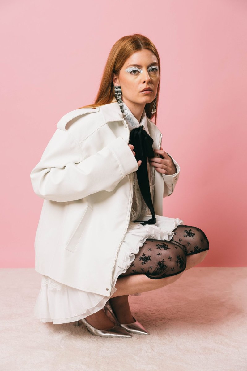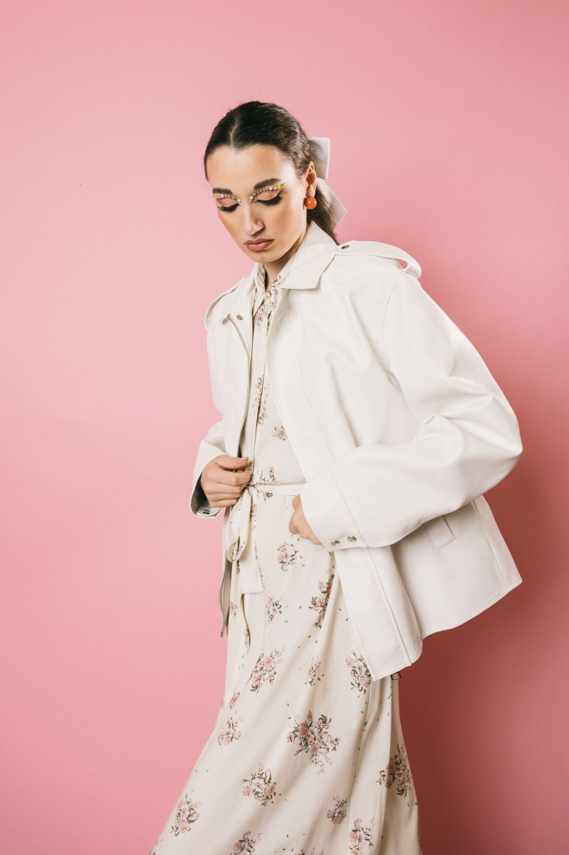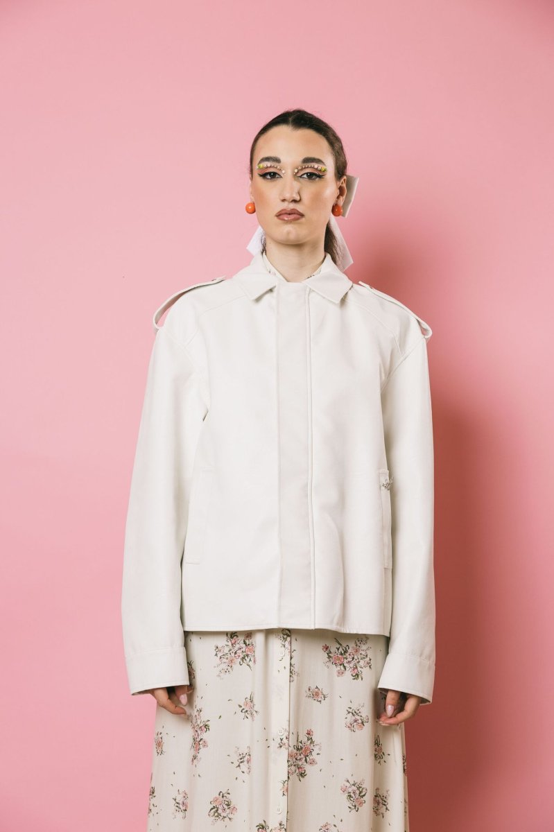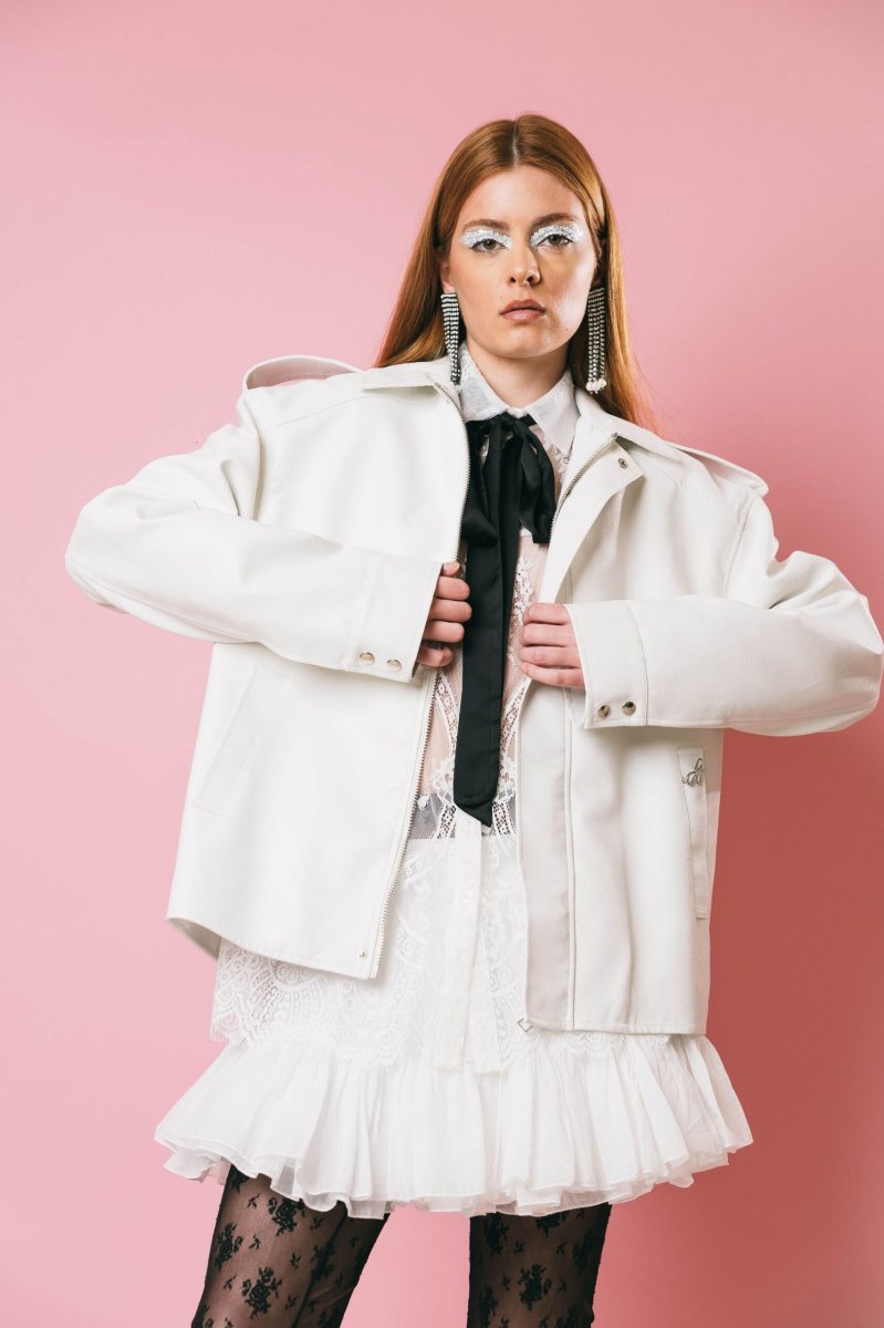 Ispirata al design del classico bomber, Ary aggiorna i look urbani con volumi over e dettagli decisi. Presenta spalle strutturate con mostrine decorative, il colletto a camicia, chiusura coperta e tasche a filetto per un’attitudine sofisticata. Il logo con strass è la nota iconica del brand.