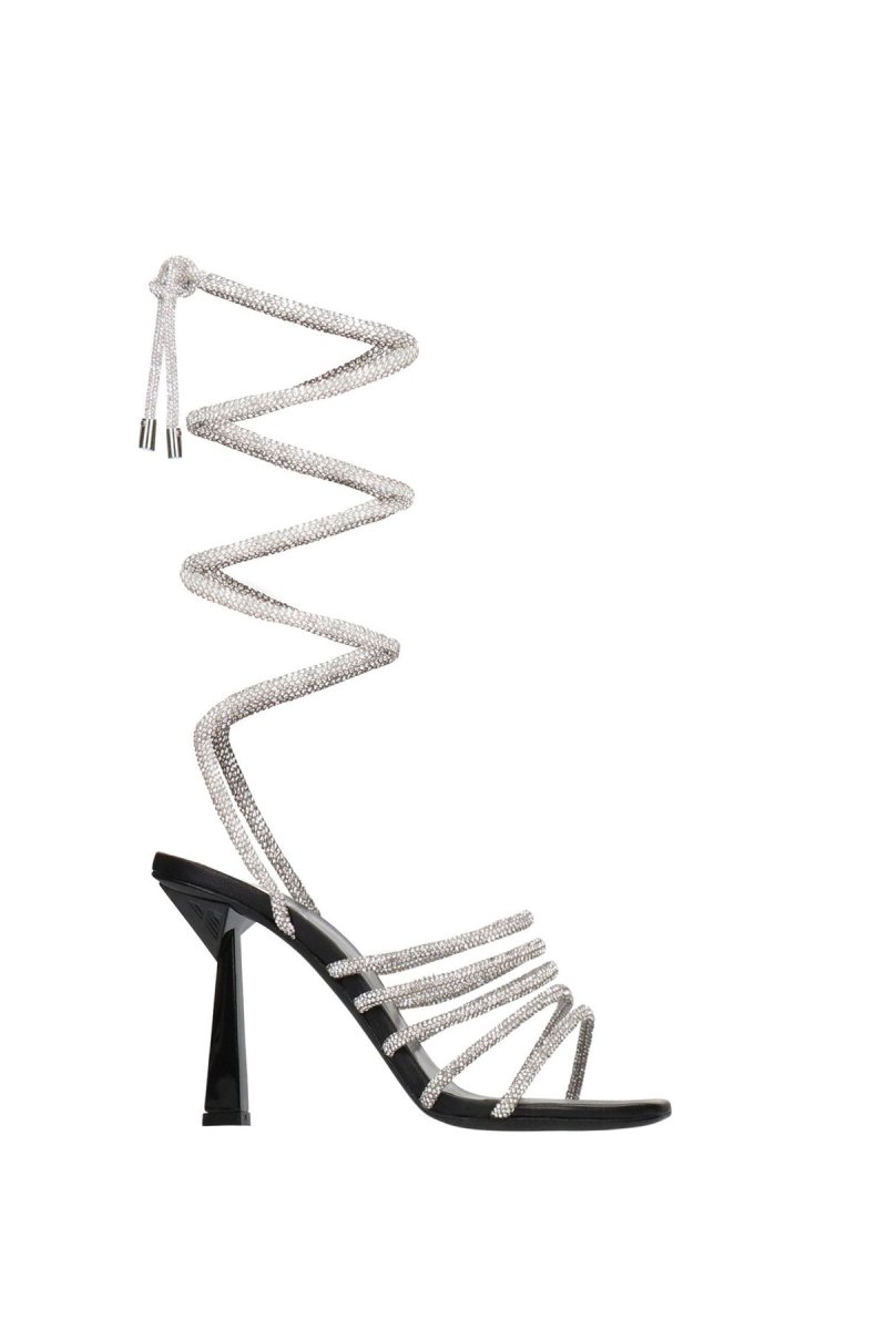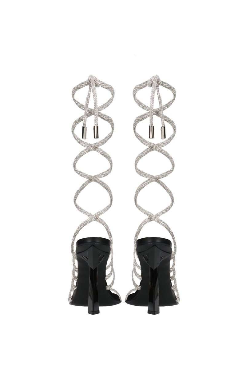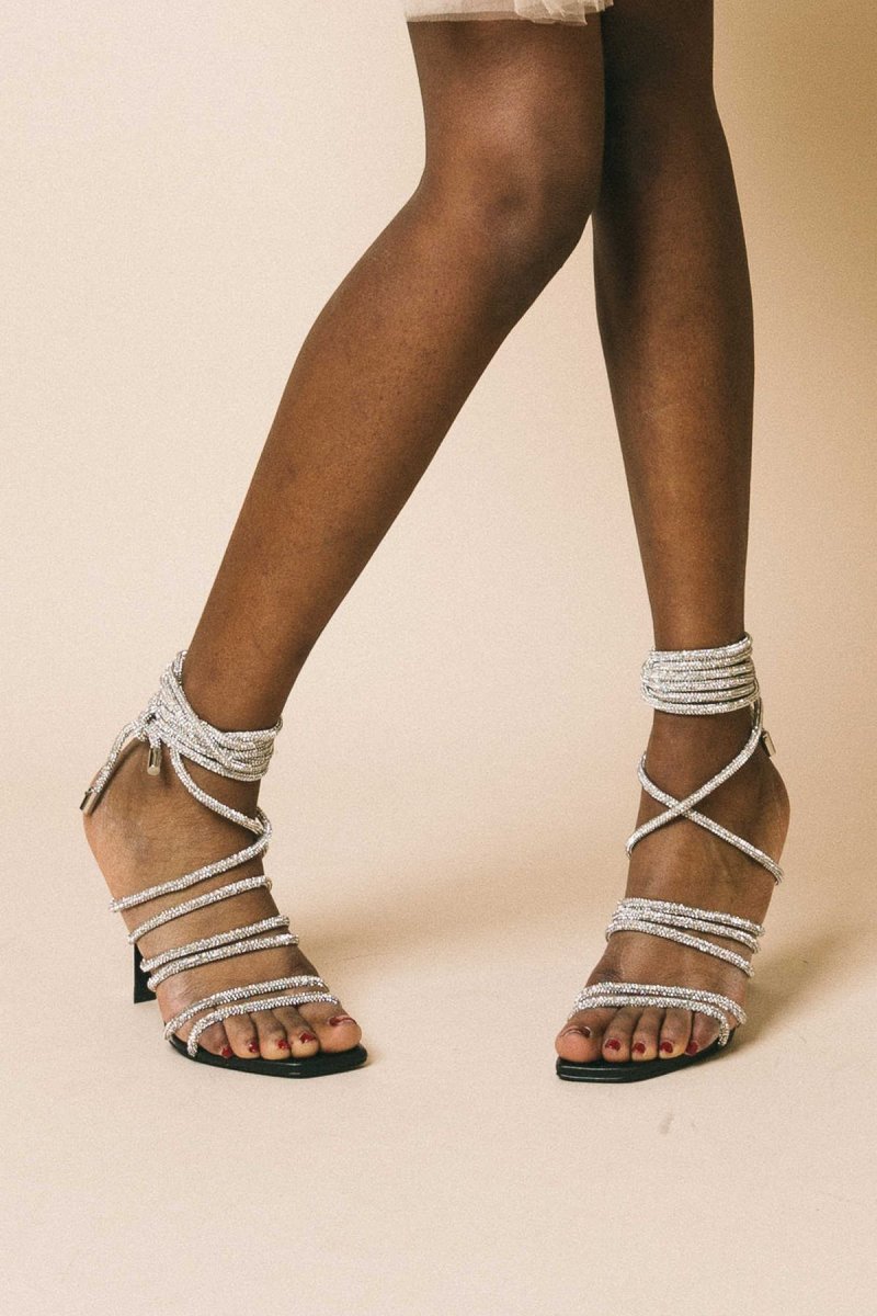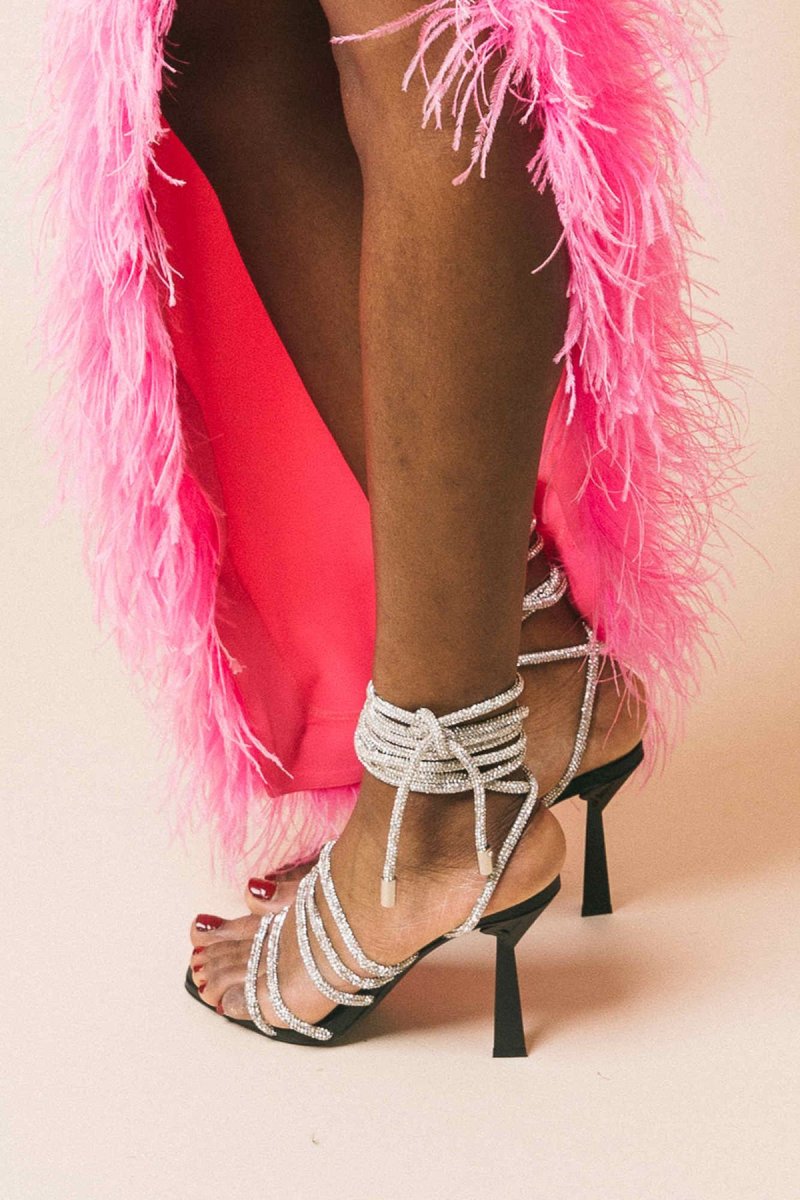 Sandalo gioiello con tacco, punta squadrata e lacci tempestati di swarosky.