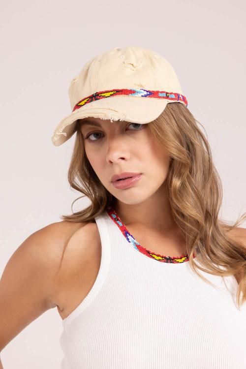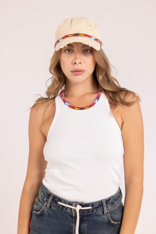 Cappello con visiera realizzato in puro cotone, caratterizzato da una tela effetto denim lavorata con rotture e strappi che richiamano un’estetica vintage autentica e ricercata. La costruzione artigianale valorizza ogni dettaglio: la visiera e il profilo del cappello sono impreziositi da ricami di perline multicolor rosso applicate con cura, capaci di creare un raffinato contrasto tra spirito urban e preziosità sartoriale. Sul retro, il logo del brand è ricamato a mano, testimonianza di un lavoro attento e di alta manifattura. Un accessorio ricercato, pensato per completare il look con personalità e qualità autenticamente italiana.