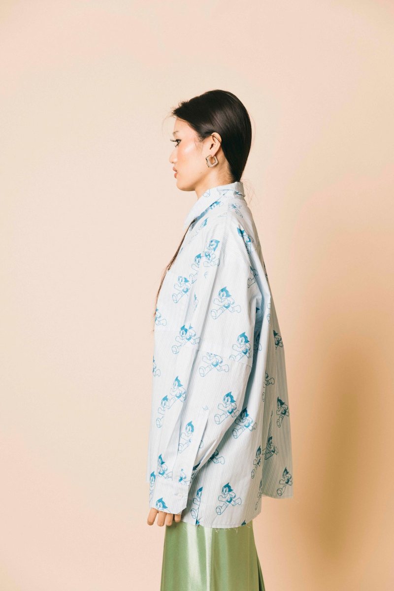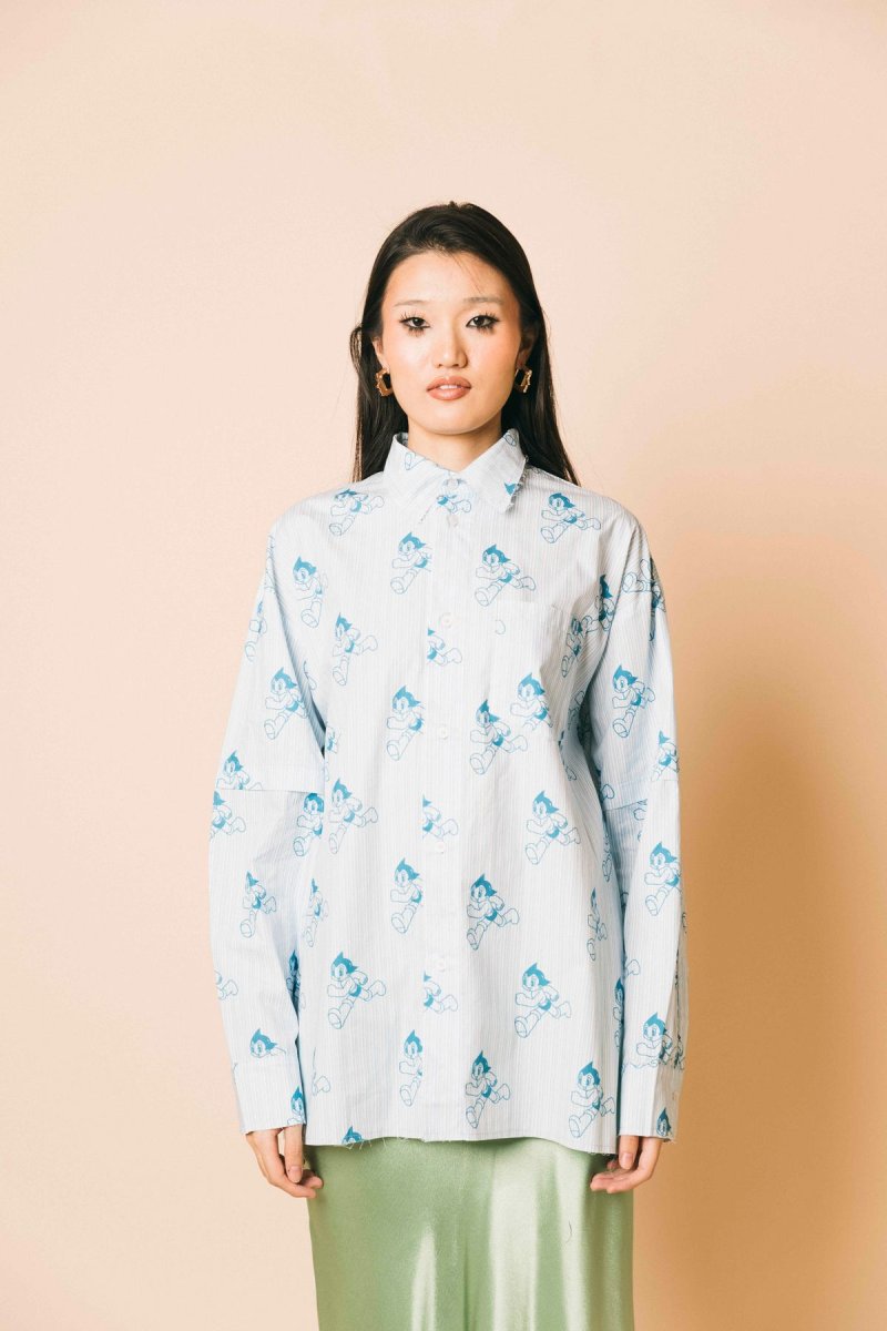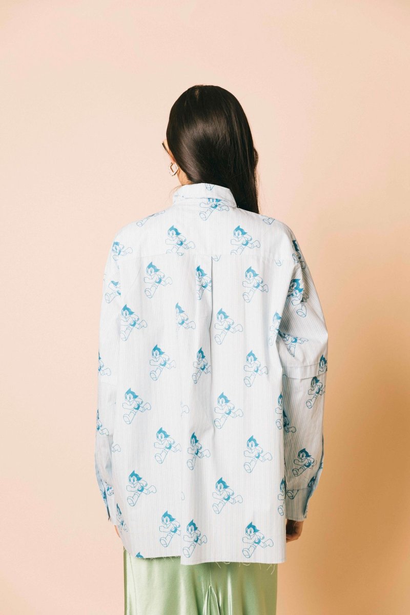 Camicia over in cotone popeline micro righe stampa Astroboy colletto sfilacciato Misura indossata in foto: S Altezza modella: 1.77m