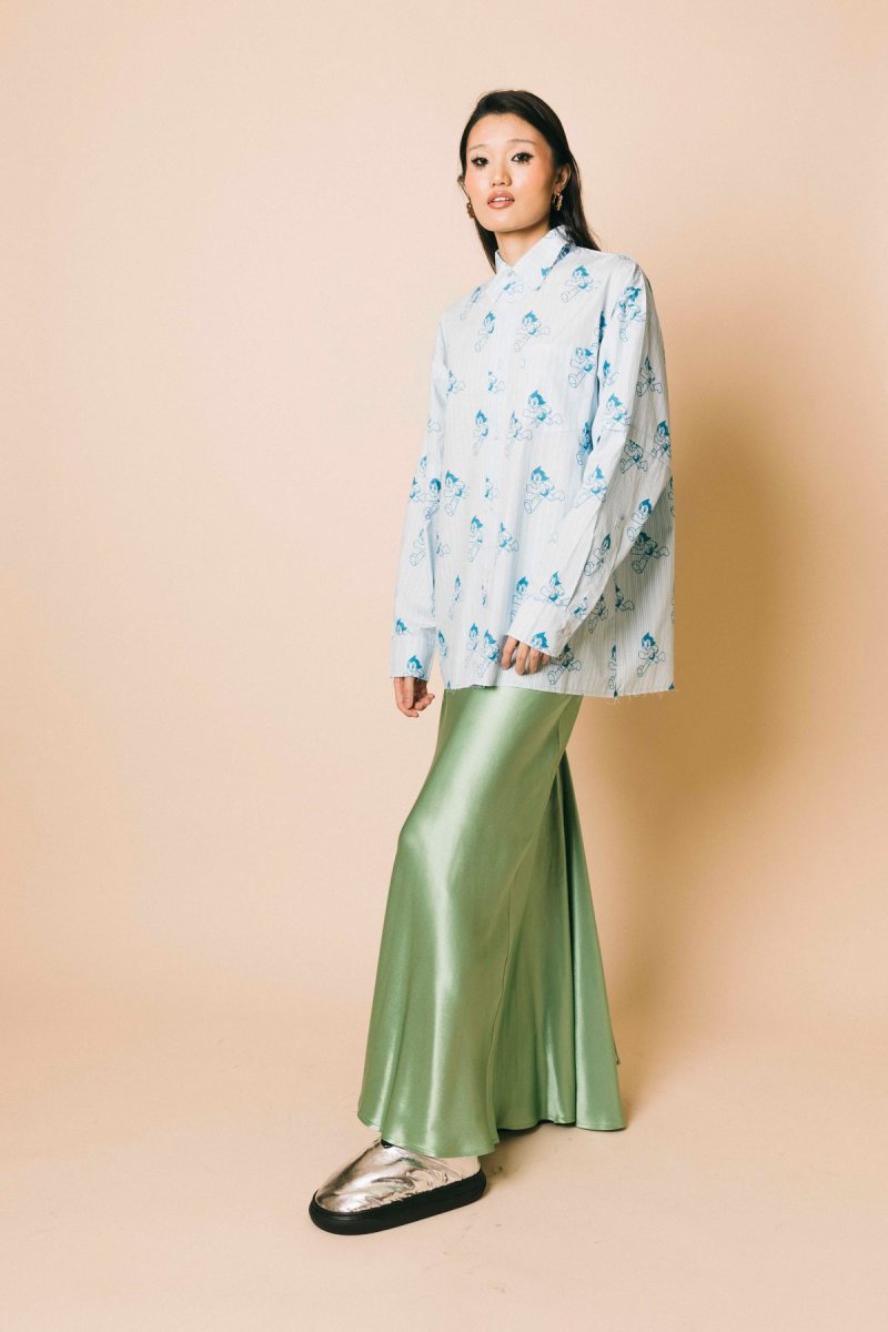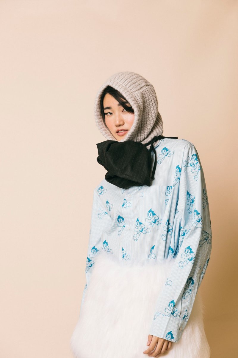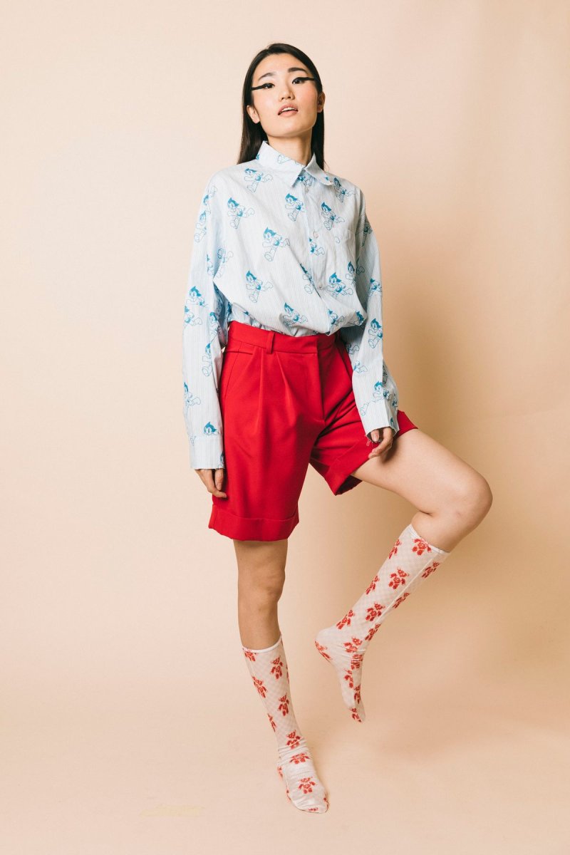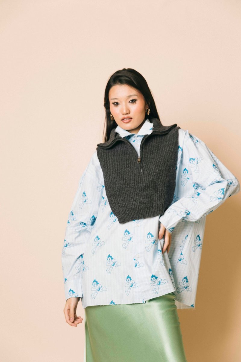 Camicia over in cotone popeline micro righe stampa Astroboy colletto sfilacciato Misura indossata in foto: S Altezza modella: 1.77m