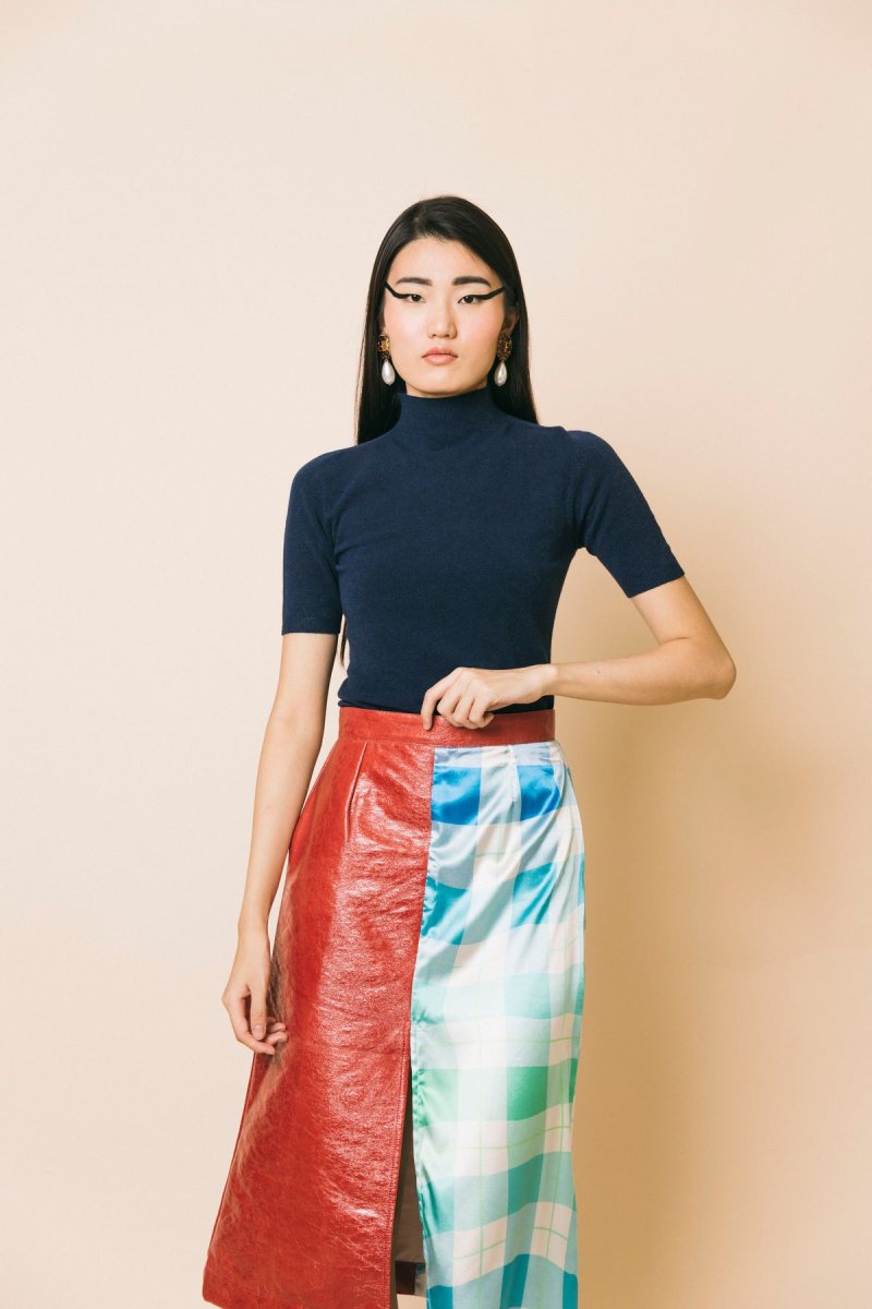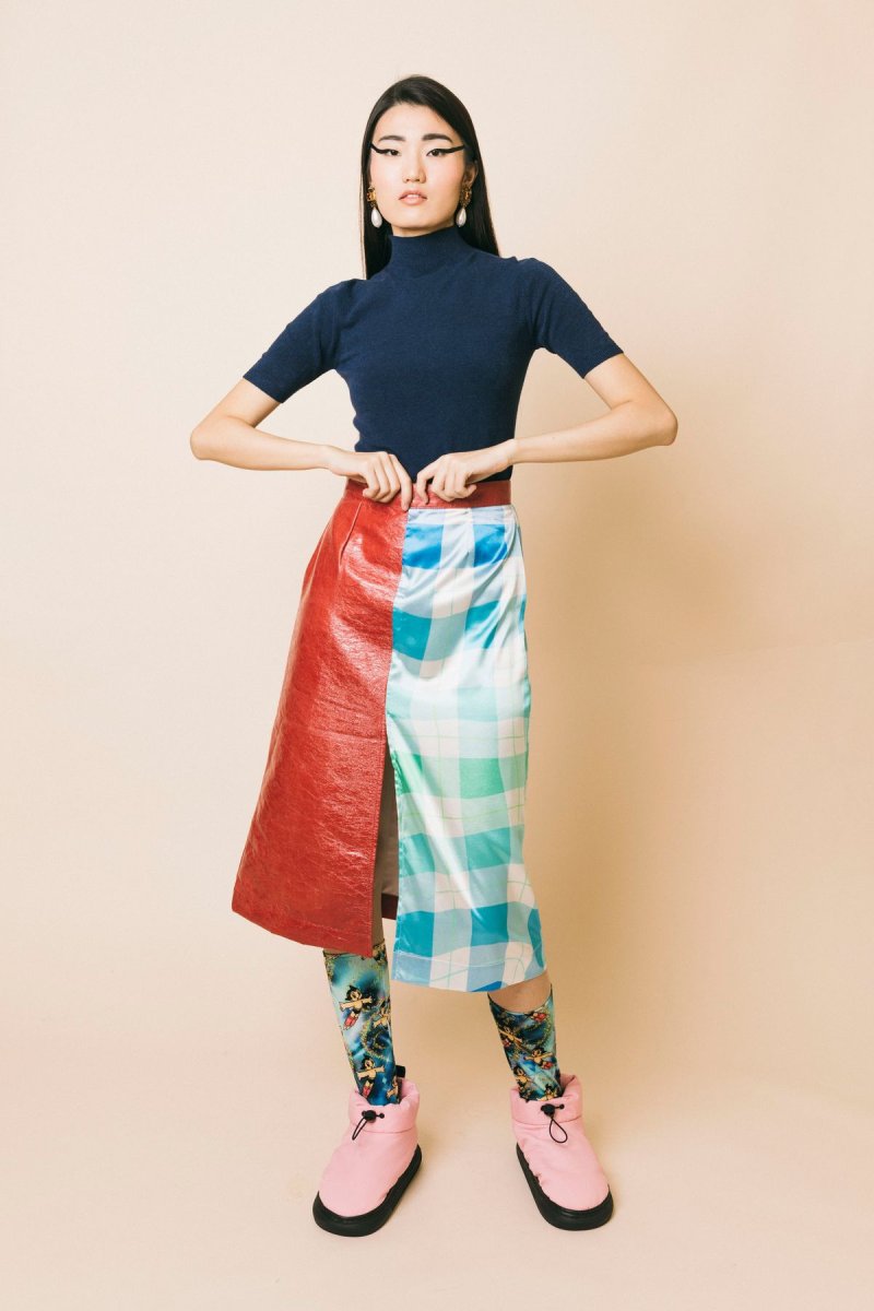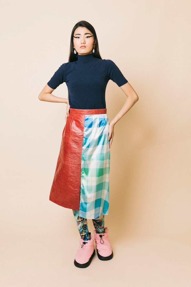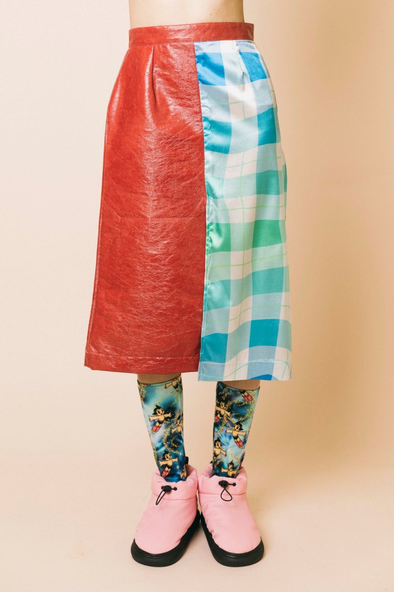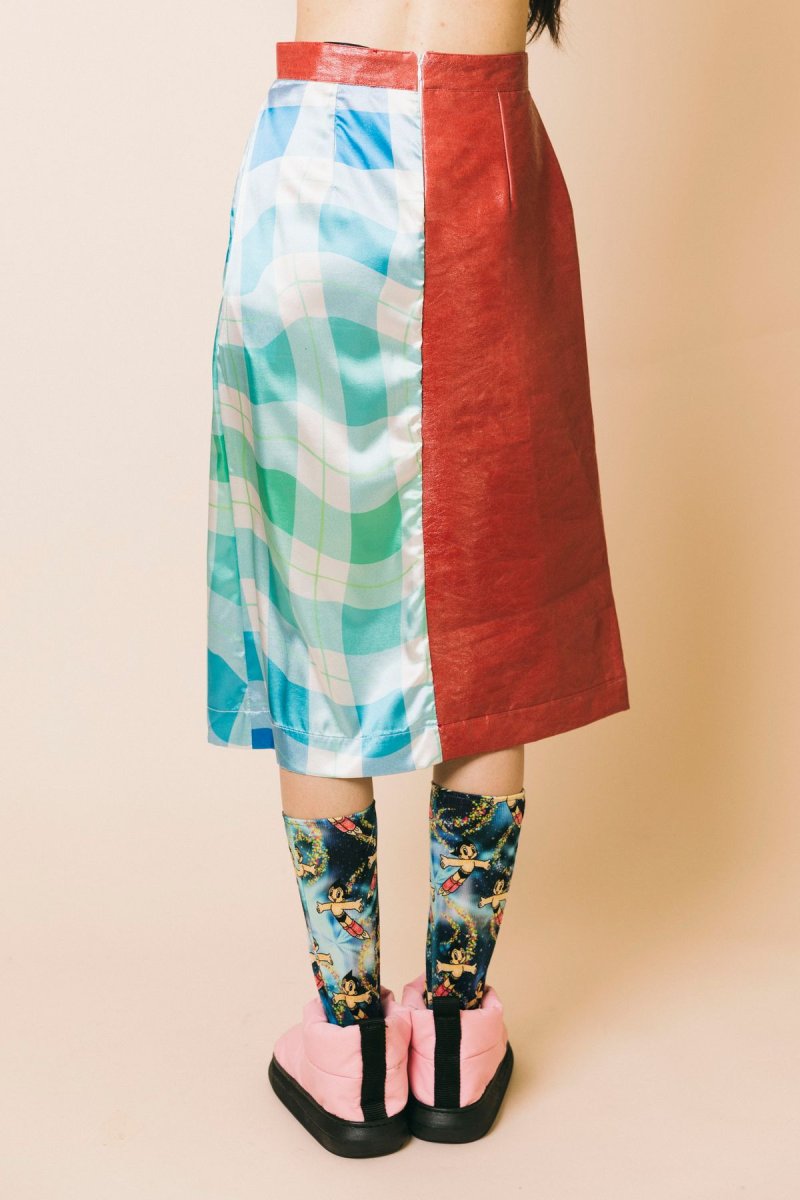 Gonna longuette doppio tessuto ecopelle-satin stampa a quadri azzurro