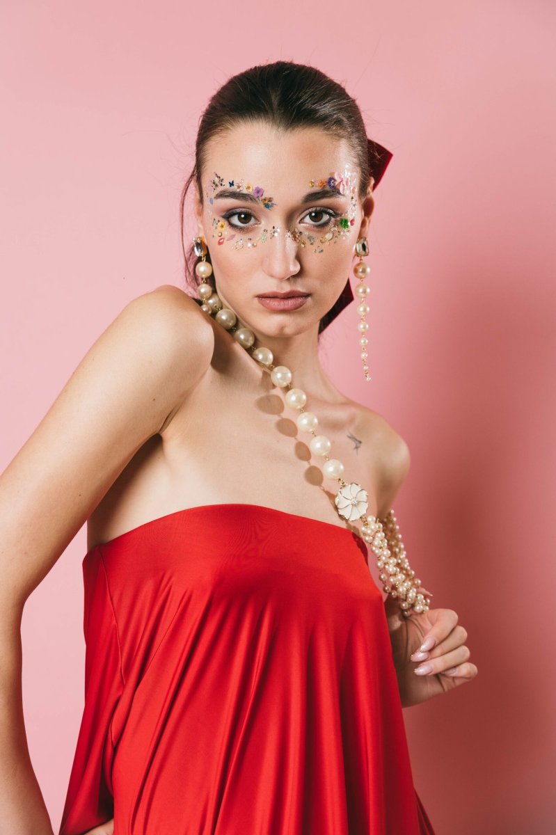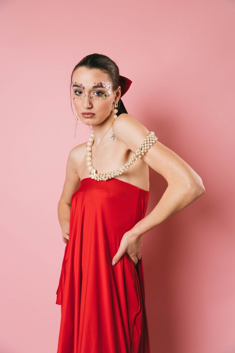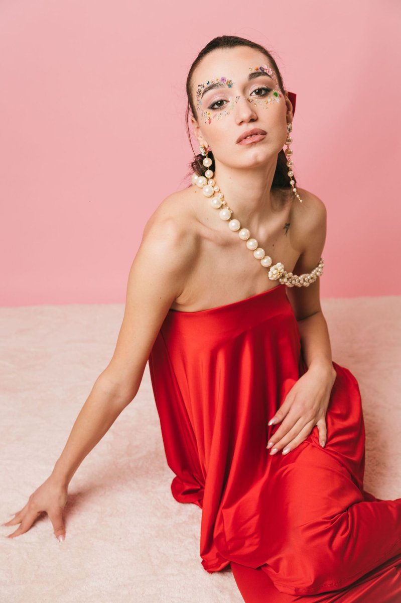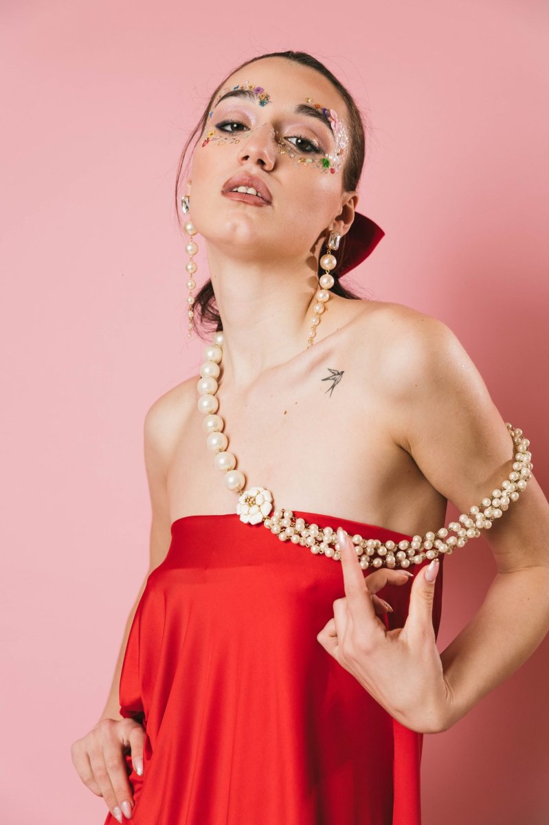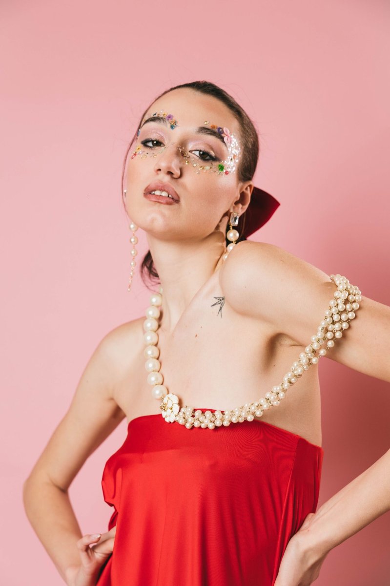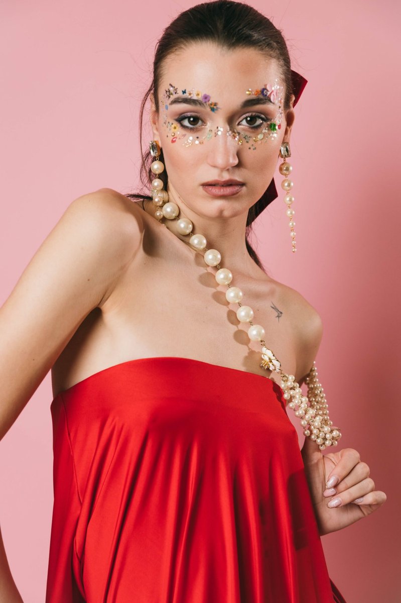 Collana lunga caratterizzata da camelia base oro e più fili di perle.