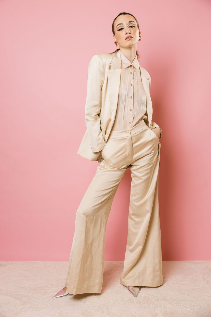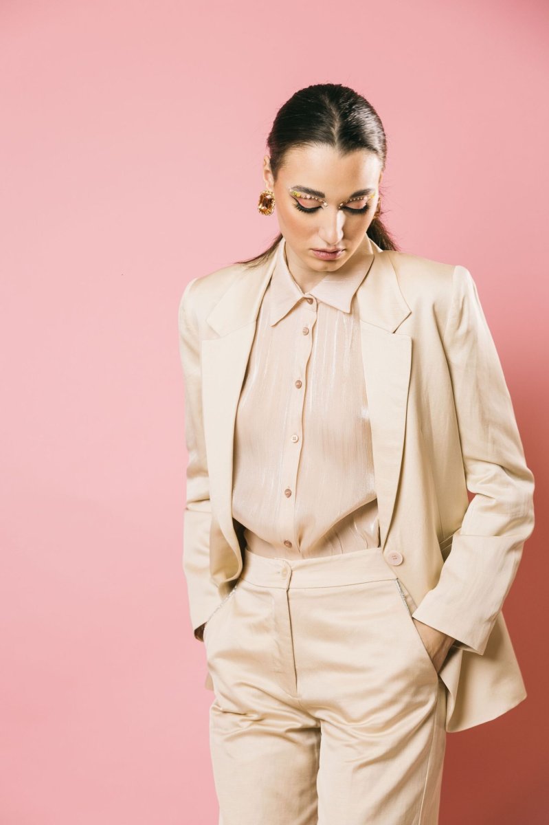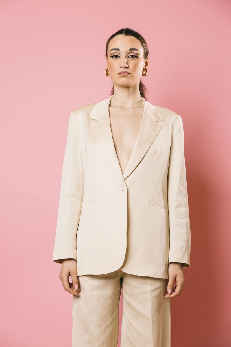 Blazer in raso con spalline, collo a revers e tasche a filetto sul davanti. Presenta uno spacco sul retro e una chiusura frontale con bottone. La scelta ideale per outfit eleganti e ricercati.