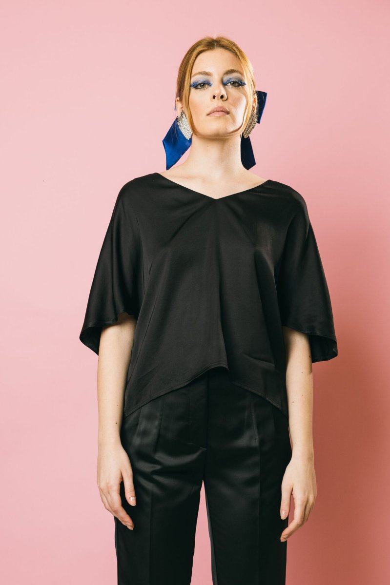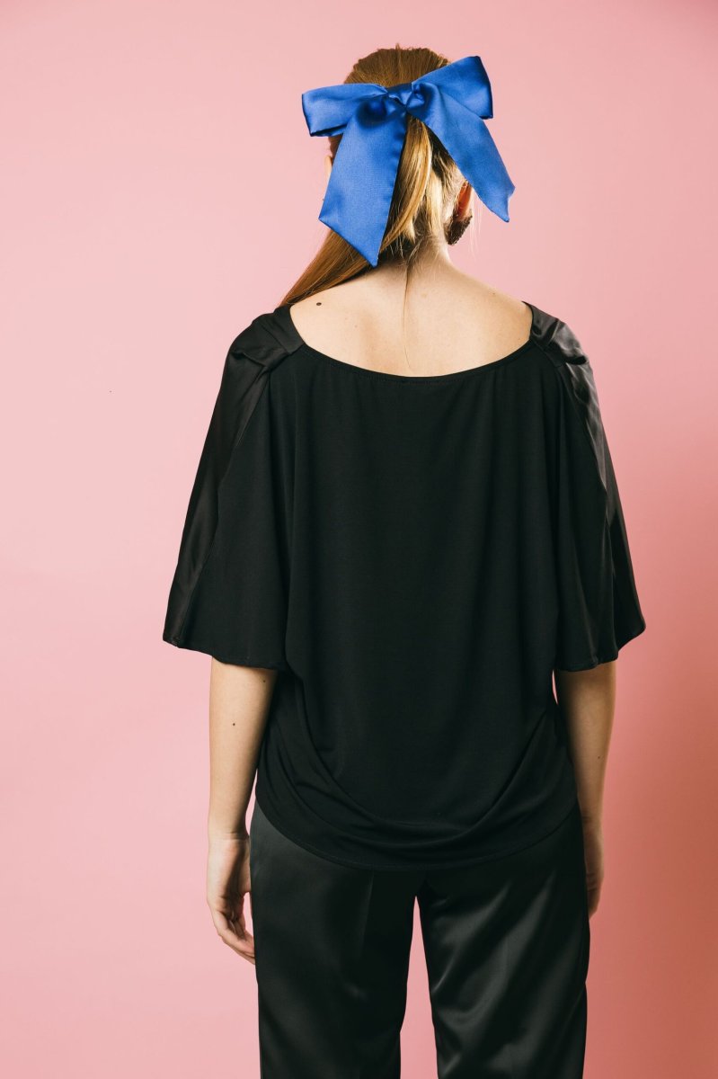 Una blusa raffinata che unisce il pregio del satin sul davanti alla morbidezza della maglia sul retro, garantendo comfort e stile. Il design a scatolina, arricchito da delicate pieghe sulle spalle, dona movimento e armonia alla silhouette, mentre la mezza manica ampia aggiunge un tocco di leggerezza. Un capo estremamente versatile, perfetto per completare con eleganza sia look formali che abbinamenti easy-glamour.