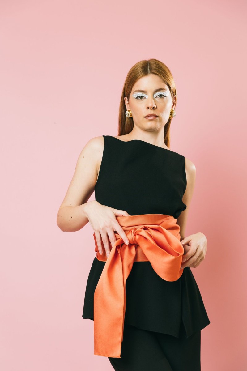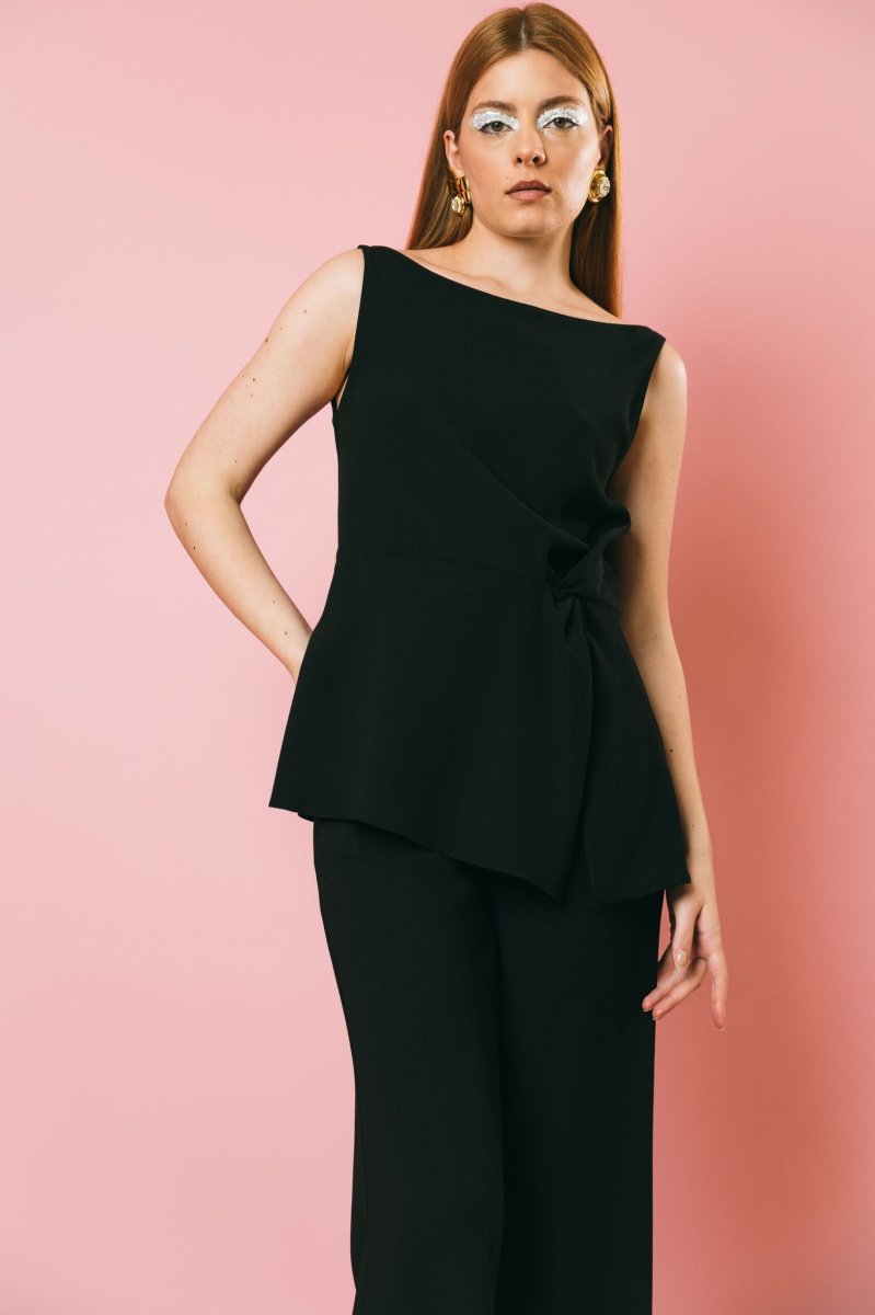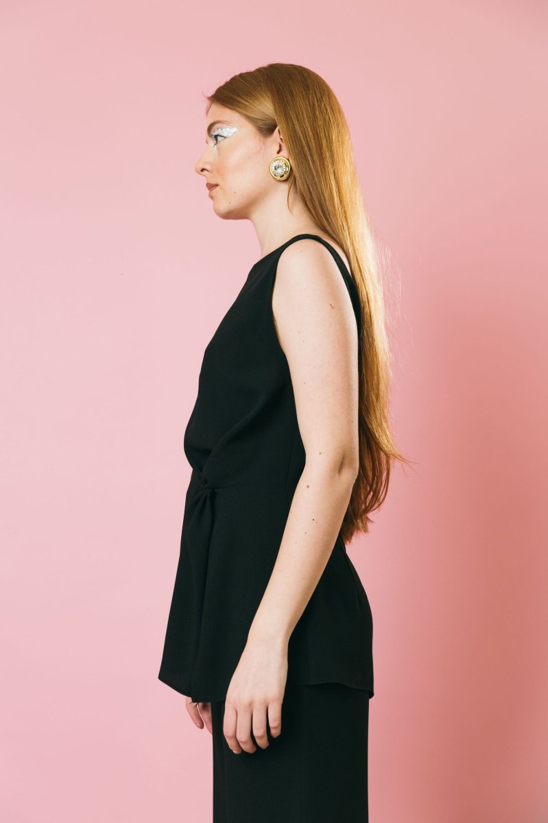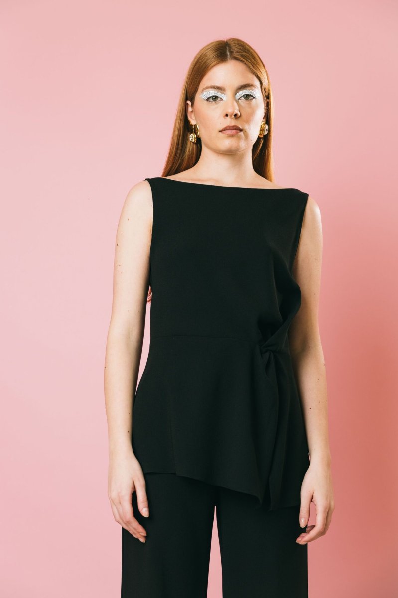 Top lungo senza maniche con dettaglio nodo e cut-out frontale. Presenta una schiena scoperta e si chiude con una cerniera posteriore. Perfetta per completare look eleganti.