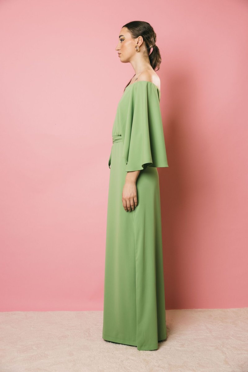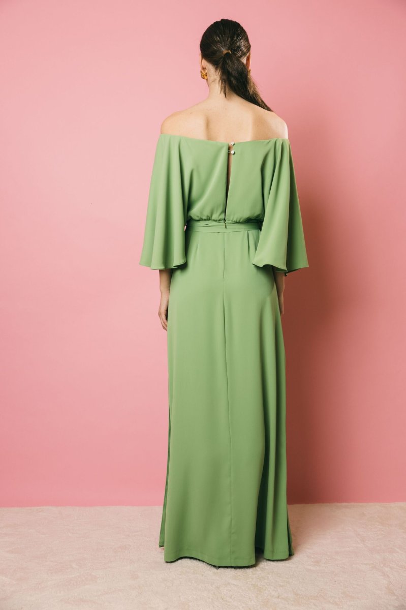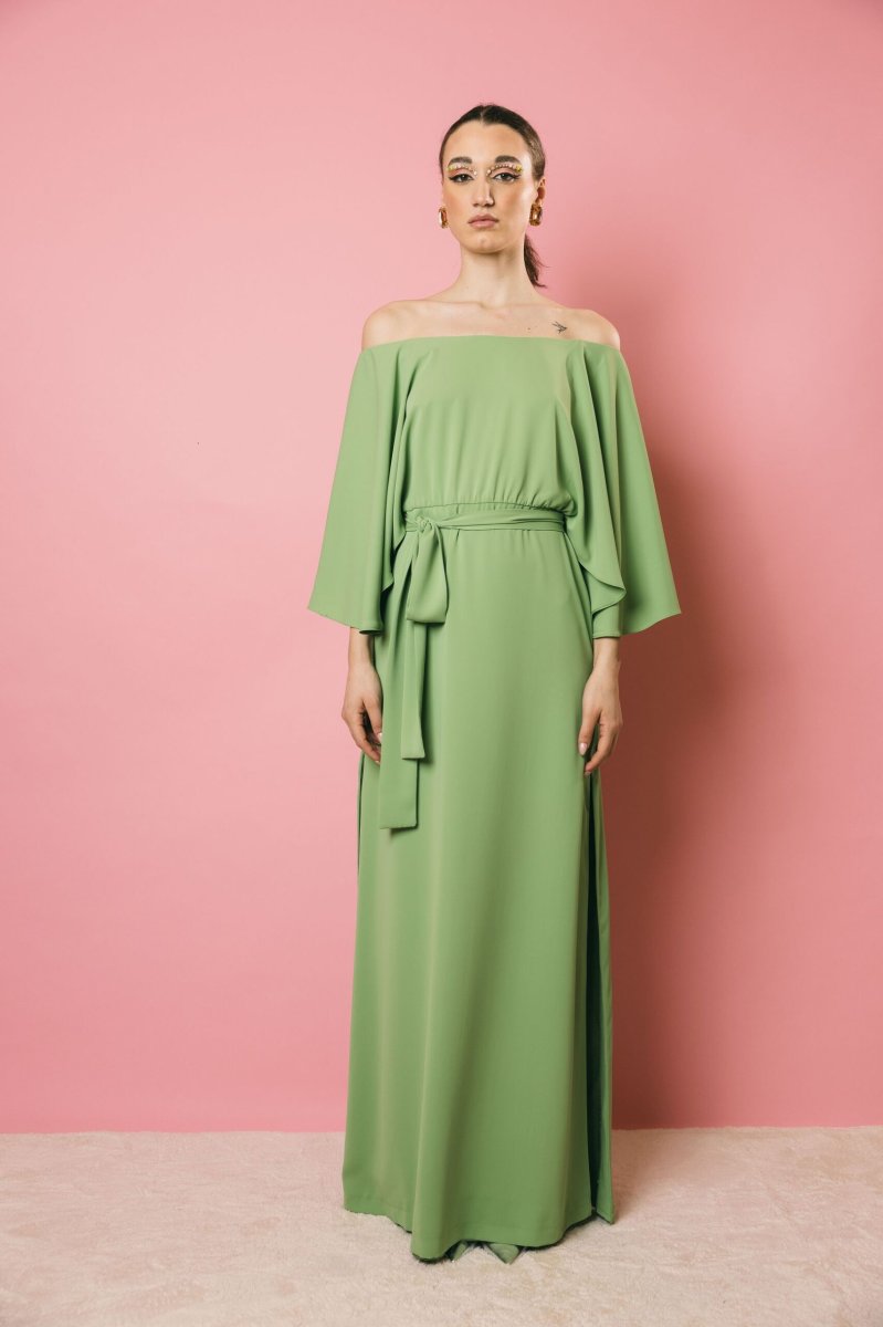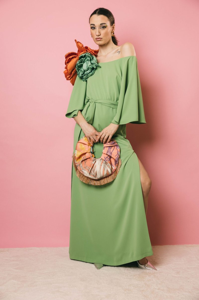 Un abito lungo con scollo a barca dall’eleganza raffinata, con maniche a campana che donano movimento e leggerezza. Il taglio sotto il seno e le aperture laterali modulabili secondo le esigenze, creano un gioco di linee armonioso, mentre la cintura in vita permette di enfatizzare la silhouette. La zip posteriore a scomparsa assicura una chiusura impeccabile. Un capo sofisticato e versatile, perfetto per chi ama un’eleganza ricercata e personalizzabile.