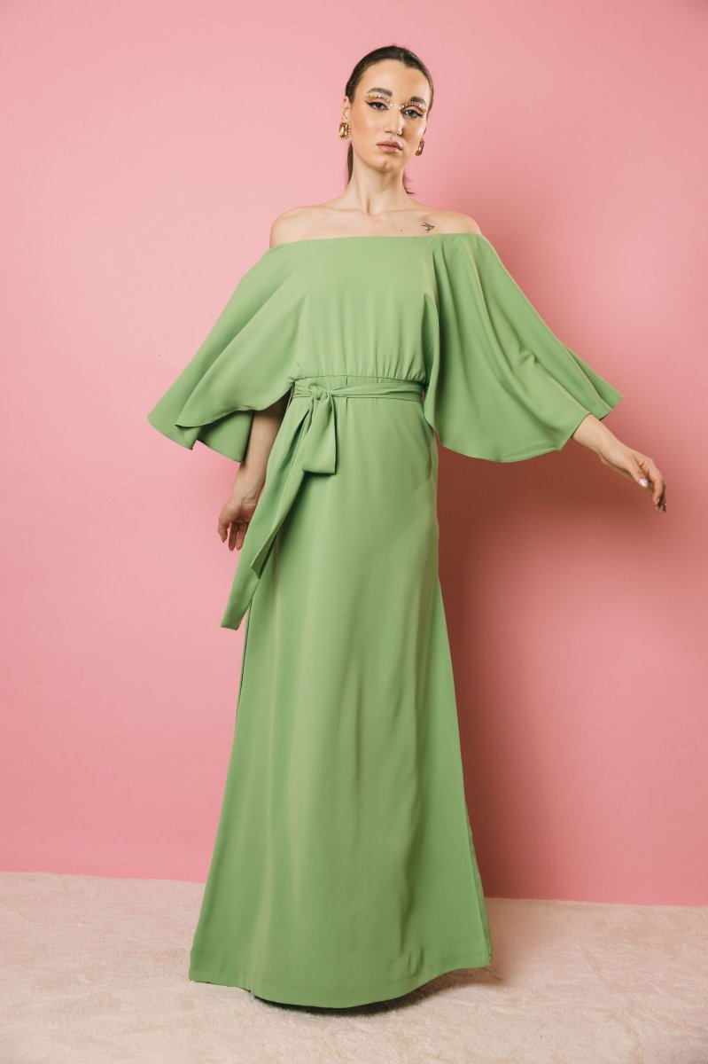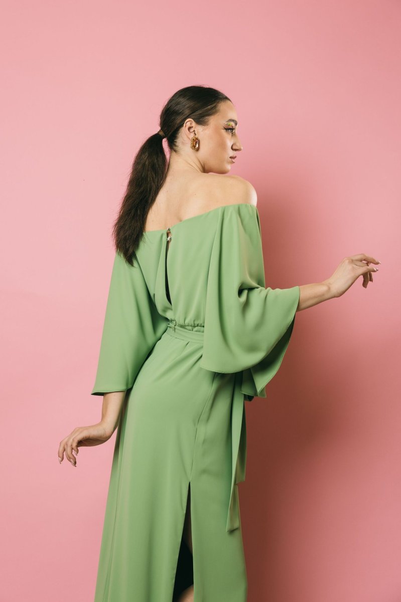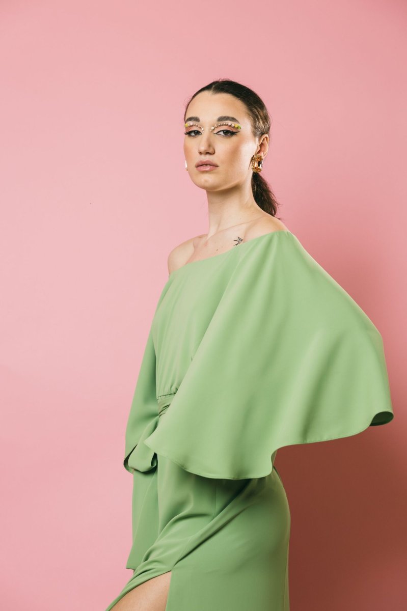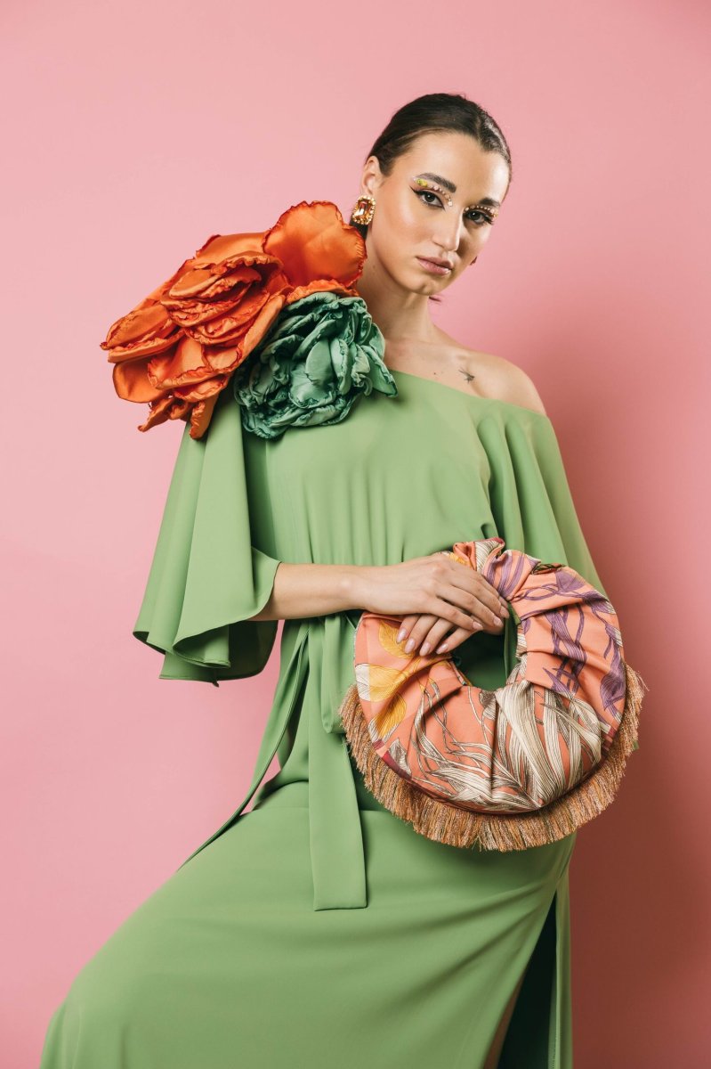 Un abito lungo con scollo a barca dall’eleganza raffinata, con maniche a campana che donano movimento e leggerezza. Il taglio sotto il seno e le aperture laterali modulabili secondo le esigenze, creano un gioco di linee armonioso, mentre la cintura in vita permette di enfatizzare la silhouette. La zip posteriore a scomparsa assicura una chiusura impeccabile. Un capo sofisticato e versatile, perfetto per chi ama un’eleganza ricercata e personalizzabile.
