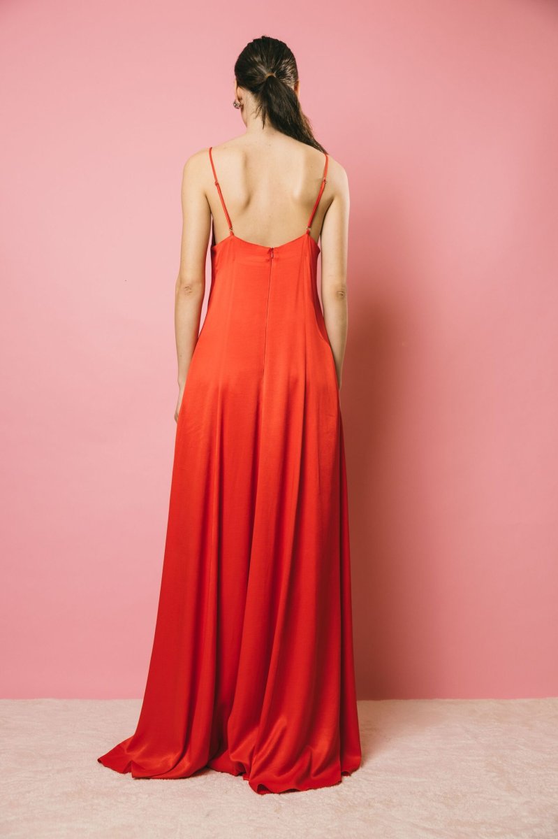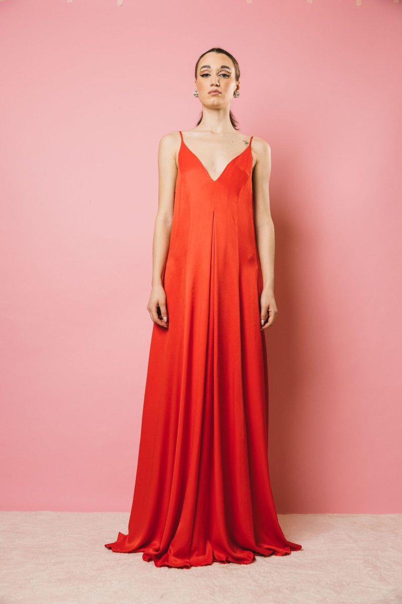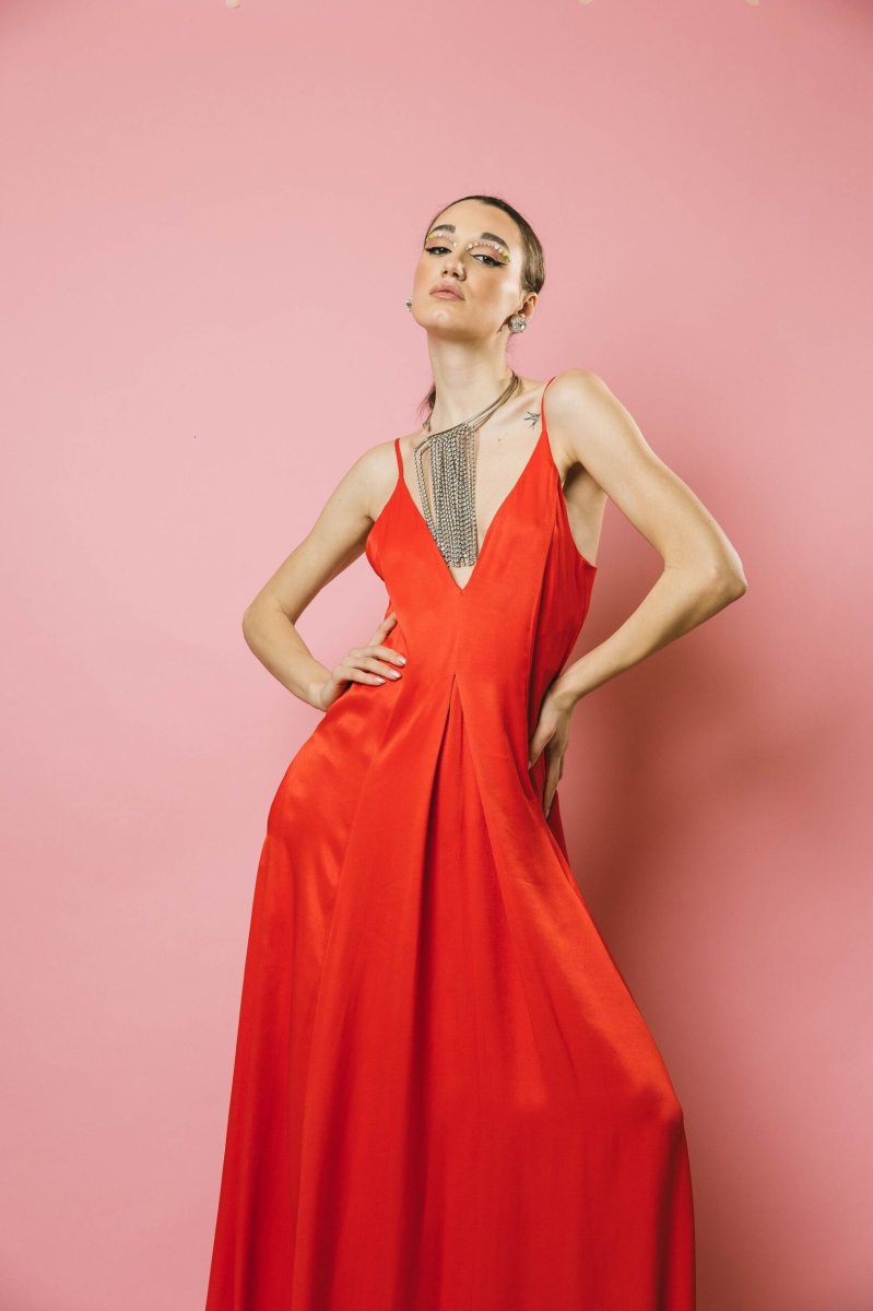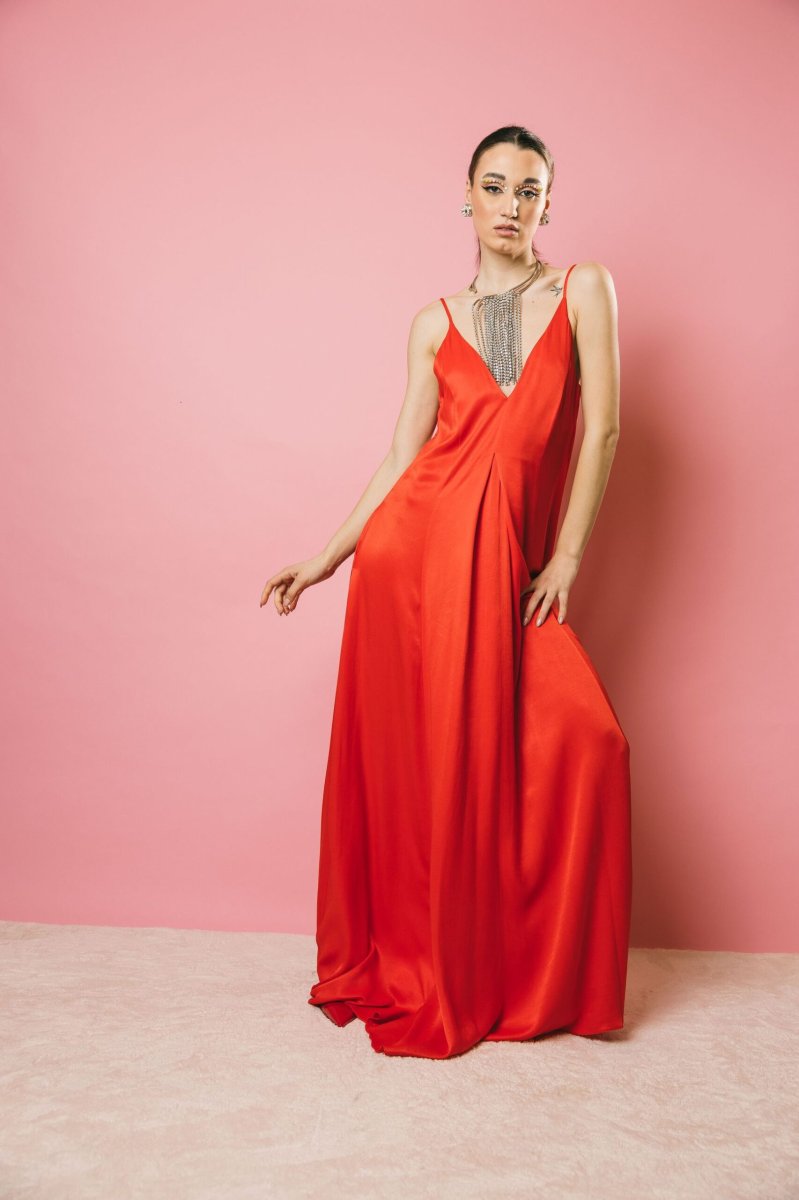 Un maxi abito in raso dalla bellezza fluida e strutturata, con scollo a V e sottili bretelline regolabili per una vestibilità impeccabile. Il soffietto frontale aggiunge movimento e armonia alla silhouette, mentre le tasche laterali donano un tocco di eleganza disinvolta. raffinato e sofisticato, è la scelta perfetta per occasioni importanti, ideale da interpretare con stile ed eleganza.