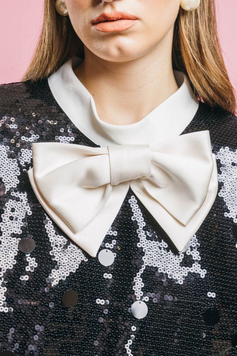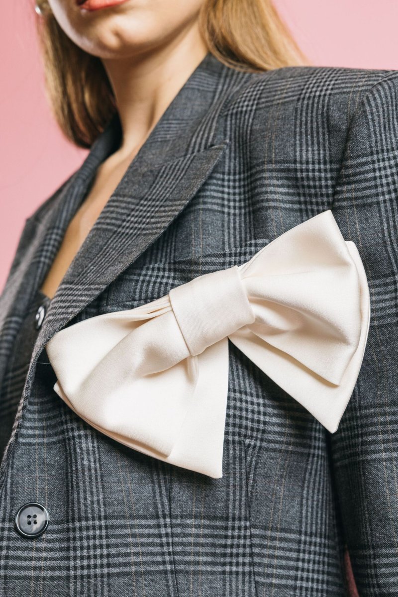 Spilla modello fiocco in raso, dalle linee morbide e luminose, pensata per aggiungere un dettaglio di stile e femminilità a ogni outfit. La sua texture setosa e tonalità ivory, la rendono un accessorio raffinato e versatile: perfetta su abiti, camicie, blazer, cappotti o pullover, diventa un segno distintivo capace di donare eleganza e carattere in ogni occasione.