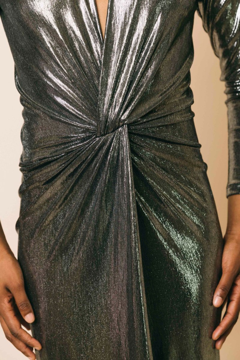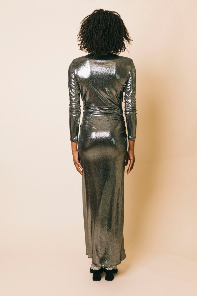 Abito lungo in tessuto elasticizzato effetto metallico, dettaglio spacco centrale, collarino gioiello Misura indossata in foto: 42 Altezza modella: 1.81m