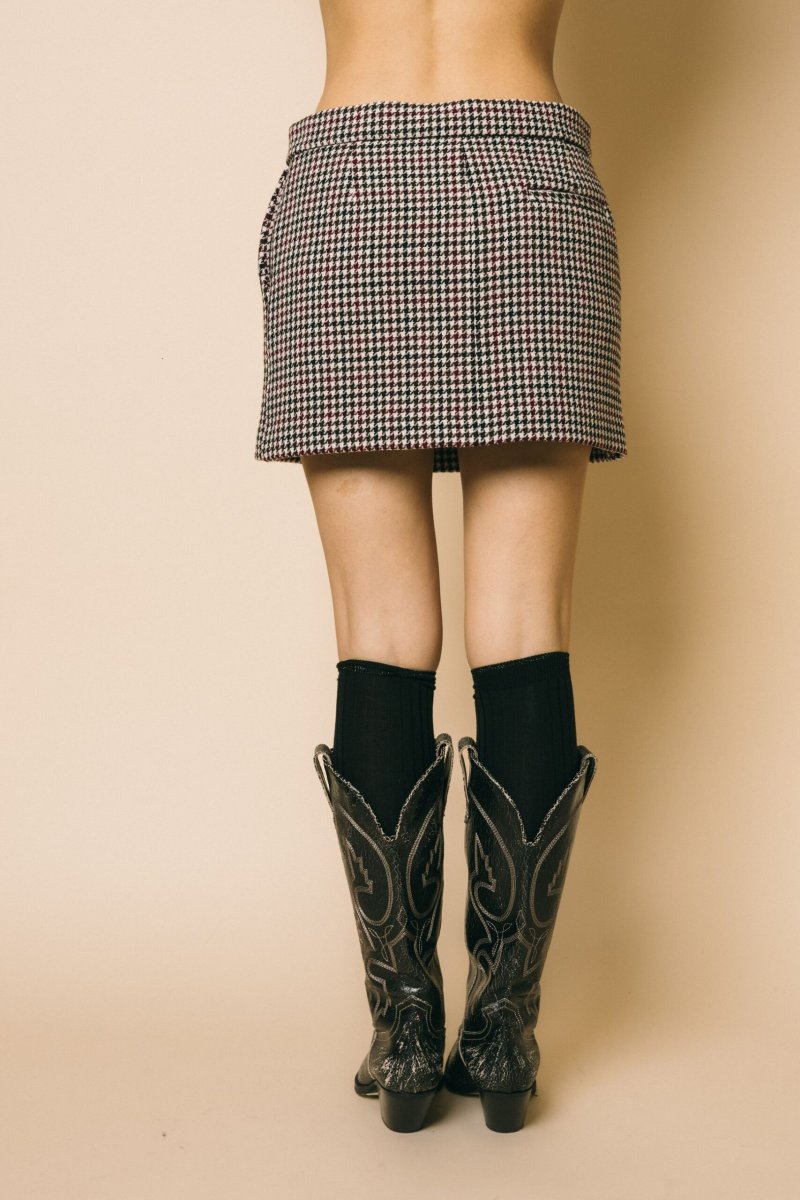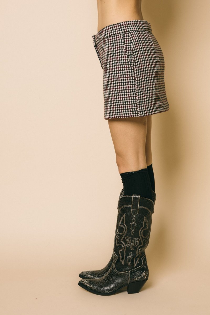 Minigonna in tessuto Pied de Poule, chiusura frontale con bottone e zip per un fit sicuro e comodo, tasche a filetto. Questa minigonna è un capo versatile e raffinato. Il classico design inglese del Pied de poule, arricchito da una palette di colori ,conferisce al capo un aspetto ricco e caldo, ideale per affrontare la stagione con stile. Realizzata in Italia , è un esempio di sartorialità di alta qualità.