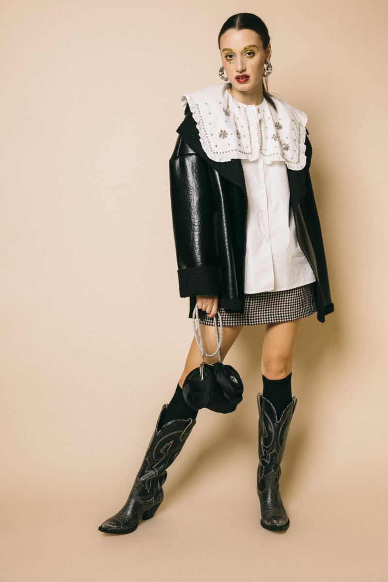Minigonna in tessuto Pied de Poule, chiusura frontale con bottone e zip per un fit sicuro e comodo, tasche a filetto. Questa minigonna è un capo versatile e raffinato. Il classico design inglese del Pied de poule, arricchito da una palette di colori ,conferisce al capo un aspetto ricco e caldo, ideale per affrontare la stagione con stile. Realizzata in Italia , è un esempio di sartorialità di alta qualità. Altezza modella: 1.79 cm Taglia indossata: 40 Tessuto: 68% lana 20% poliammide 7% poliestere 5% altre fibre Made in Italy Lavabile a secco 100% poliestere Altezza modella :1.78 cm Taglia…