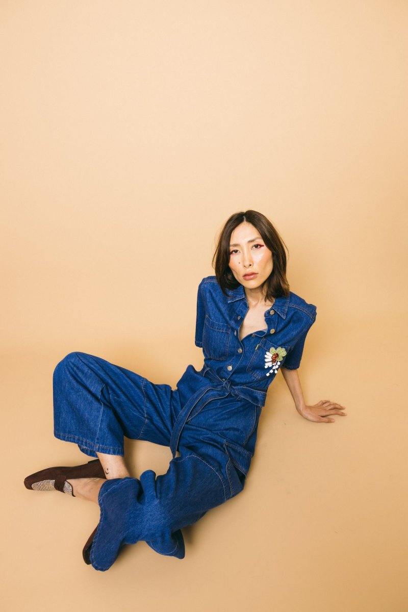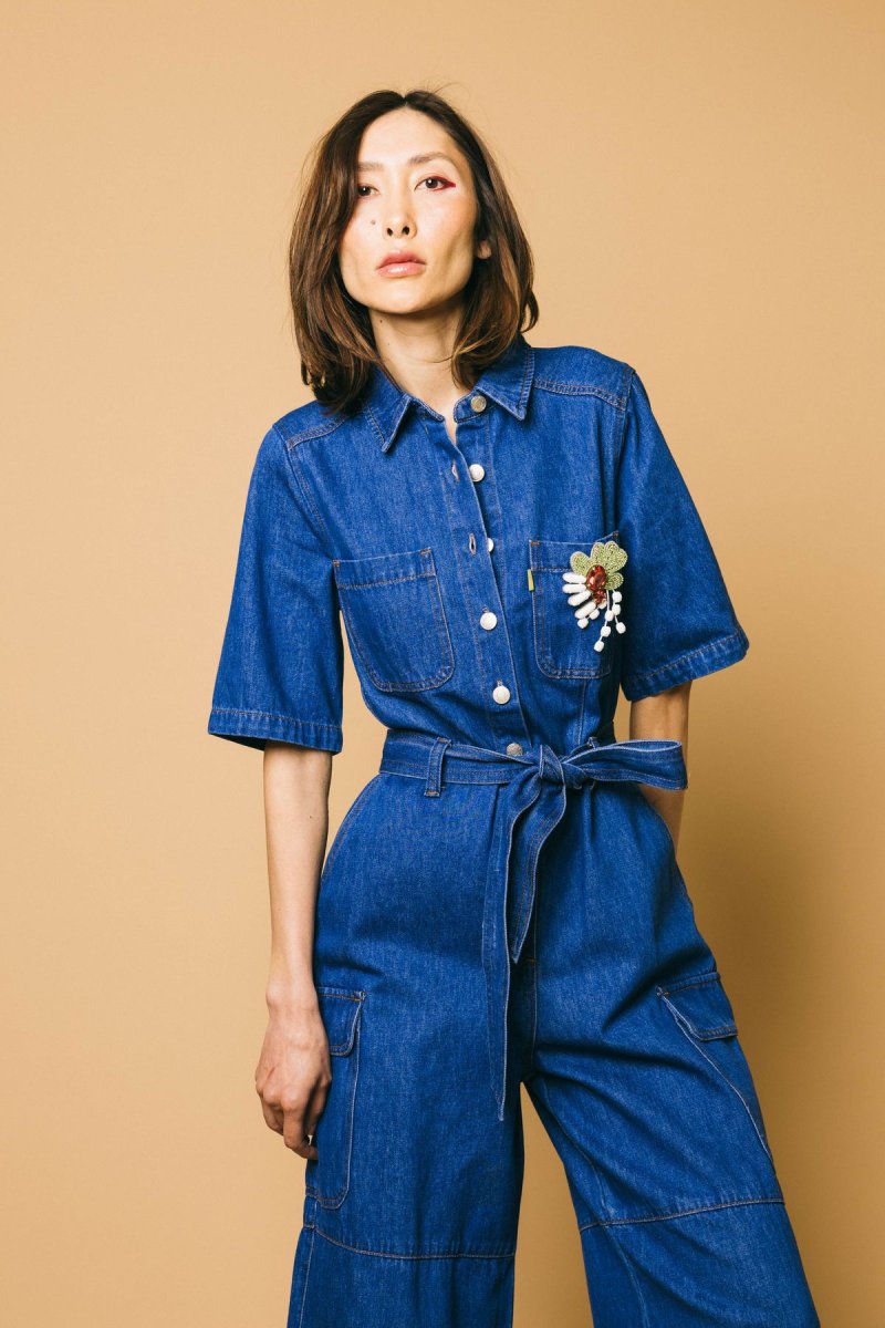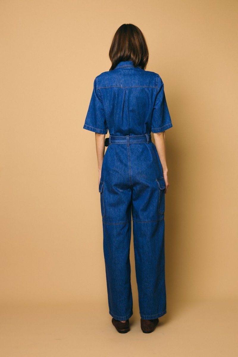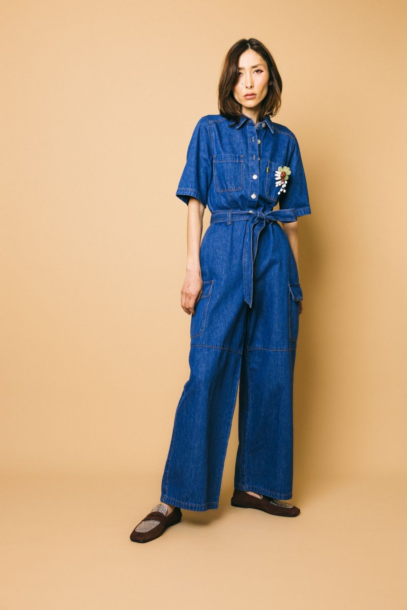 Tuta over in cotone denim con tasconi, cintura da annodare in vita