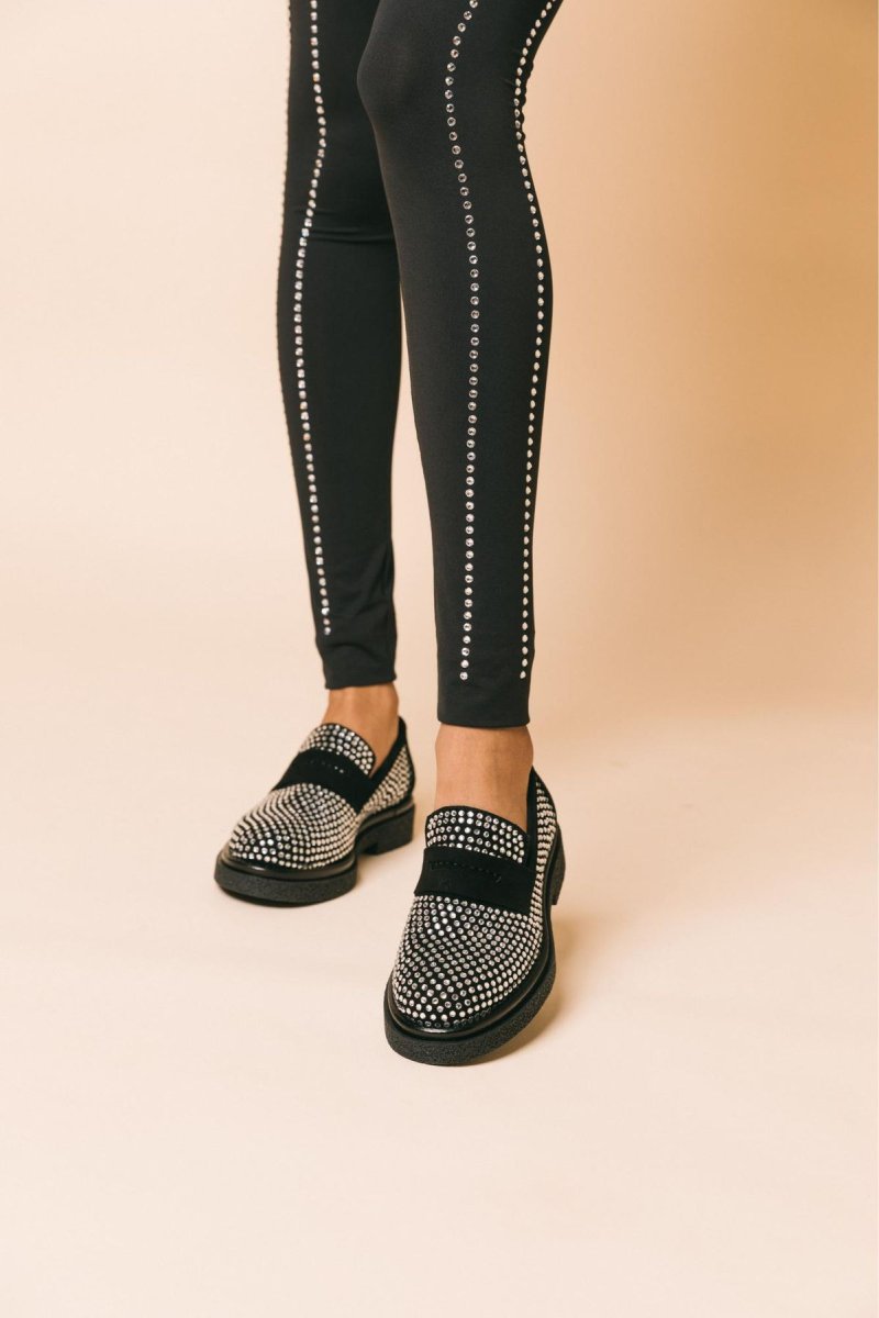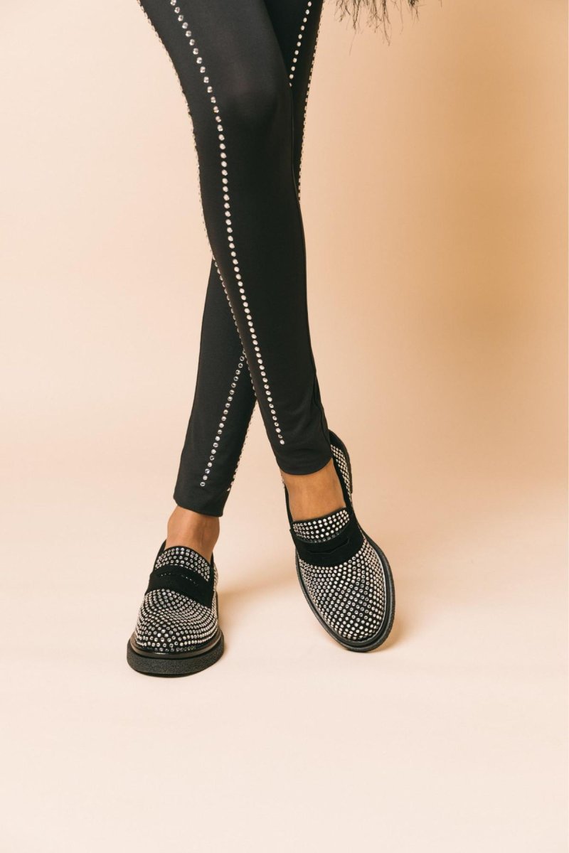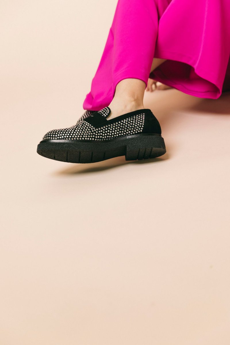 Mocassino in camoscio nero con strass cristallo. Tacco 4 cm