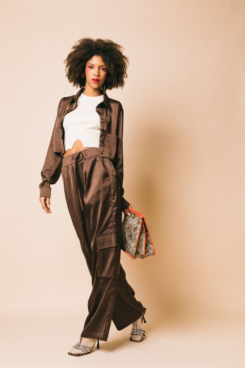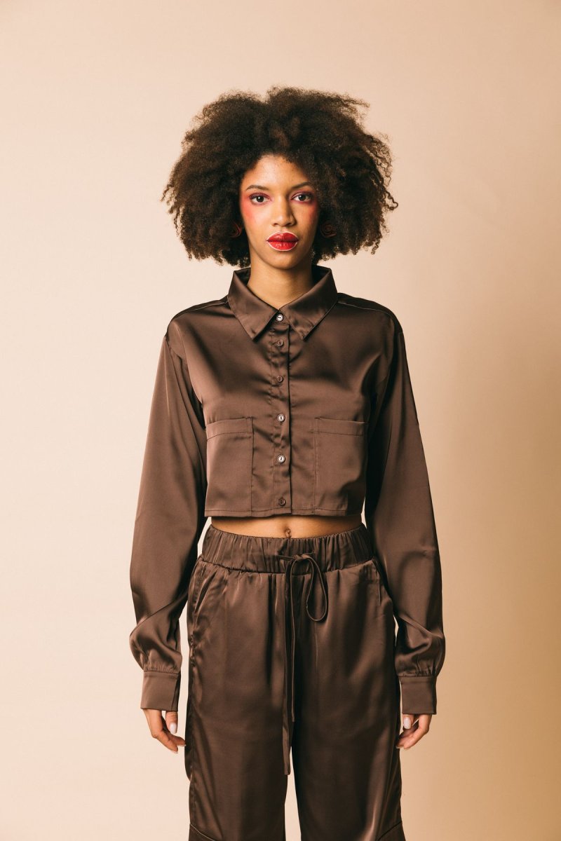 Camicia crop in satin dettaglio tasche sul davanti ,