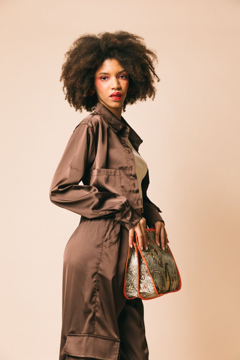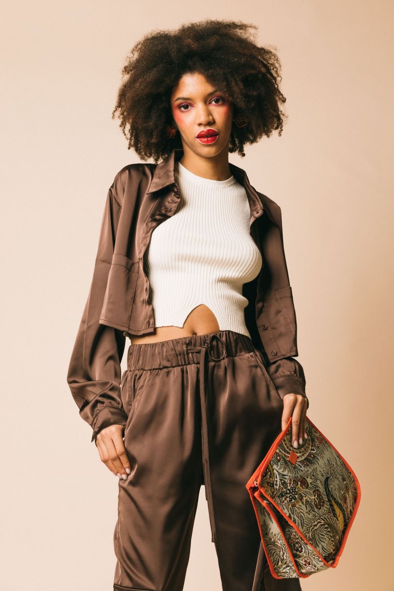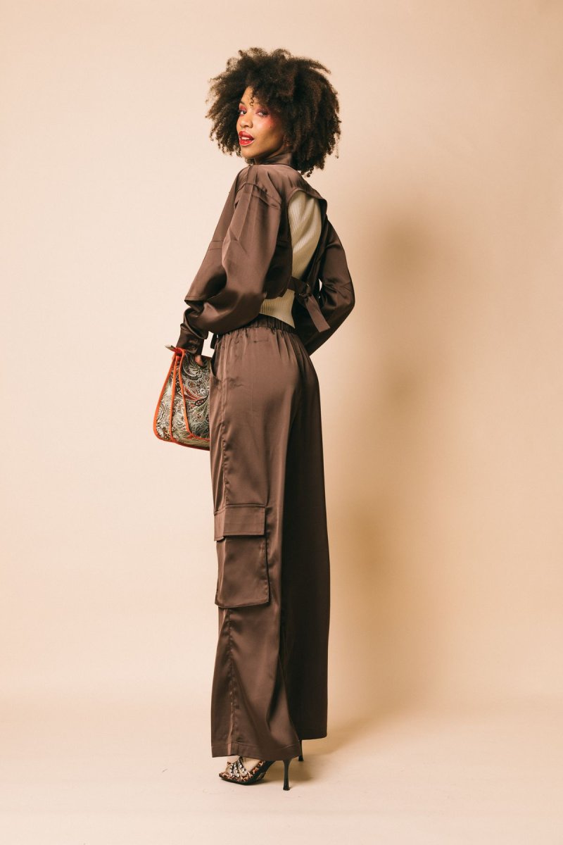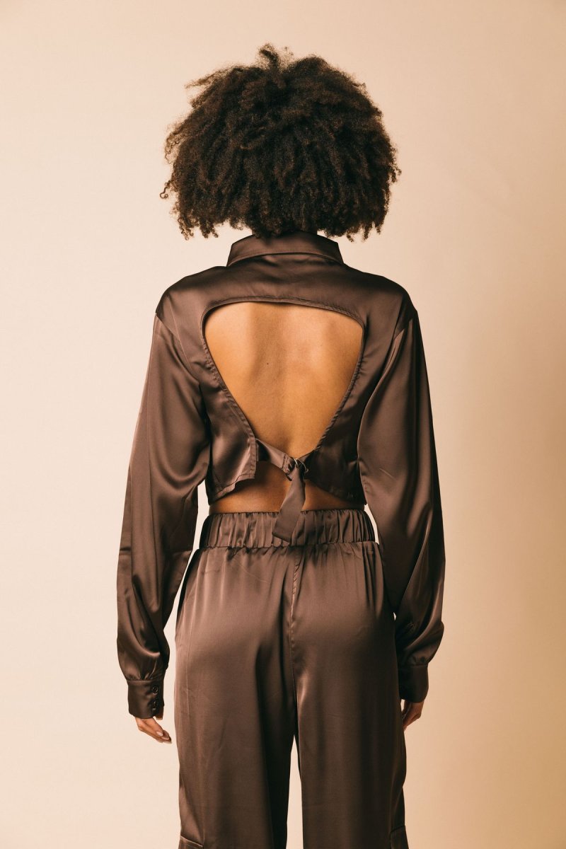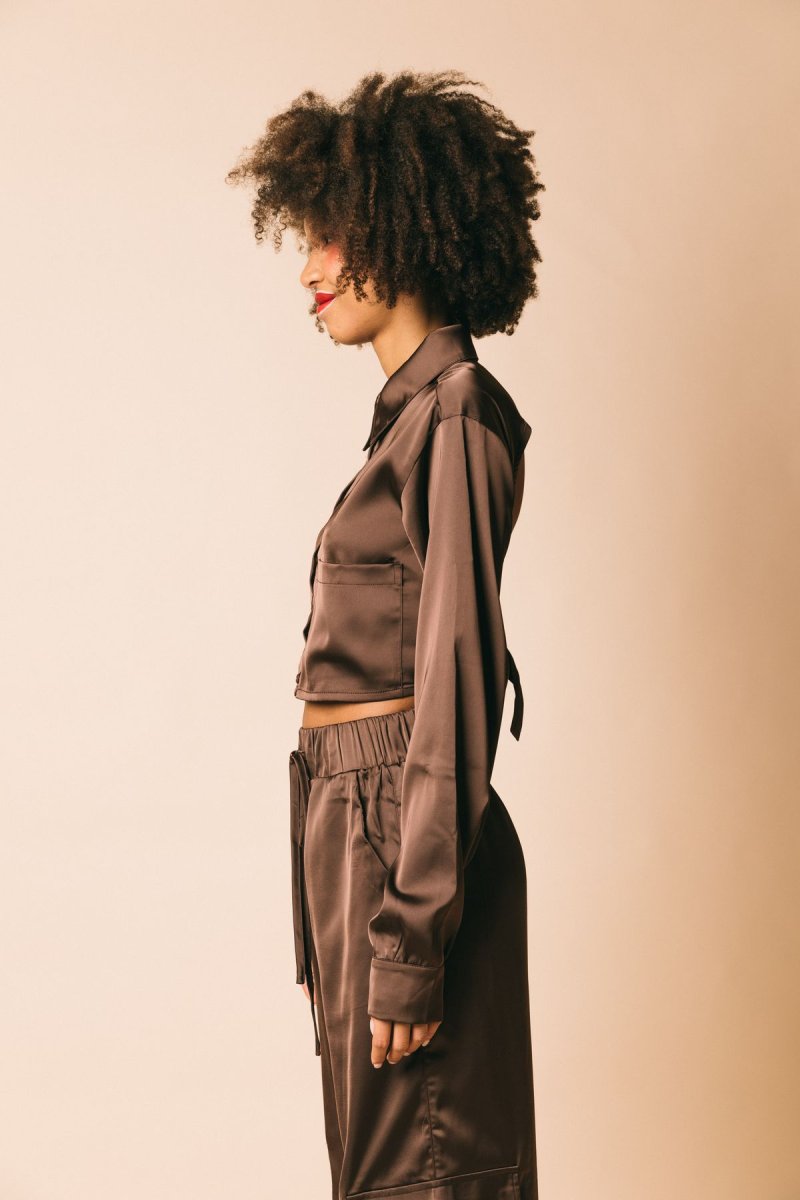 Camicia crop in satin dettaglio tasche sul davanti , apertura dietro la schiena Taglia indossata in foto: XS Altezza modella: 1.76 cm