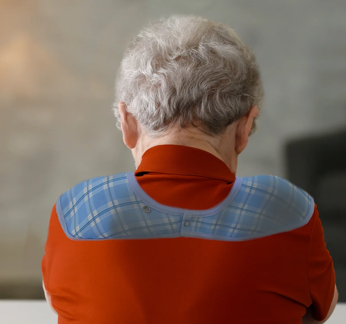BAVAGLIA PER ADULTI realizzata in tessuto antimacchia con fantasia “quadro” con moderata capacità assorbente, accoppiato con struttura laminata costituita da membrana in poliuretano accoppiata su strato in poliestere garzato, tutta bordata con sbieco in tinta, in poliestere, con chiusura a bottoni automatici inox e regolazione al girocollo a due posizioni.