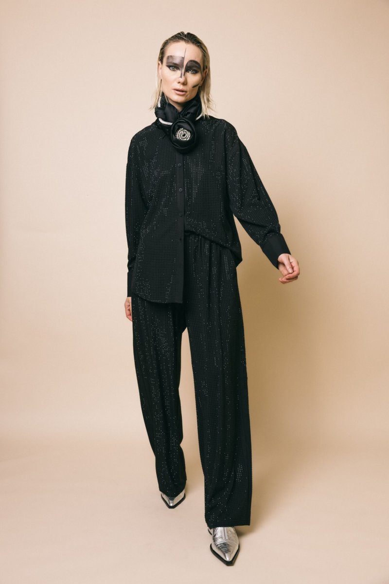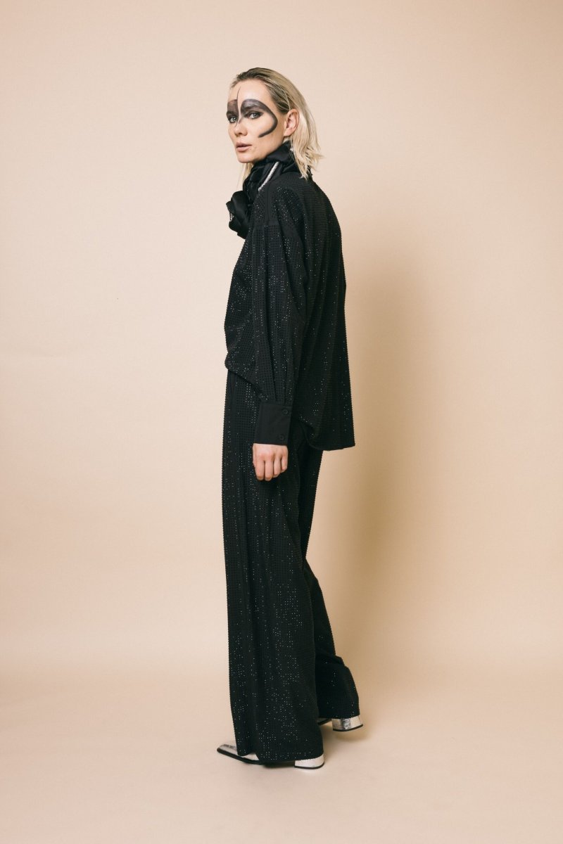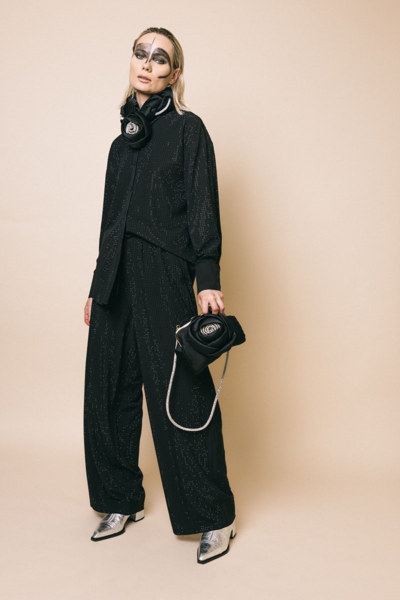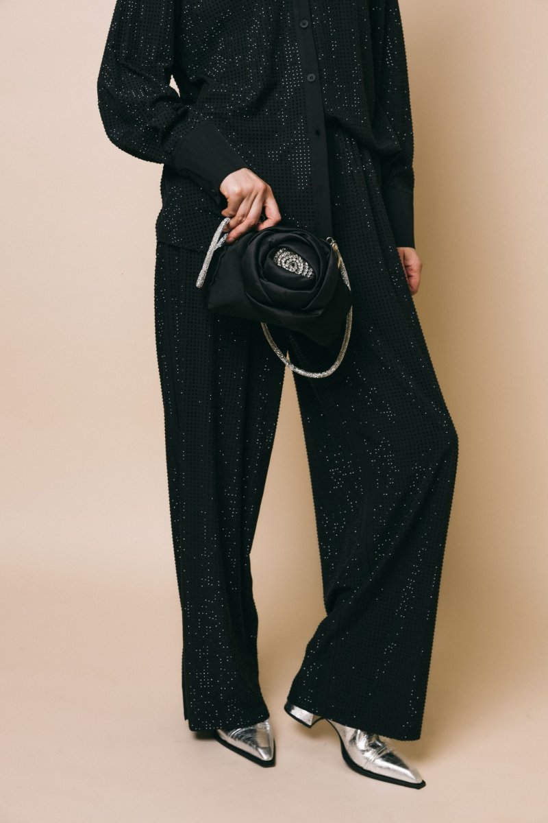 Pantalone palazzo tempestato di strass tono su tono con coulisse in vita